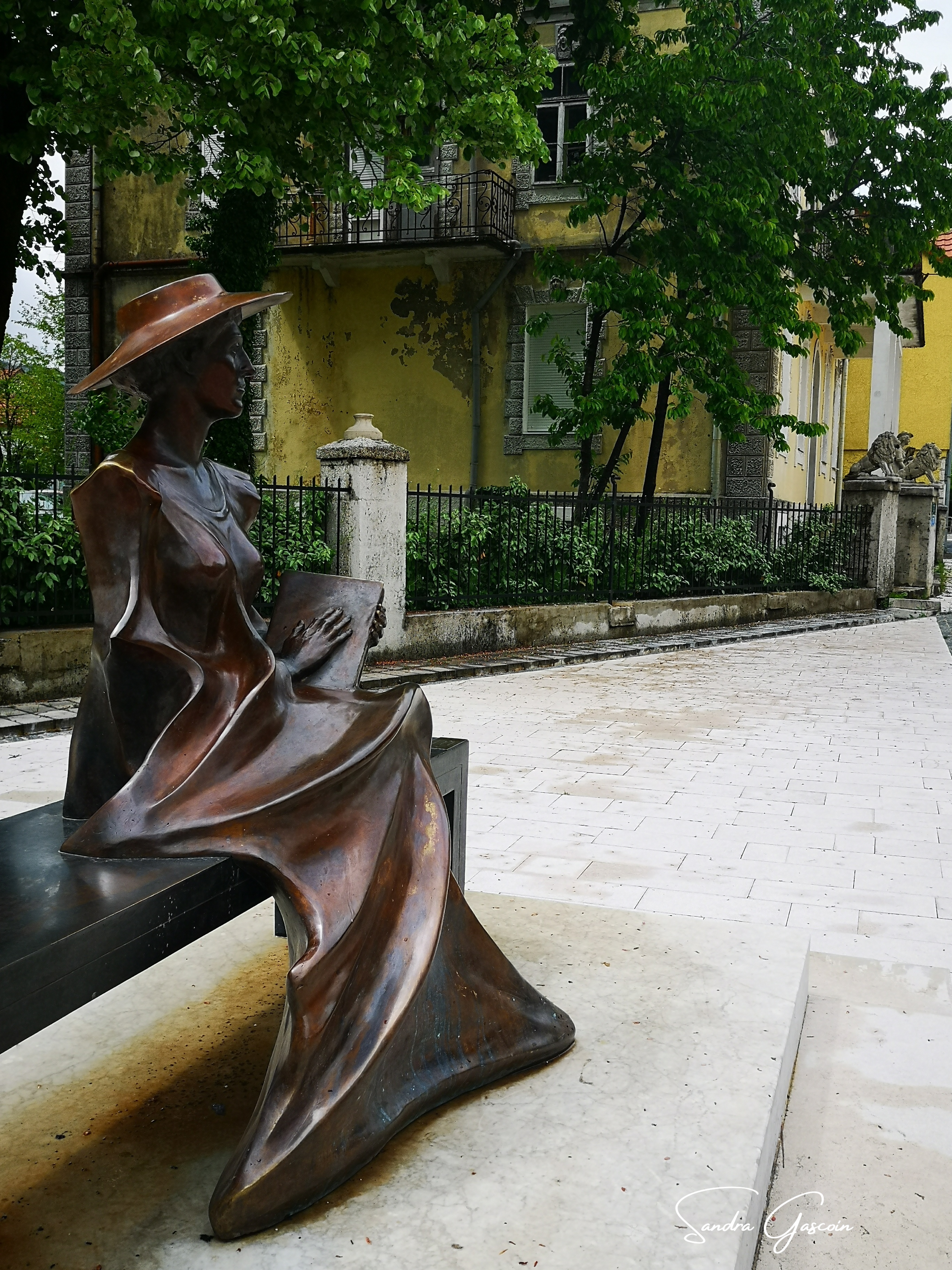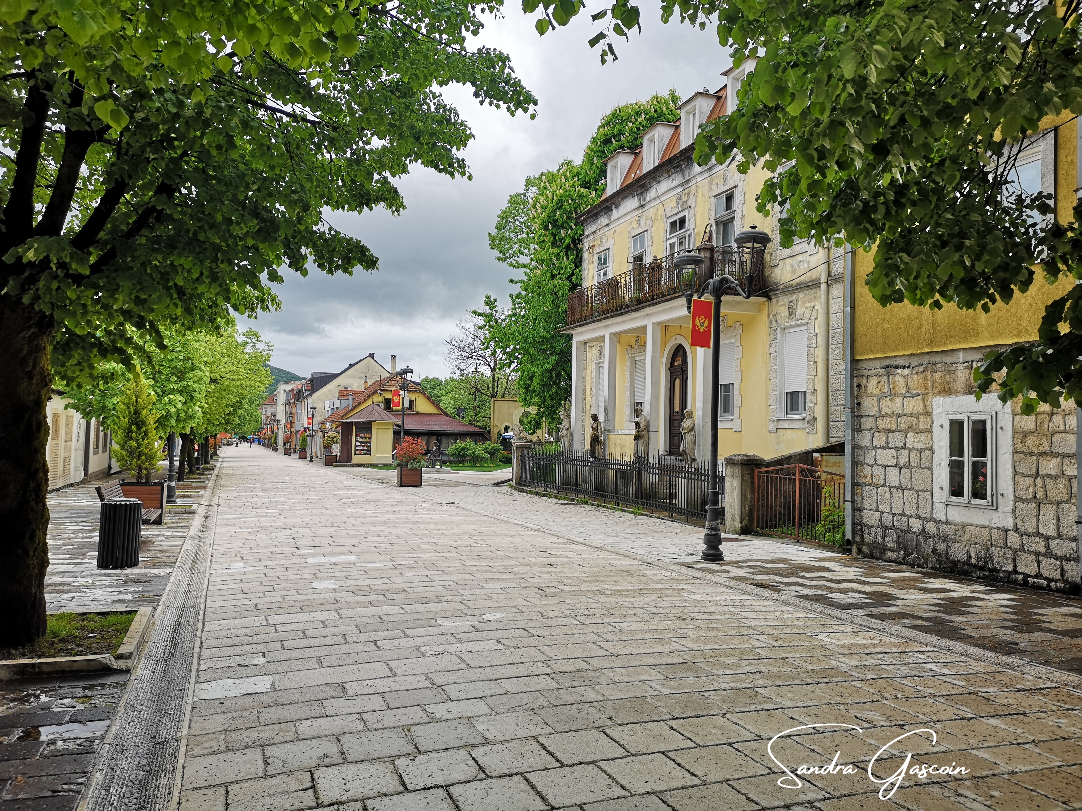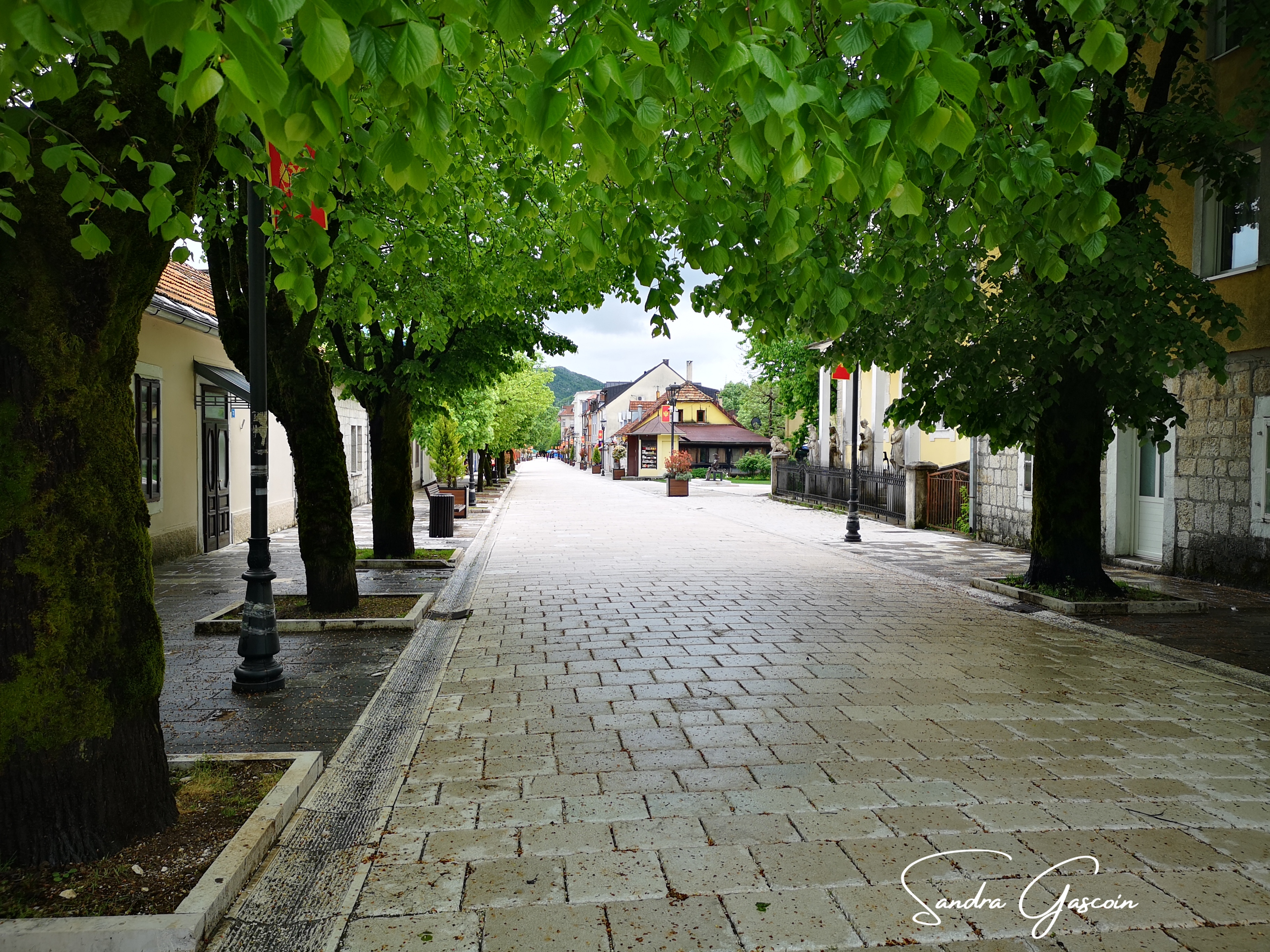 Sur les coups de dix heures, je retourne à mon hébergement pour ranger mon sac. Aucun membre du personnel n’est présent, aussi je laisse la clé dans la serrure et m’éclipse discrètement, presque comme une voleuse. À la gare routière, j’achète mon billet pour le bus qui part quelques minutes plus tard, en direction de ce qui fut jadis la capitale du Monténégro, jusqu’en 1918. Cetinje, une petite bourgade de quelques quinze mille habitants, n’est pas plus épargnée par la météo capricieuse. Au sortir de la gare, je me dirige tout de suite vers un « hostel ». J’ai un mal fou à le trouver: aucun panneau, aucune enseigne sur la fassade, on y accède depuis le boulevard par une ruelle qui n’est pas indiquée sur le site internet. Je commence à m’habituer à ce genre de jeu de piste J’ouvre le portail, trouve la porte d’entrée dans la cour intérieure, frappe, ouvre la porte et entre dans le hall d’entrée de la maison. Il n’y a personne. Je ne sais pas très bien quoi faire. Je n’ai pas de connexion, je ne peux pas téléphoner. Je repars donc en ville, peut-être trouverai-je là-bas un réseau.