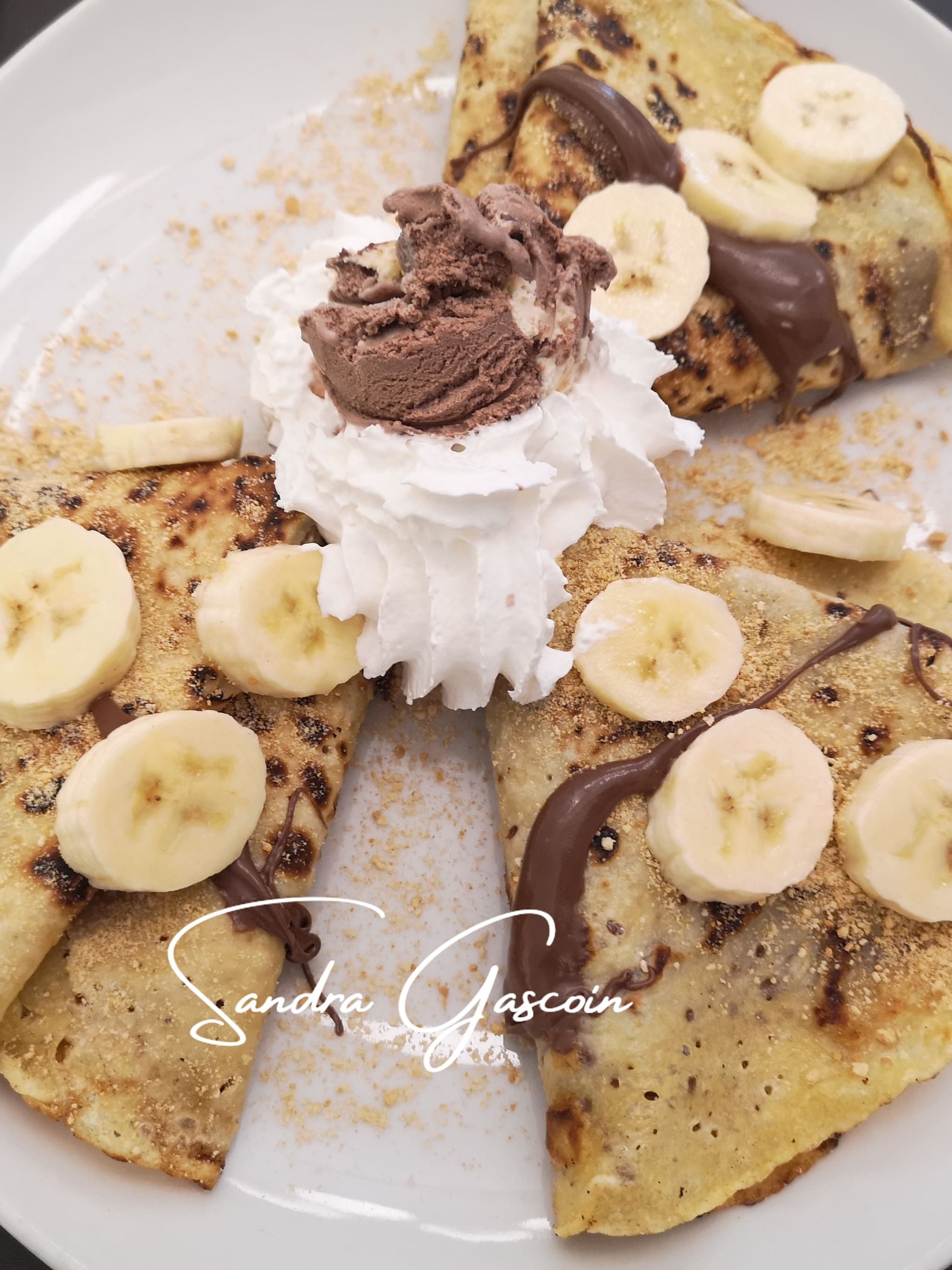 Après avoir arpenté le centre-ville, je décide de m’installer dans un restaurant à l’intérieur plutôt qu’en terrasse, afin de m’abriter du froid. La crêpe au chocolat me tente irrésistiblement. Le serveur m’apporte une assiette composée de trois crêpes copieuses, garnies de rondelles de banane, de Nutella (ce qui, pour être honnête, ne ressemble en rien à du chocolat), de glace au chocolat et de crème chantilly. Voilà qui constituera aussi mon repas du soir !