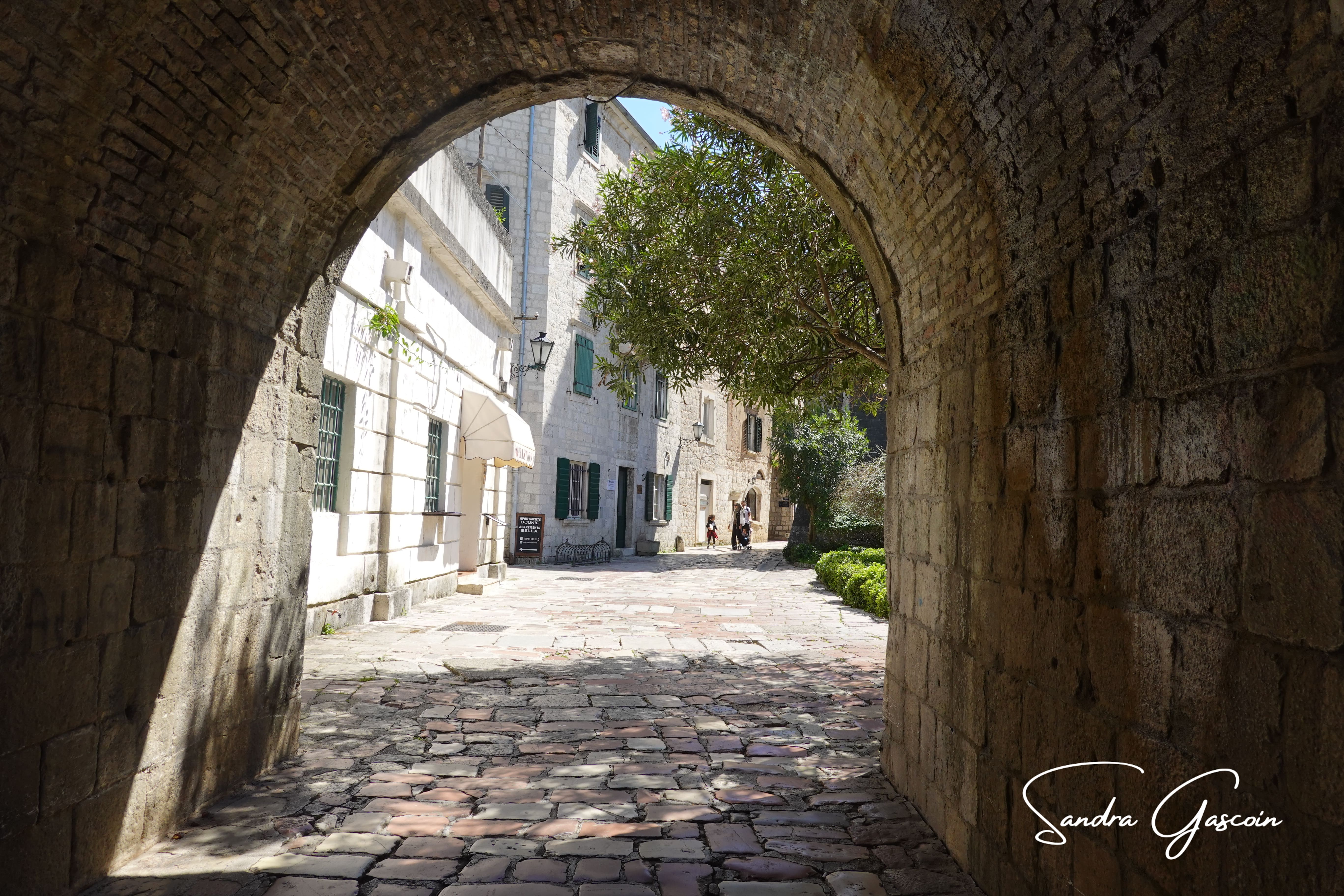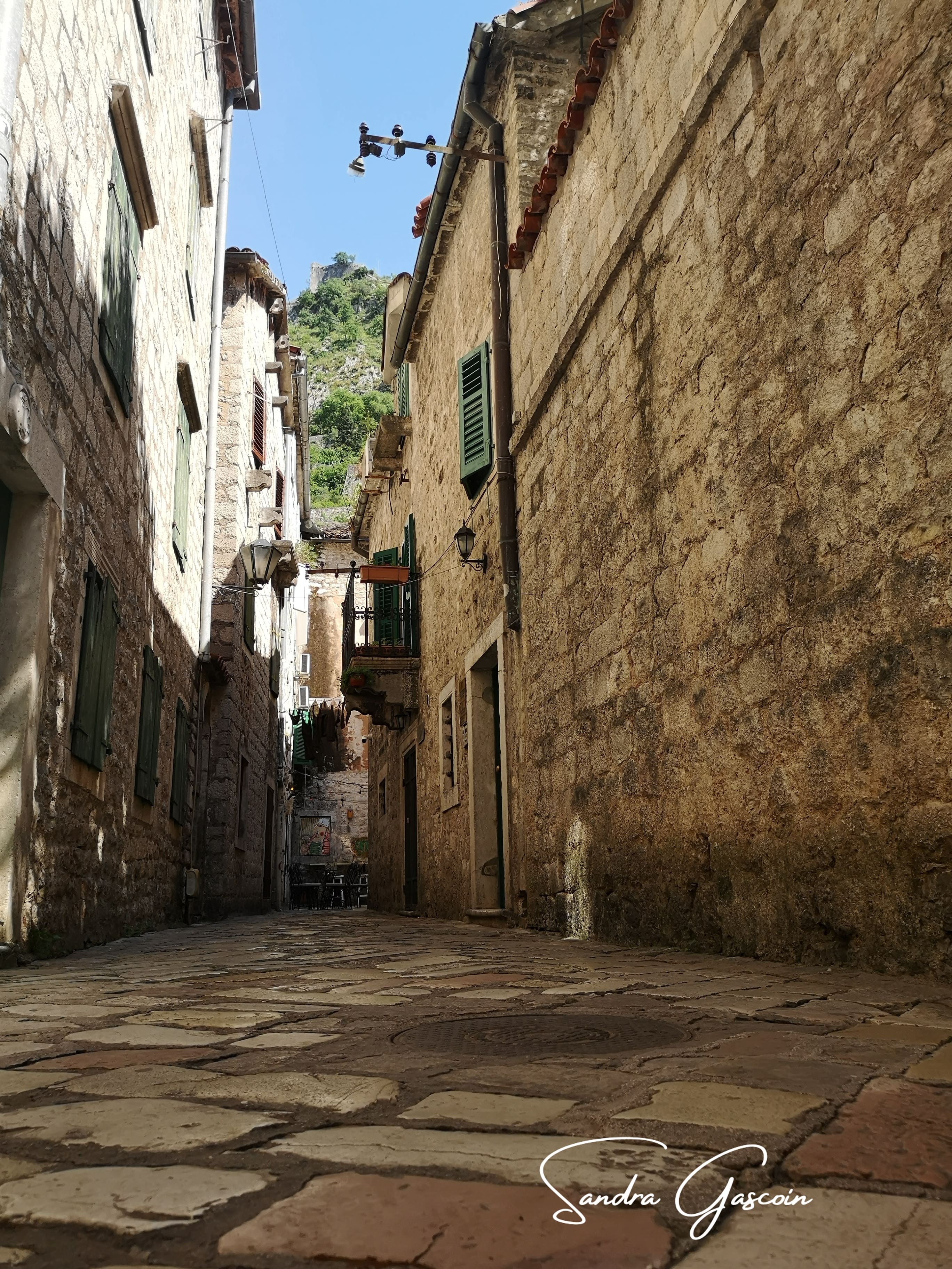 Je ne veux pas abuser ou ennuyer mes hôtes, je leur demande si je peux laisser mon gros sac chez eux pendant que je vais visiter Kotor. Ils me proposent même de m’y emmener en voiture, c’est encore à quelques kilomètres. Parée de conseils pour la visite, je prépare rapidement quelques effets et passe aux toilettes. Il fait déjà très chaud. La ville est assiégée par les touristes agglutinés autour de leur guide. Je découvre une cité entourée par une muraille imposante longue de plus de quatre kilomètres, et surplombée par le bastion Saint-Jean 250 mètres plus haut. Kotor, la ville la plus ancienne du Monténégro, fondée par les Romains, a connu l’influence et la domination vénitienne pendant trois siècles. Je déambule sans but précis dans des ruelles étroites, pavées de pierre blanche, inextricables, cherchant partout un petit coin de calme. Kotor me rappelle Dubrovnik, la perle de l’Adriatique. Il me semble qu’ici c’est encore plus joli, bien que mon souvenir de la cité croate remonte à l’aube du 21ème siècle. Je suis toujours réservée quant il s’agit de visiter des villes touristiques: il me semble qu’elles perdent toute âme dès lors que le lieu est reconnu et admiré pour son architecture etc… devenant des musées figés sans vie. Les habitants se renferment derrière leurs volets, leurs portes, leurs murs.