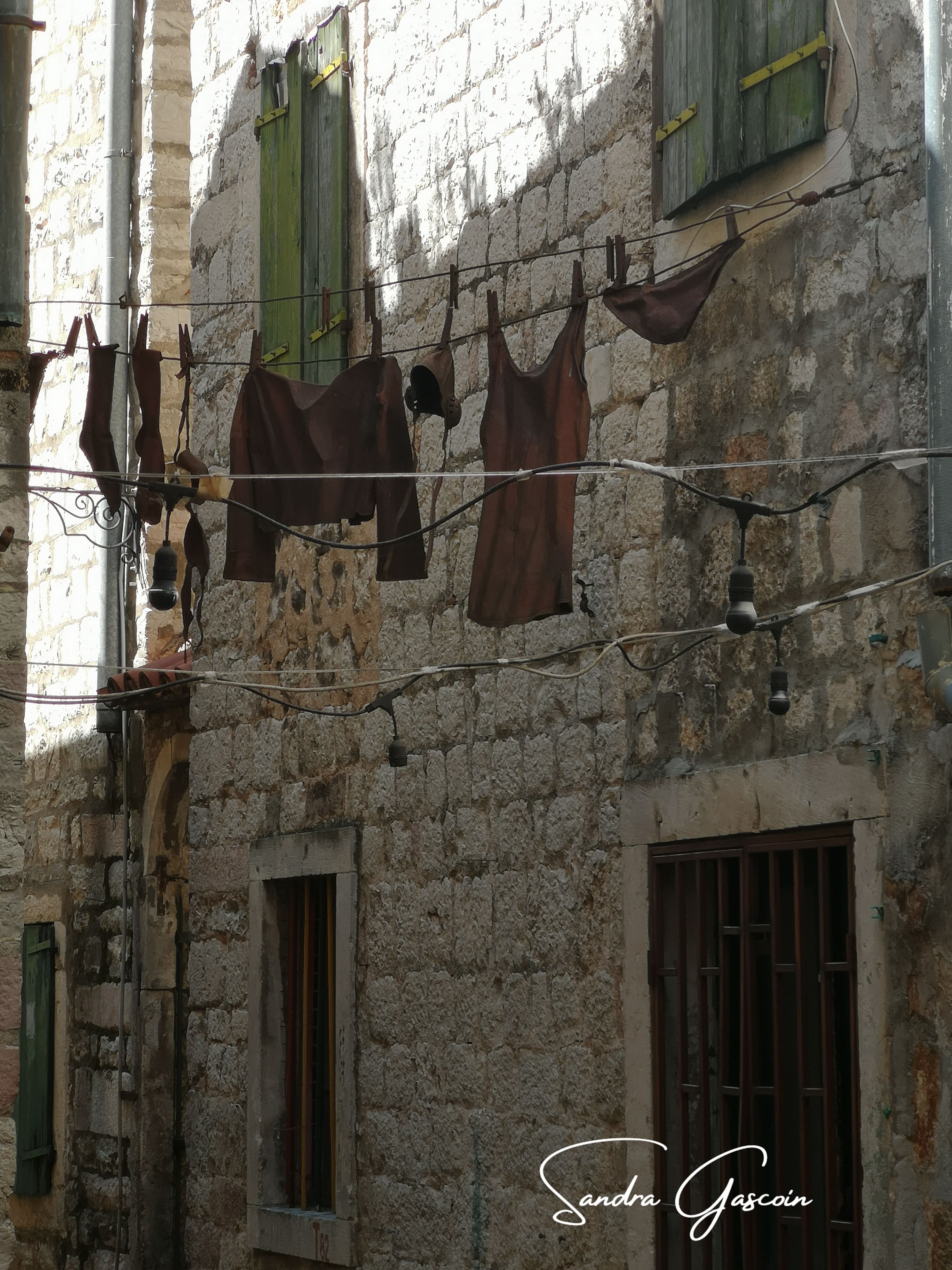 Marina m’avait conseillé de monter à la forteresse par les remparts: le prix d’entrée (15 euros) n’est pas compatible avec mon souci de l’économie. Je décide donc d’emprunter plutót le fameux sentier que j’aurai dû prendre ce matin pour descendre. Délivrée de mon sac à dos, je prends d’assaut les presque 300 mètres de dénivelés positif qui serpentent derrière les fortifications. J’arrive à une petite chapelle à l’abandon (église Saint Georges). Je distingue un sentier qui mène aux remparts. Je l’avais vu sur mon application de rando. Le hic? Il n’y a pas d’entrée. Par contre le symbole caractéristique (rond blanc entouré d’un cercle rouge) pour les chemins de randonnée est bien visible sur la muraille. J’observe une scène fort intéressante pour moi: des touristes aussi économes que moi escaladent le rempart pour atteindre une ouverture et pénètrent ainsi dans l’enceinte. Je m’approche et je tente ma chance aussi. Un gars m’aide en me retenant par les bras alors que je prends appui sur une chaise pliante (repliée) plaquée contre le mur. C’est super dangereux mais bon, ça passe. Je suis donc dans la partie supérieure des fortifications. Au-dessus de moi le bastion en ruine.