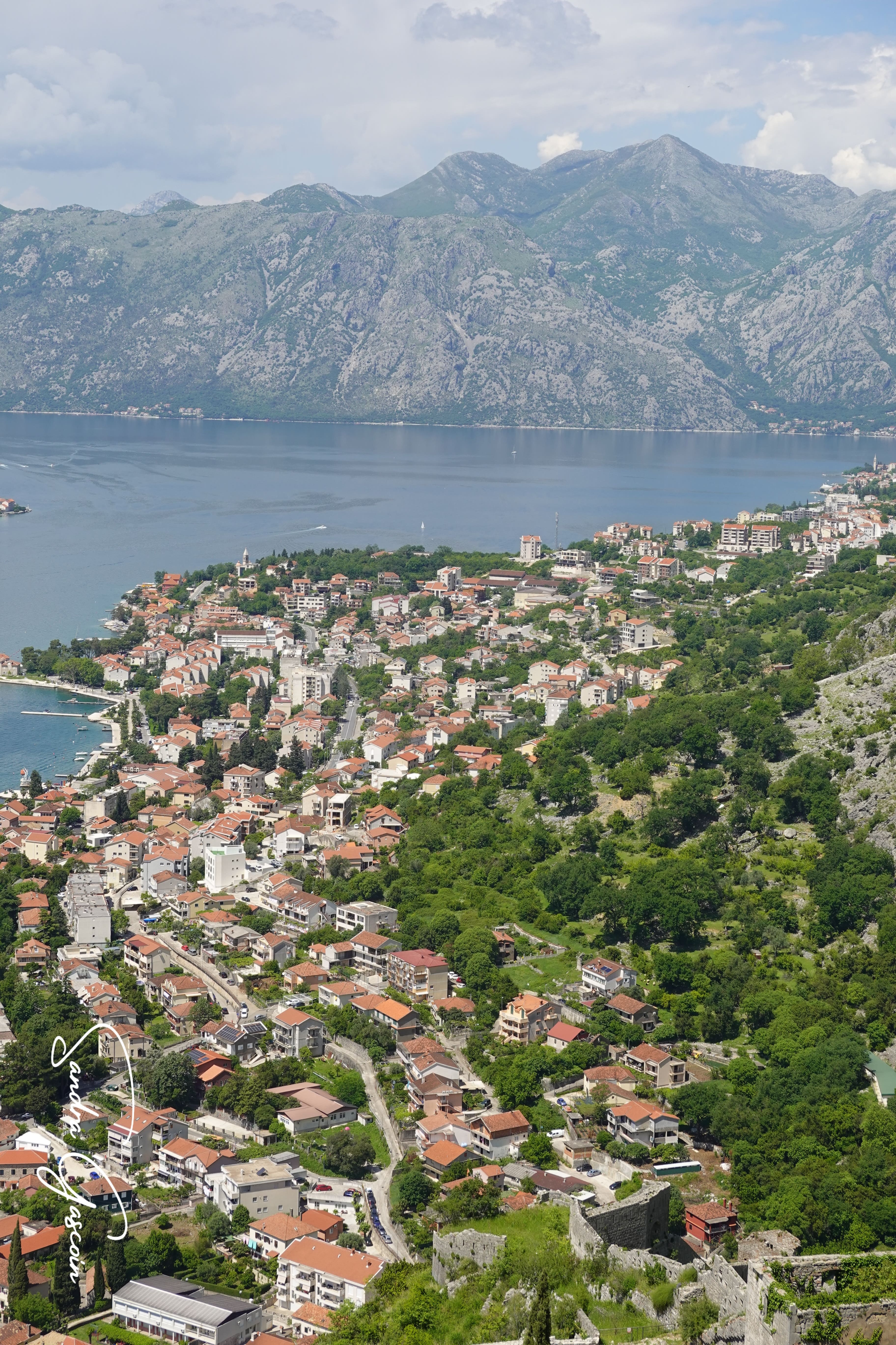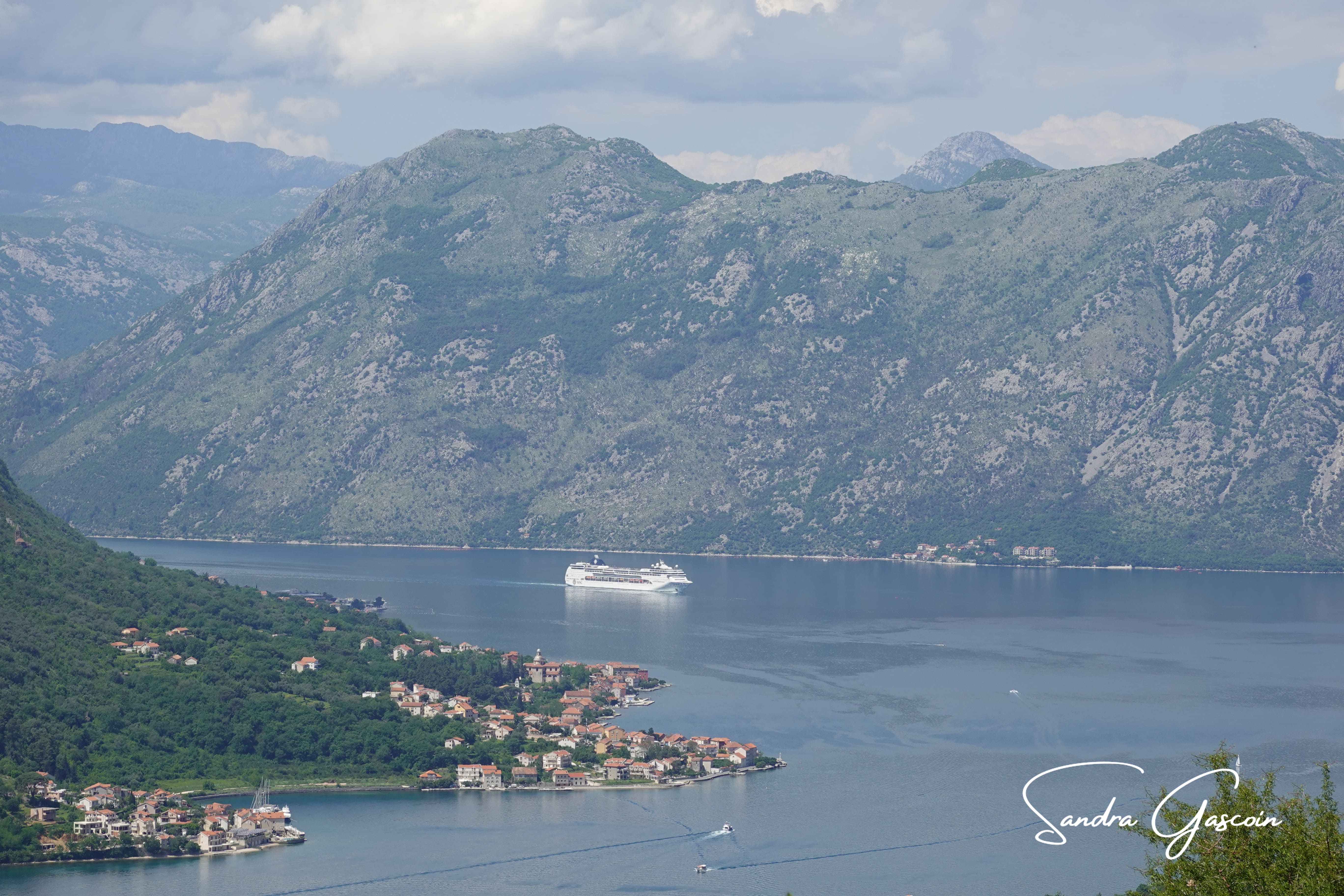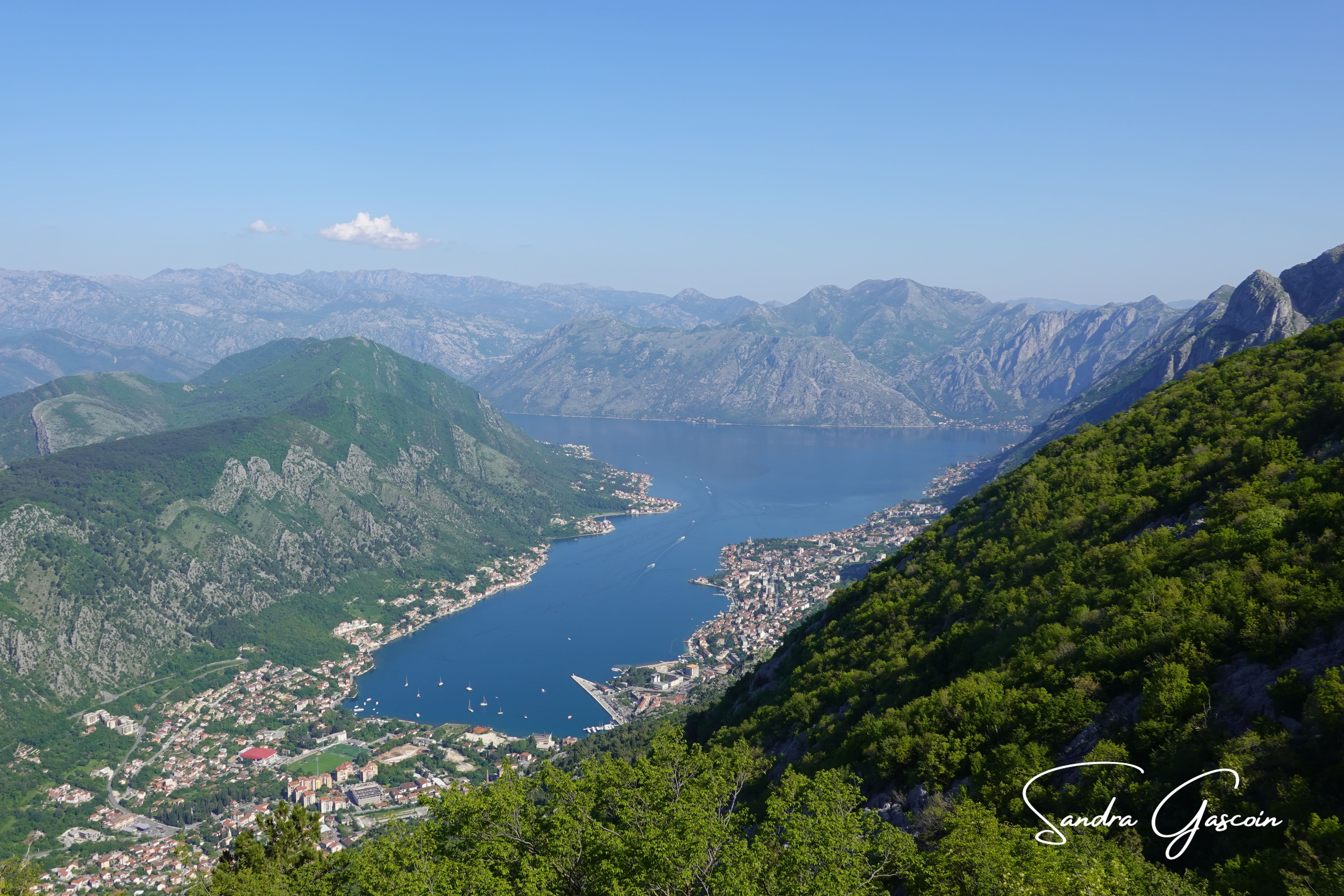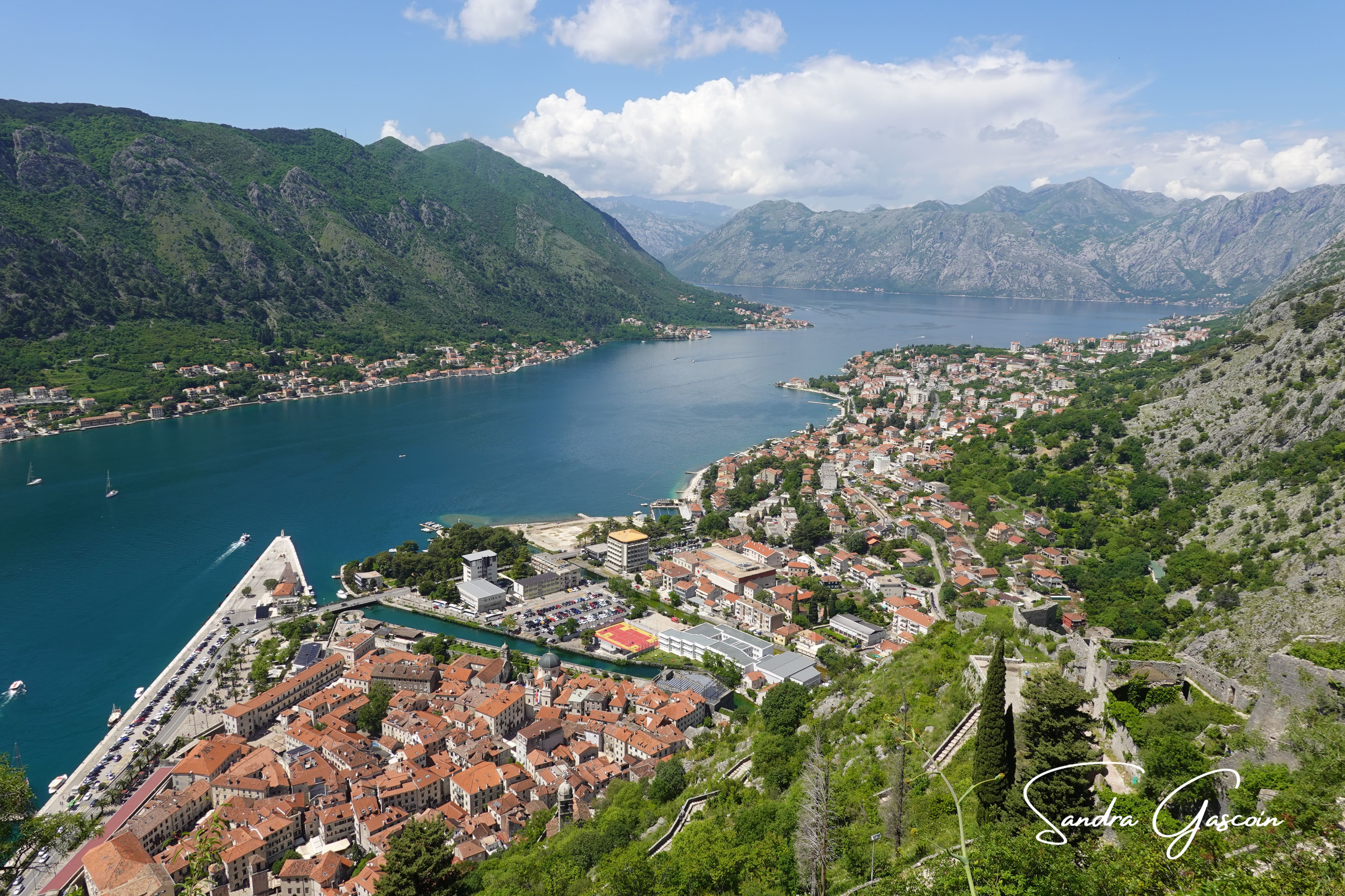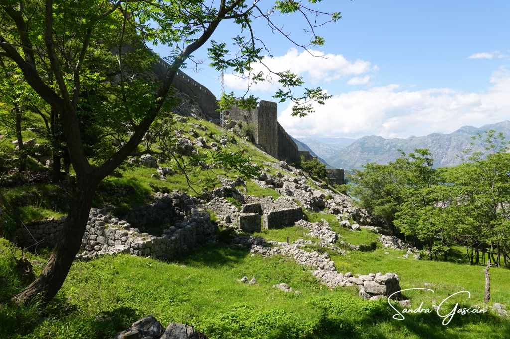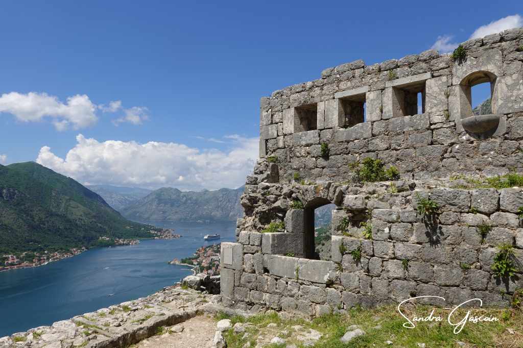La vue est imprenable depuis le bastion. La baie de Kotor s’étend entre les chaines montagneuses que je vais suivre dans les prochains jours. Un navire de croisière s’avance lentement jusqu’au petit port pour déverser sa horde de touristes. Je redescends vers mon accès secret: j’ai un peu peur de tenter la sortie seule. Je vois passer un couple français. Je demande de l’aide au monsieur qui hallucine assez face à ma demande. J’escalade le mur sous le silence réprobateur de la femme. Je pose pied à terre et remercie chaleureusement mon sauveur. Je ne pouvais pas sortir par une sortie officielle, on m’aurait demandé de m’acquitter du prix de l’entrée pour passer le portillon. C’est ce que j’avais observé auparavant.