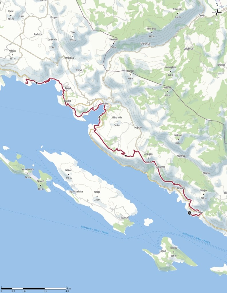 Après quatre heures de marche et 19 kilomètres parcourus, j’atteins Slano juste à temps pour espérer un ravitaillement à la boulangerie et à la supérette. Mais, contre toute attente, les horaires indiqués sur internet étaient erronés : les commerces ont déjà fermé leurs portes. Résolue à ne pas repartir bredouille, je poursuis mon exploration de la localité et tombe avec soulagement sur un Studenac encore ouvert. J’y achète quelques provisions : deux tomates, deux poivrons, un concombre, un smoothie et un jus de fruits pour refaire le plein de vitamines. Sans tarder, je me désaltère afin d’éviter de porter un poids inutile. Avant de reprendre ma route, je me rends dans un restaurant pour demander de l’eau, la fontaine publique sur laquelle je comptais étant malheureusement à sec.
