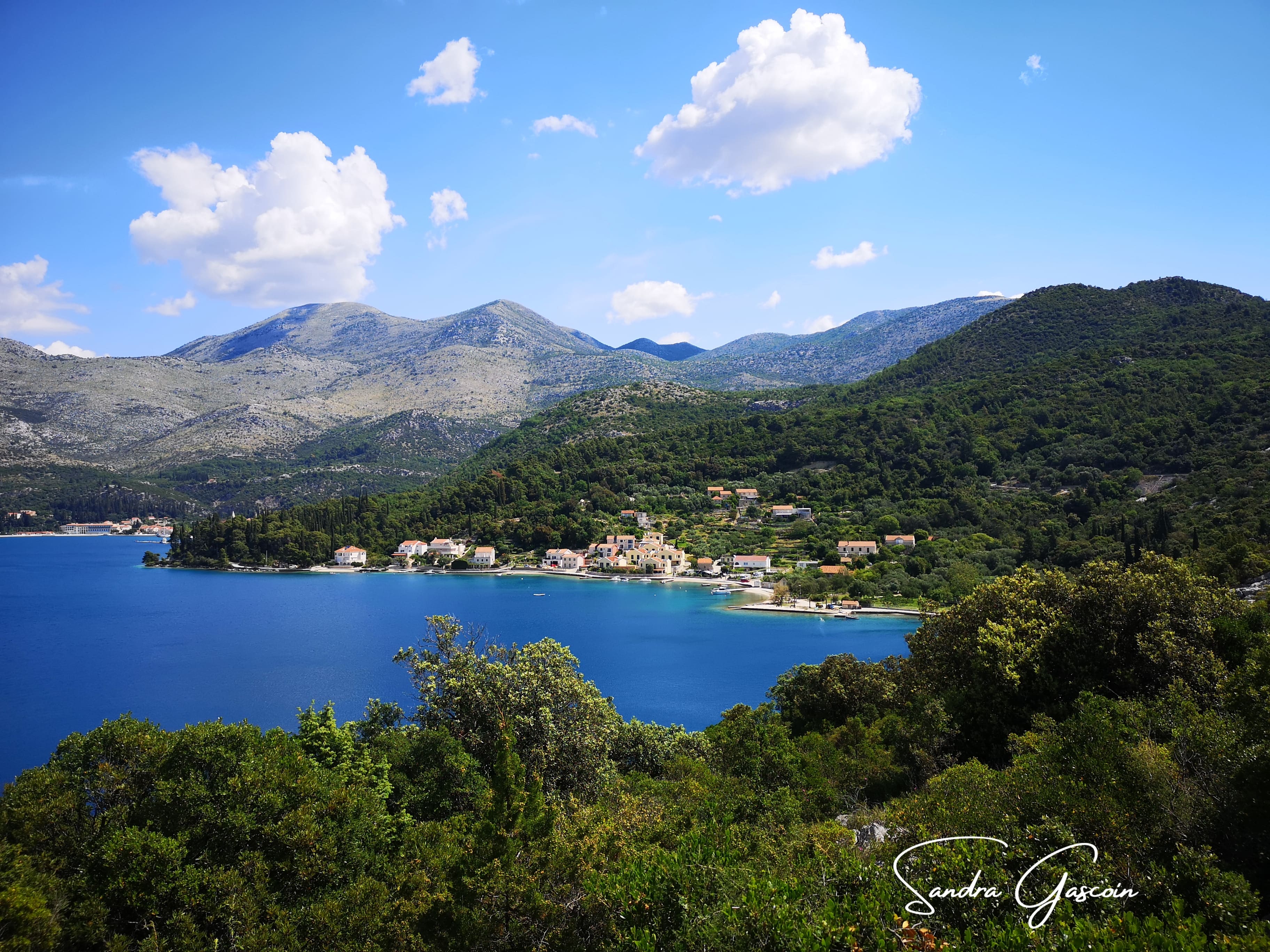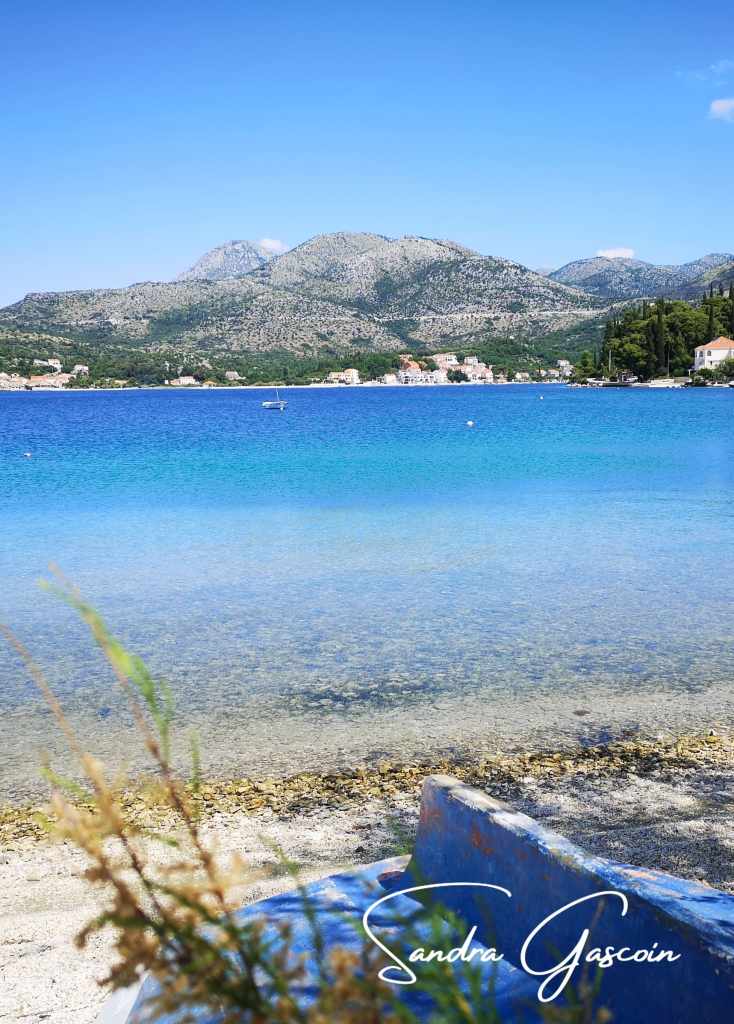 Je quitte l’agitation de Slano et marche encore un peu à la recherche d’un coin ombragé et tranquille en bord de mer. Un kilomètre et demi plus loin, je découvre un parc public sous les arbres. Le vent souffle, et je me vois contrainte d’enfiler ma polaire car j’ai froid. La plage de galets, dépourvue d’ombre, est quant à elle bien trop exposée au soleil. L’endroit est encore désert, et le restaurant voisin n’a pas encore ouvert ses portes. Profitant de l’occasion, et avec le toupet qui me caractérise, je branche discrètement ma batterie externe à une prise dans la cour du restaurant. Elle aura le temps de se recharger pendant que je pique-nique et me repose, sans que personne n’y trouve rien à redire. Je me régale de tomates avec salade de thon et pain. La digestion se fait sur la plage, je fais une petite sieste à moitié au soleil. Puis je me replonge dans ma lecture, parfois au soleil, parfois à l’ombre.