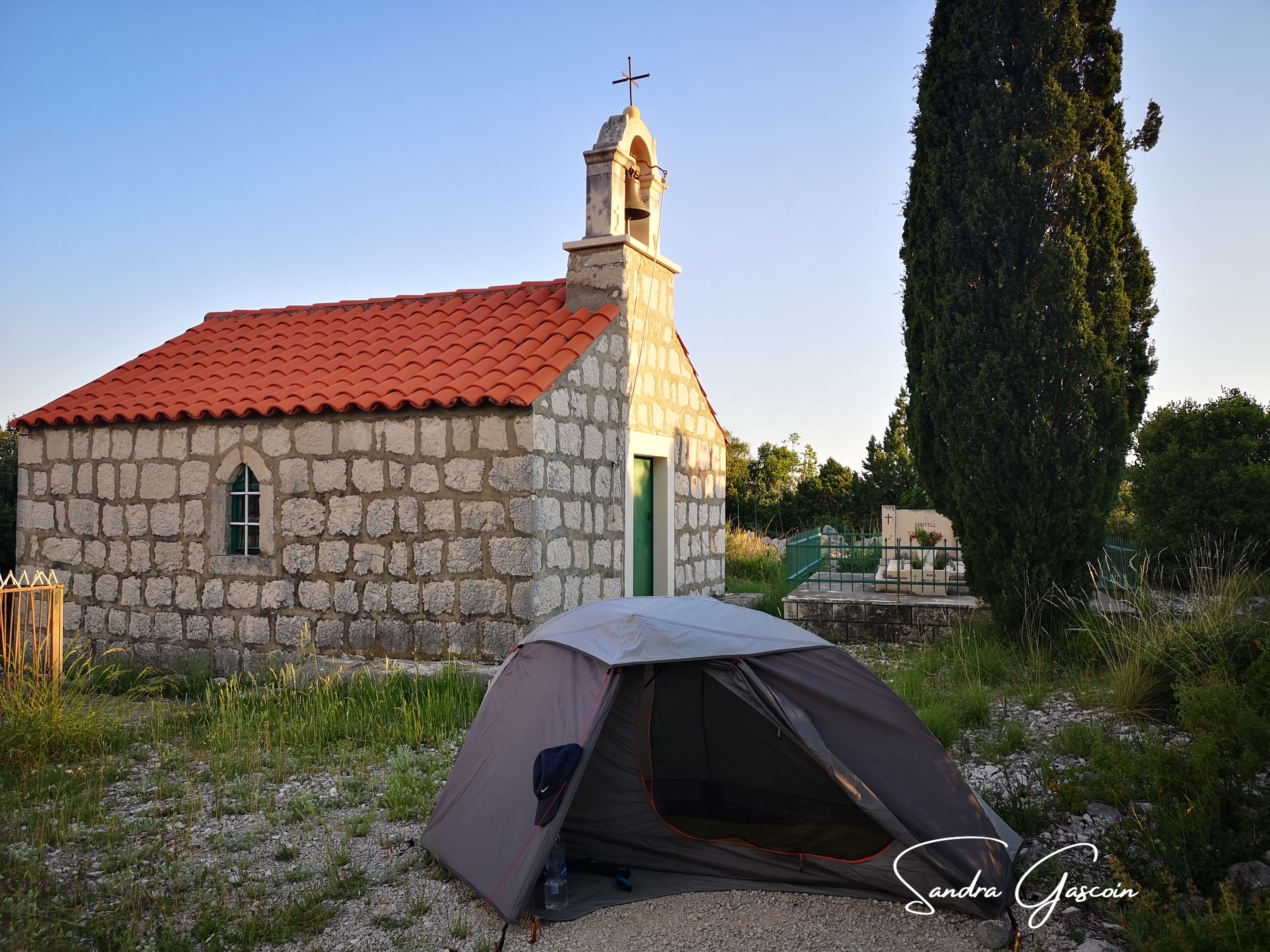Il est déjà 18h30, et la fatigue me gagne. À court d’options, je rebrousse chemin vers la chapelle et décide d’y installer mon campement. L’endroit, bien qu’à quelques centaines de mètres des habitations, semble suffisamment isolé pour que personne ne vienne s’y aventurer ce soir. Je mange mon sandwich à l’abri de ma tente et, après près de 30 kilomètres de marche, m’endors rapidement, bercée par le bruit lointain des voitures et des camions.