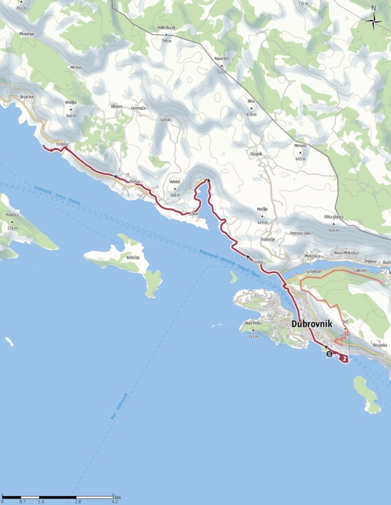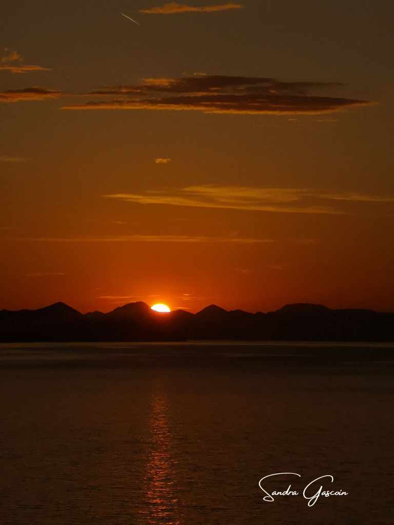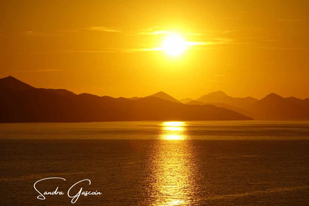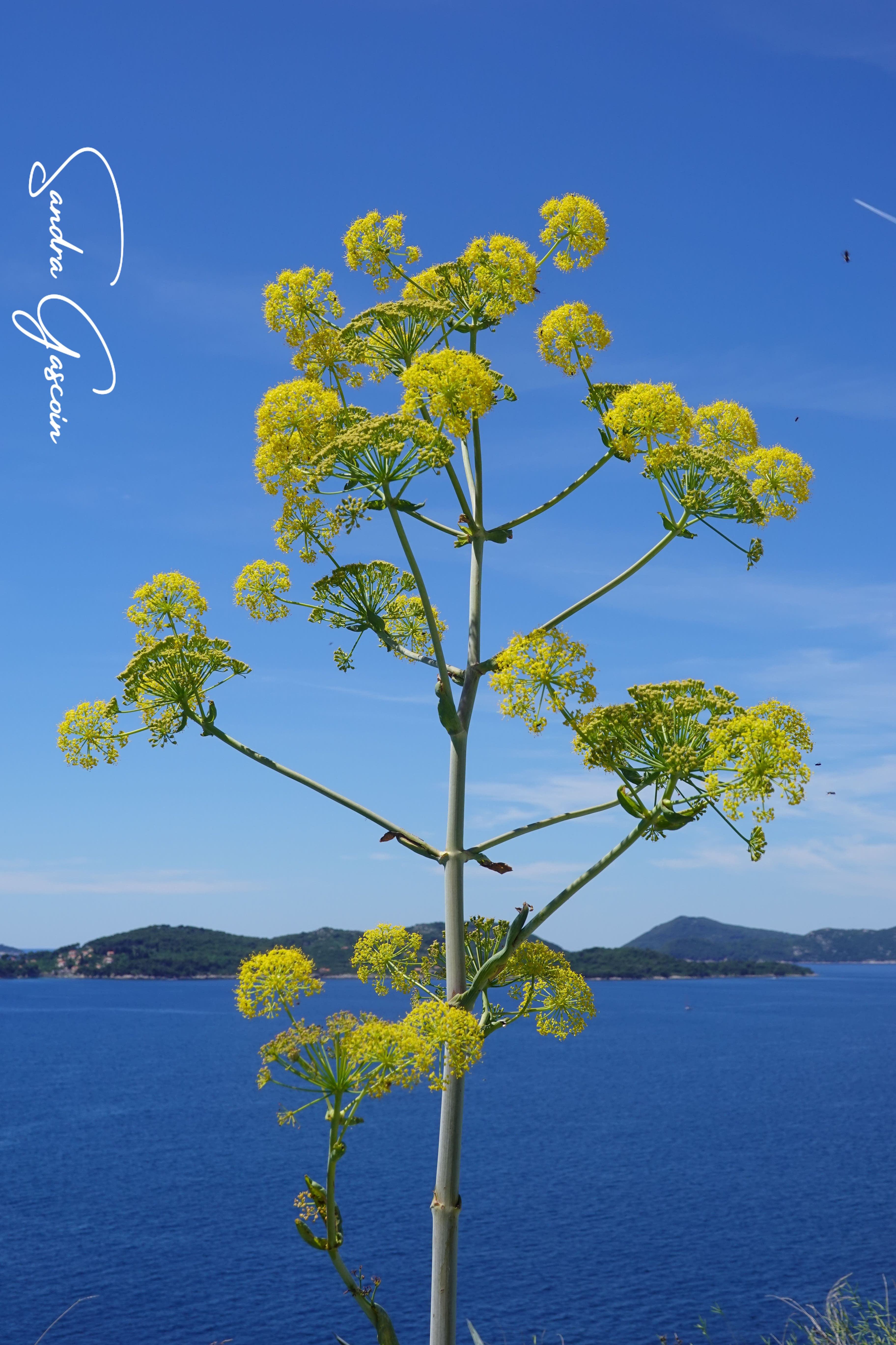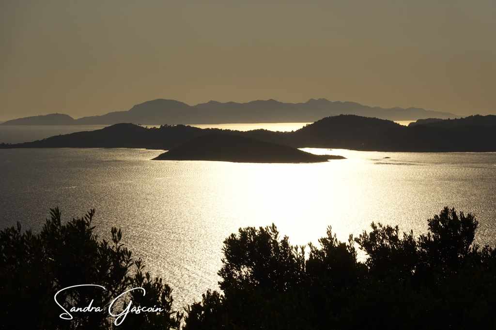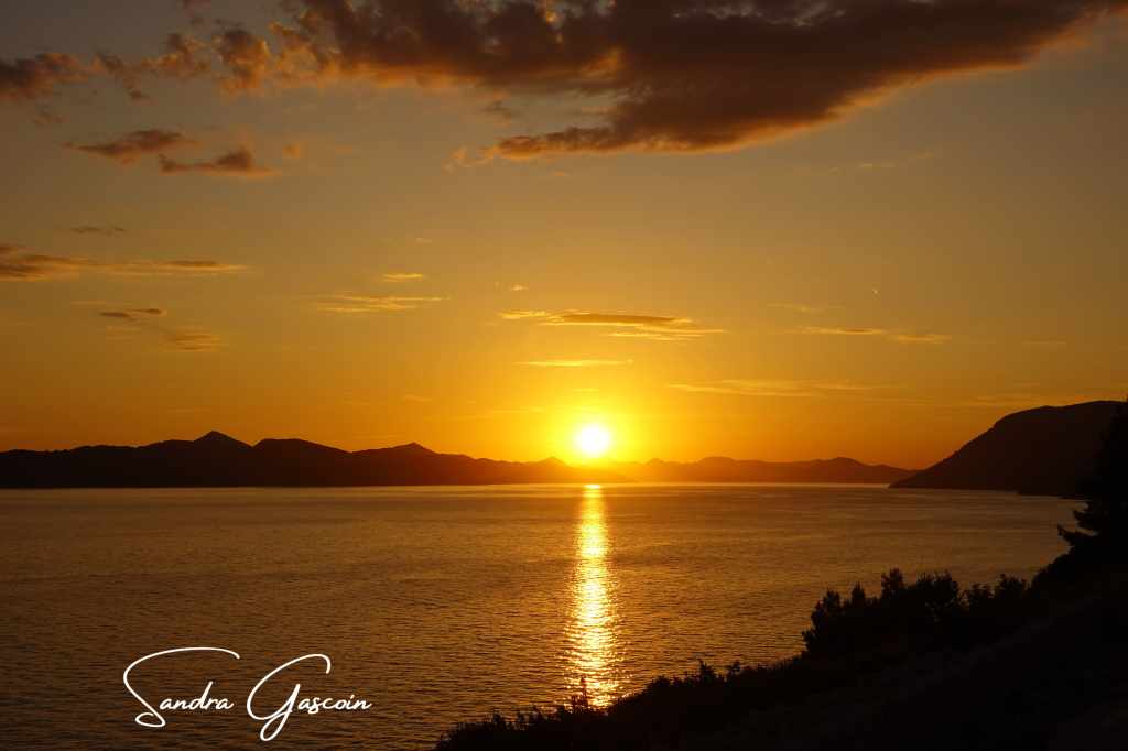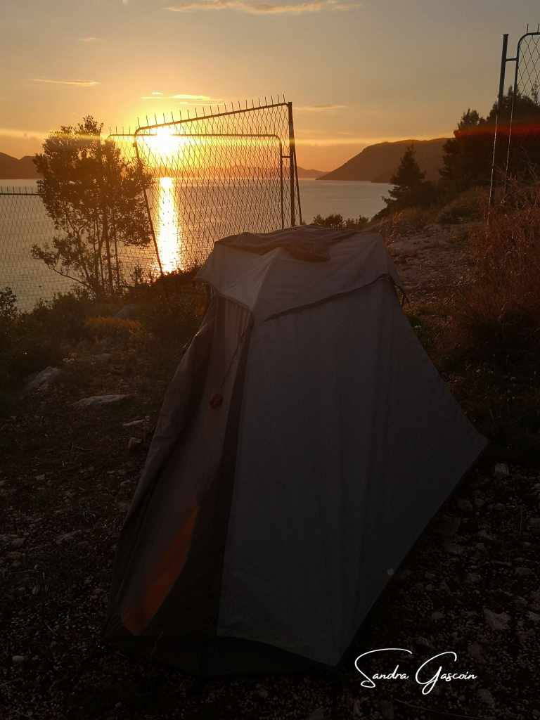 Je trouve après ce petit hameau une route parallèle faisant partie de l’EuroVelo 8. Déserte et paisible, elle me mène à Trsteno, dont l’arboretum servit de décor à Game of Thrones. Le prix excessif de l’entrée me dissuade d’y pénétrer, alors je me contente du Novi Park, offrant trois superbes panoramas sur l’Adriatique et les îles alentour. Il est sept heures passées, le ciel se teinte d’or, il me faut trouver un endroit pour la nuit. Le gars du camping a tenté de m’arnaquer en m’indiquant un prix supérieur à celui annoncé sur son site. Ce genre de pratique m’énerve profondément. Je me retrouve donc face à l’arboretum à ne pas savoir où camper. Je pose mon sac et retourne à la fontaine un peu plus haut pour me rafraîchir et recharger mes bouteilles. Il me faut un plan B. Les espaces verts jouxtant l’arboretum sont sous vidéo-surveillance et interdit au bivouac. Mais si je descends un peu vers la mer, il y a des pistes qui partent vers la droite et s’enfoncent dans le maquis. Ils sont fermés par des chaines. Le dernier débouche sur un terrain vague, il est fort éloigné de la route nationale qui le surplombe et assez loin de toute habitation du hameau. Je m’y engage après m’être assurée que personne ne me voit. Je plante ma tente face au coucher de soleil sur un espace plan. Encore une fois, les serpents ne s’attendaient pas à ma visite et prennent le large en toute hâte. Je n’oublierai pas de prendre ma lumière pour le pipi nocturne !