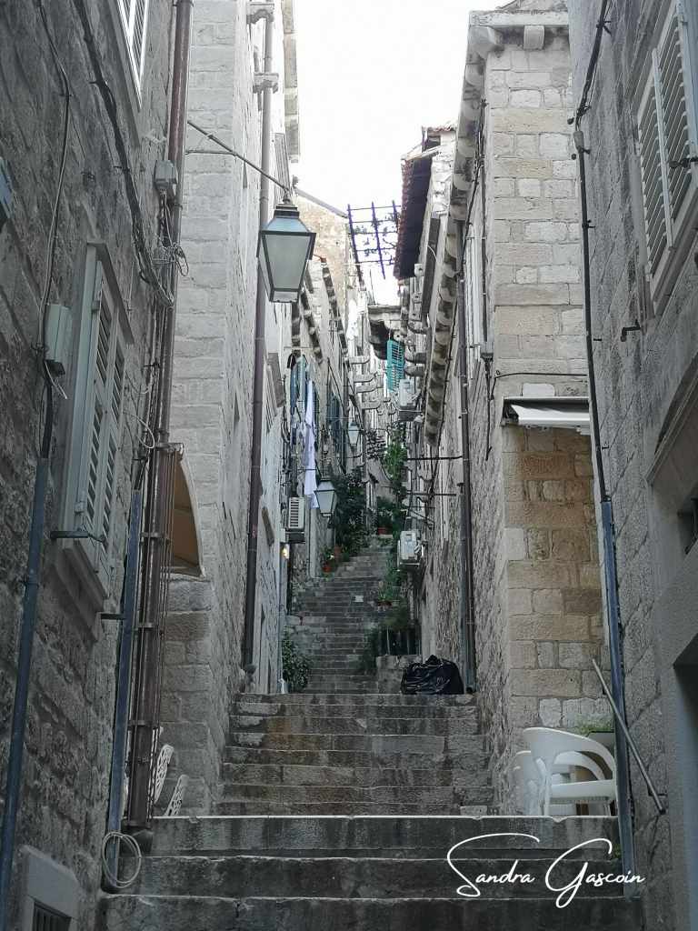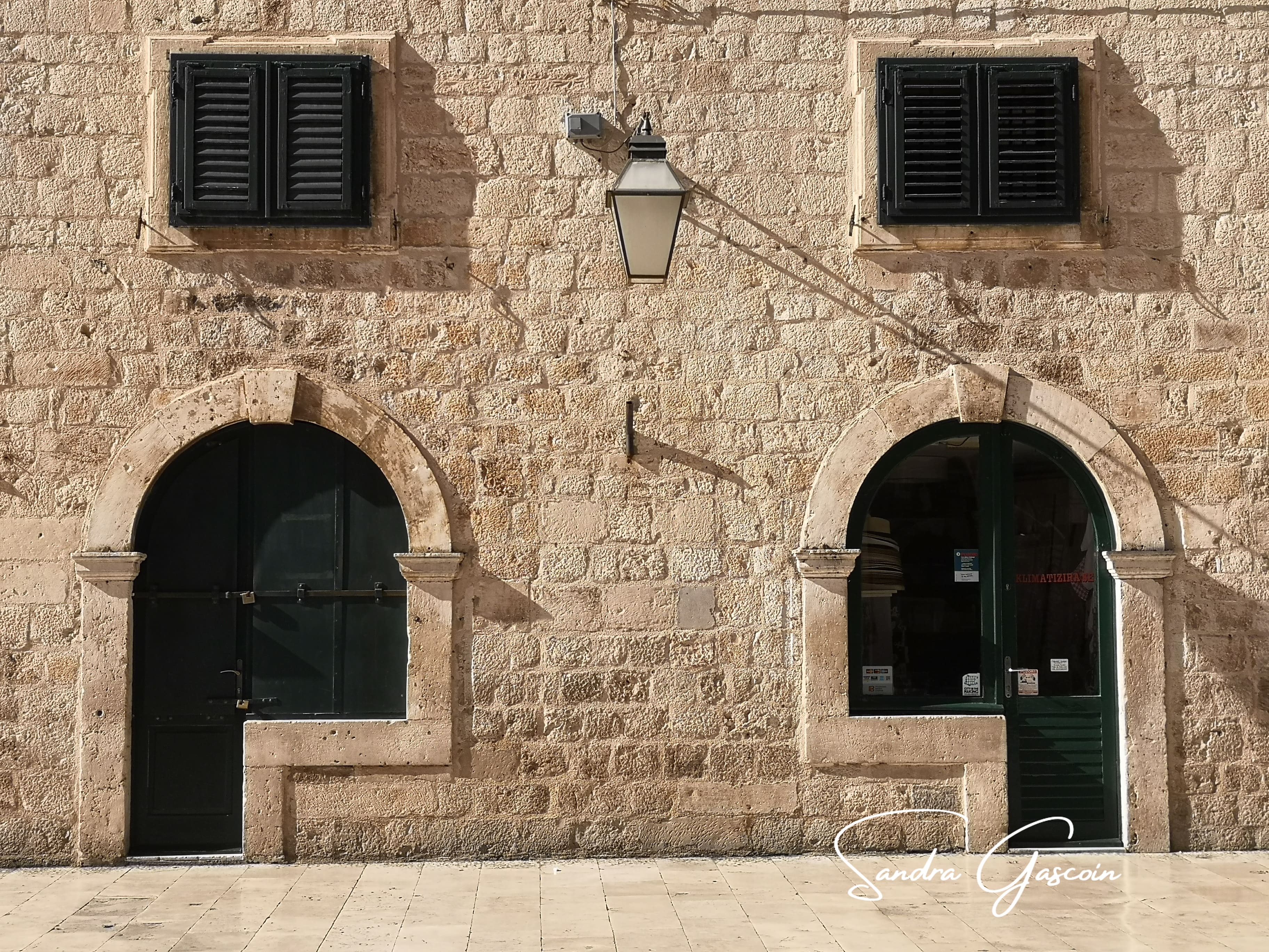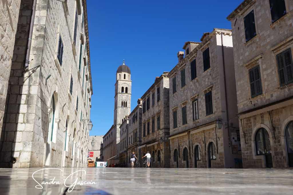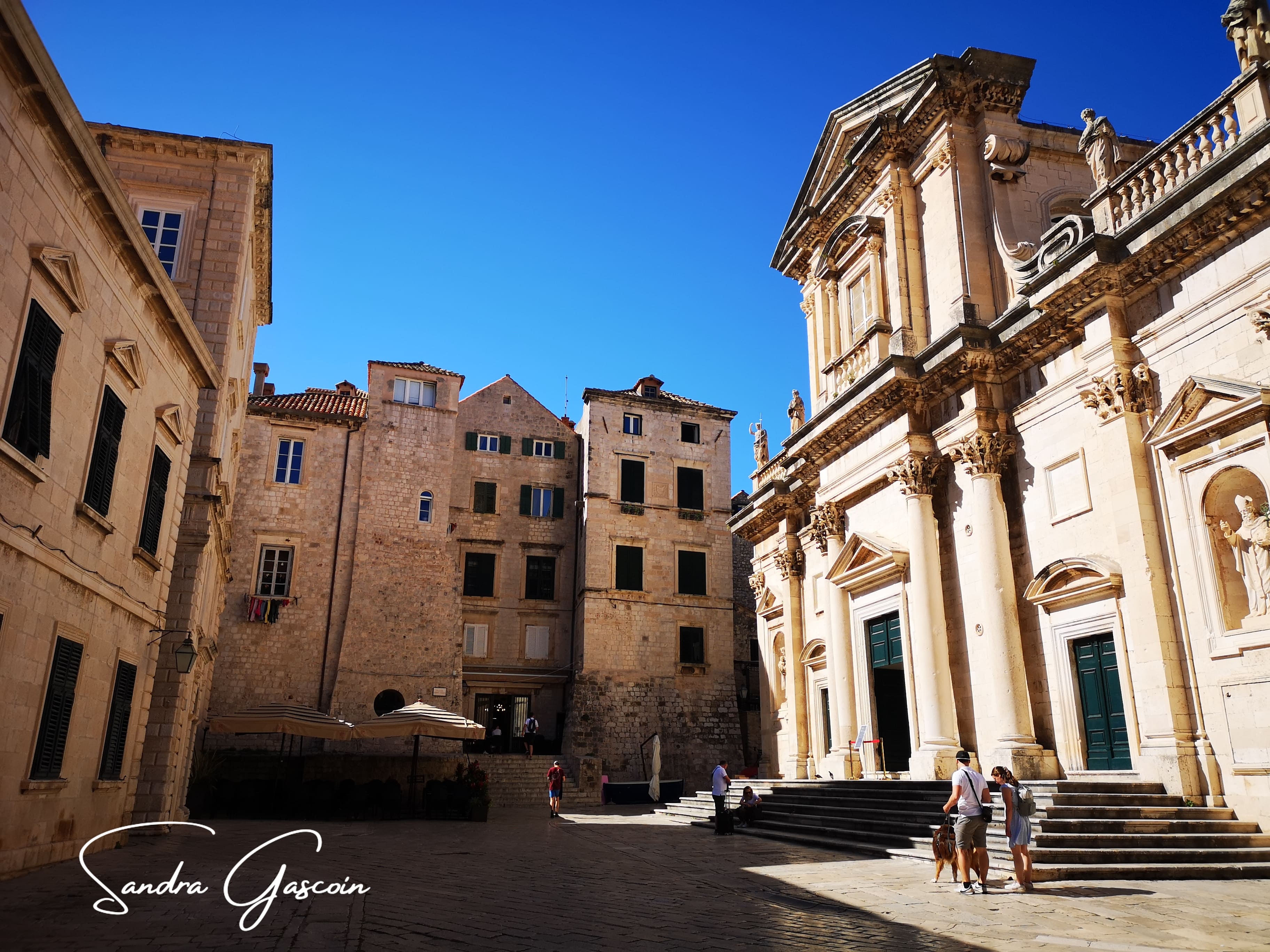 Avant de quitter la cité, alors que les rues s’animent, je fais une petite emplette dans un Studenac sur la place du marché déjà grouillante d’activité, je me prends un petit truc à la boulangerie et m’installe dans un endroit ombragé où je peux manger mon deuxième petit-déjeuner. Je m’assois sur une marche à l’entrée d’une boutique de souvenirs dédiée à Game of Thrones, la série ayant transformé Dubrovnik en lieu de pèlerinage pour fans. J’avais téléchargé sur internet tous les lieux de Stari Grad où des scènes de la série ont été tournées. J’ai complètement oublié de consulter mes captures d’écran lors de mes déambulations. Manifestement, je ne suis pas la plus fervente des admiratrices.