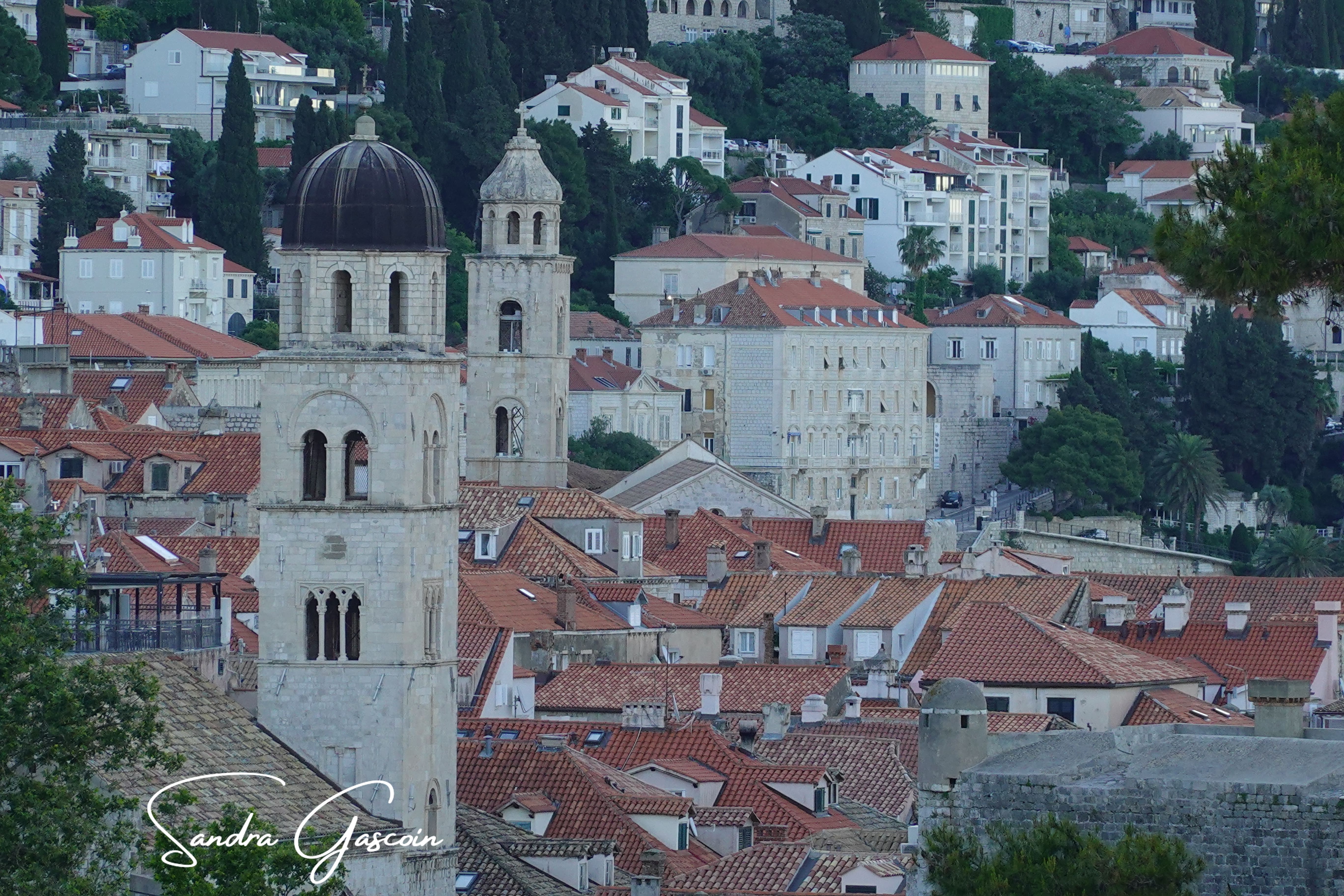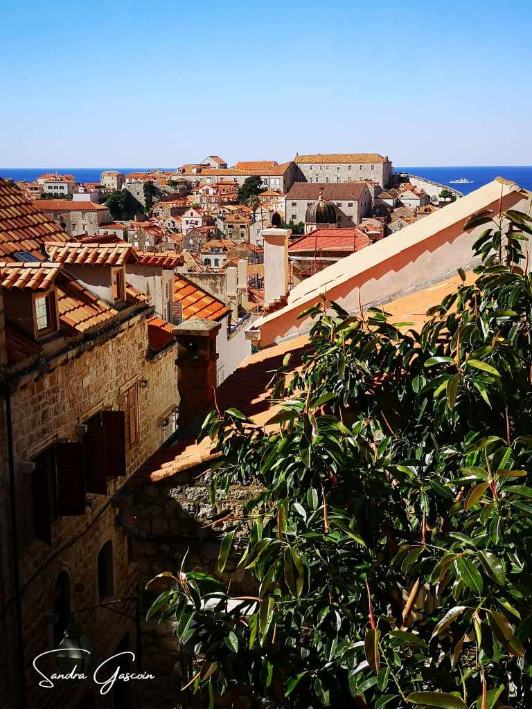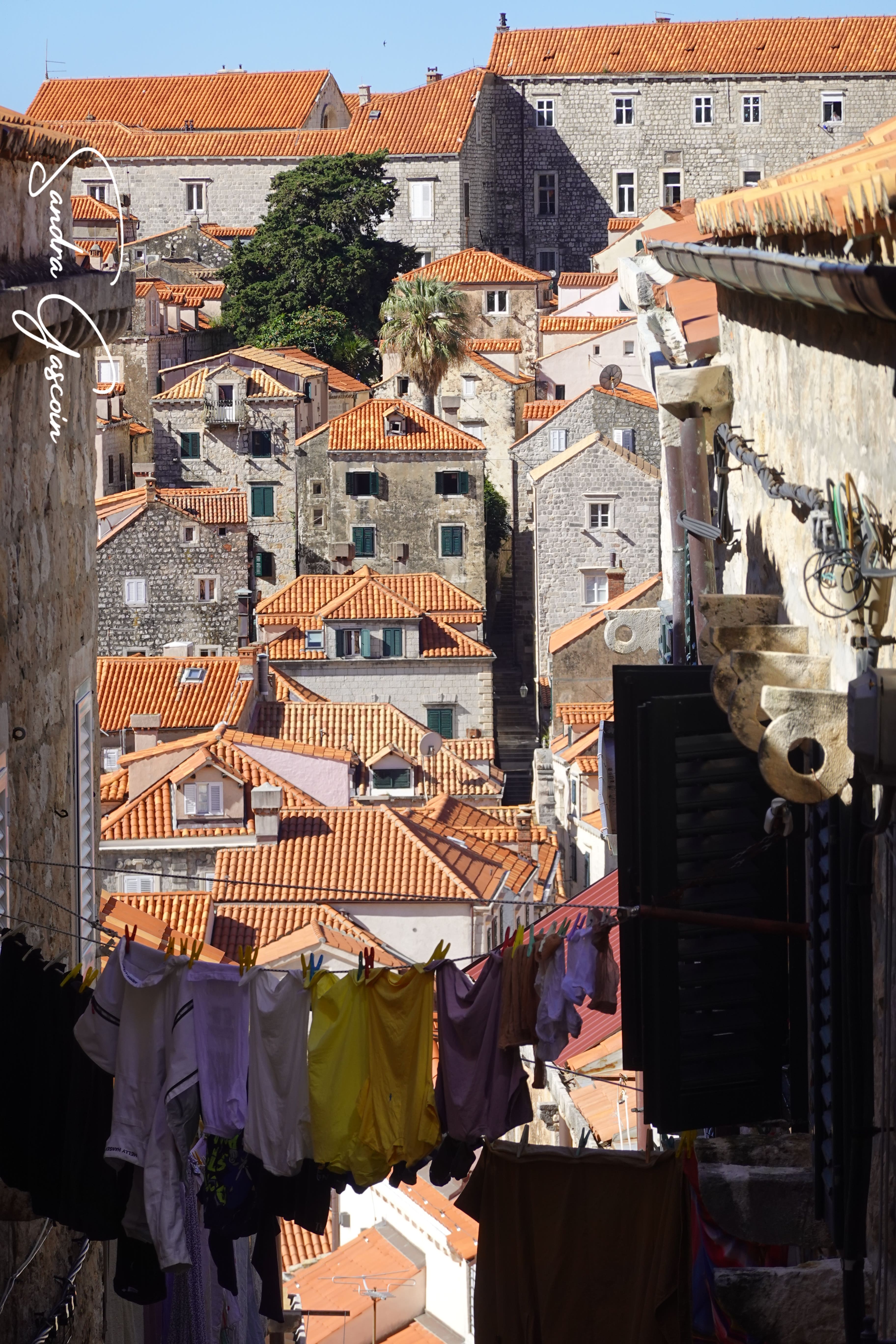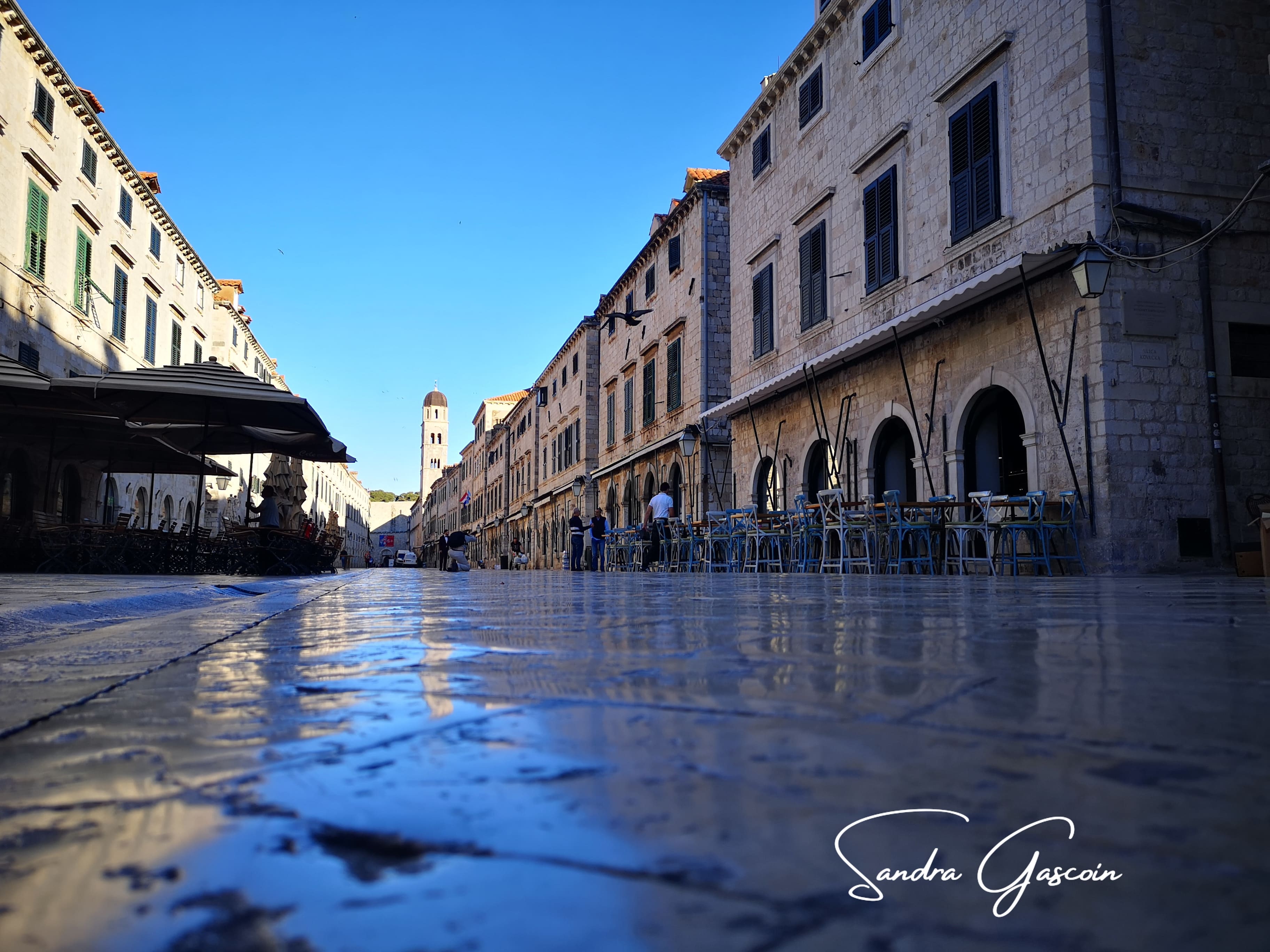 Avant de quitter la cité, alors que les rues s’animent, je fais une petite emplette dans un Studenac sur la place du marché déjà grouillante d’activité, je me prends un petit truc à la boulangerie et m’installe dans un endroit ombragé où je peux manger mon deuxième petit-déjeuner. Je m’assois sur une marche à l’entrée d’une boutique de souvenirs dédiée à Game of Thrones, la série ayant transformé Dubrovnik en lieu de pèlerinage pour fans. J’avais téléchargé sur internet tous les lieux de Stari Grad où des scènes de la série ont été tournées. J’ai complètement oublié de consulter mes captures d’écran lors de mes déambulations. Manifestement, je ne suis pas la plus fervente des admiratrices.