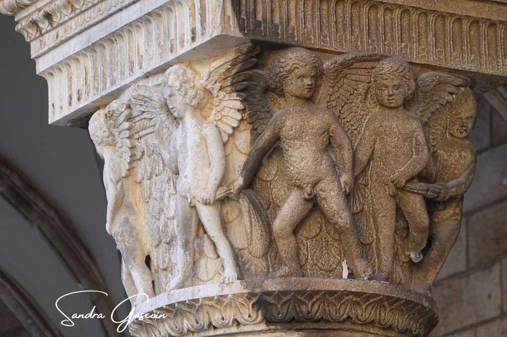 Je crois bien que c’est la première fois que je plie bagage aussi rapidement. En un clin d’œil, ma tente est rangée, et je suis prête en un rien de temps. En effet, comme j’ai bivouaqué dans le parc Gradac en plein milieu de Dubrovnik, je ne traine pas pour éviter de me faire surprendre par la police. Sur un banc face à la forteresse Lovrijenac de Dubrovnik, j’avale un frugal petit-déjeuner composé d’eau et de biscuits au chocolat. Les premiers joggeurs ou les promeneurs de chiens sont déjà à l’œuvre, je n’aurais pas pu rester plus longtemps dans ma tente sans m’attirer des ennuis. Je redescends vers Stari Grad, espérant profiter de la quiétude matinale avant que les flots de touristes ne s’y engouffrent. Le jour se lève doucement, les rues sont encore plongées dans l’ombre de la montagne Srd. Les équipes de voirie s’activent, débarrassant la grande artère des montagnes de déchets et d’emballages abandonnés par les restaurateurs et les particuliers. Stari Grad s’étend sur un espace rocheux, traversé par cette large voie pavée entre la porte de l’ouest et la porte du marché aux poissons. De part et d’autre, des escaliers abrupts mènent tantôt aux remparts, tantôt à un enchevêtrement de venelles, rendant la cité impraticable aux véhicules. Le ramassage des ordures se concentre donc sur cette unique artère, les employés municipaux arrosent généreusement le pavage qui brille et se prête à de jolies photos. Je furète, redécouvrant avec amusement des détails oubliés, comme ces angelots aux attributs sexués bien marqués qui suscitaient déjà mon étonnement il y a vingt-quatre ans.