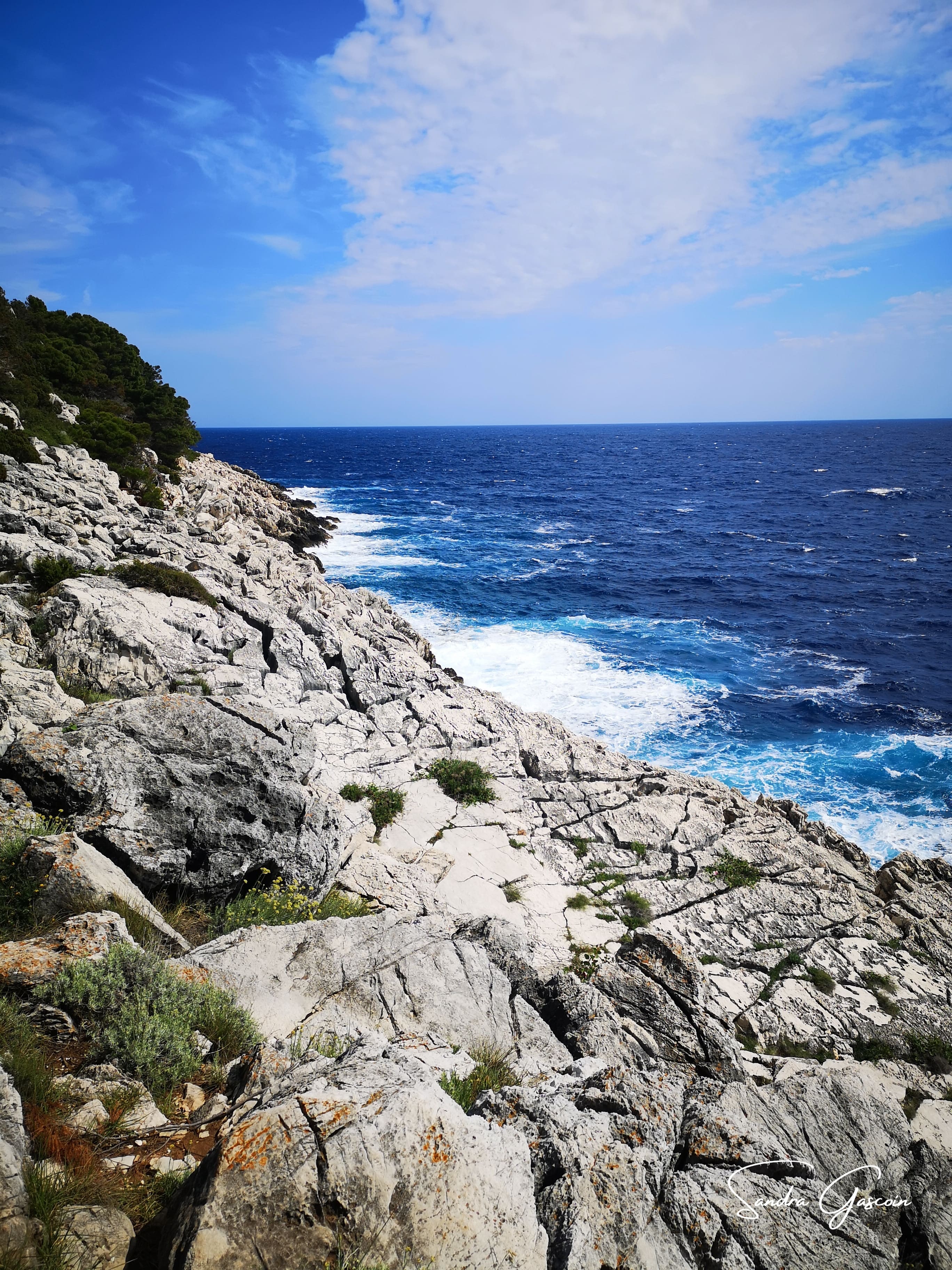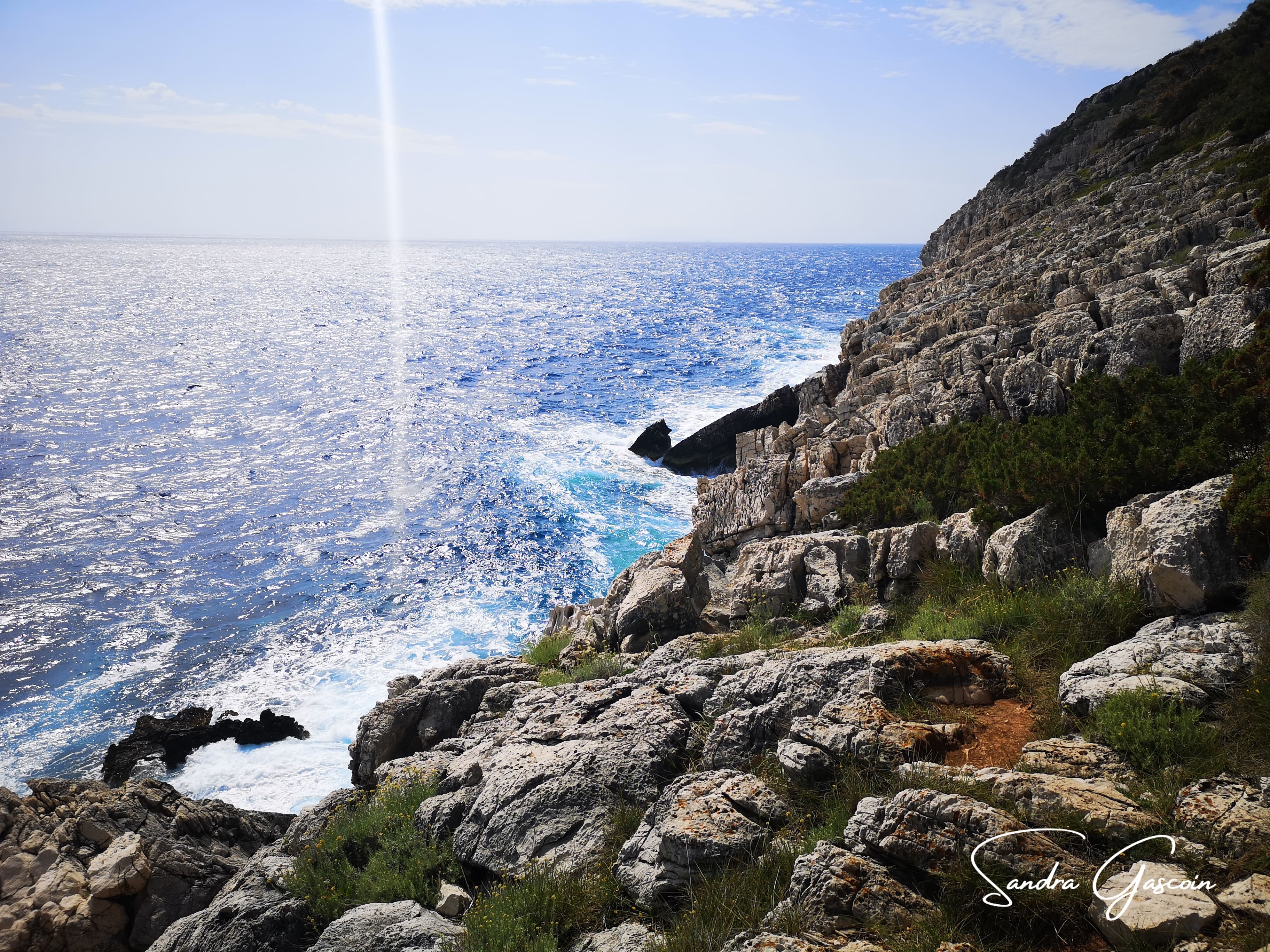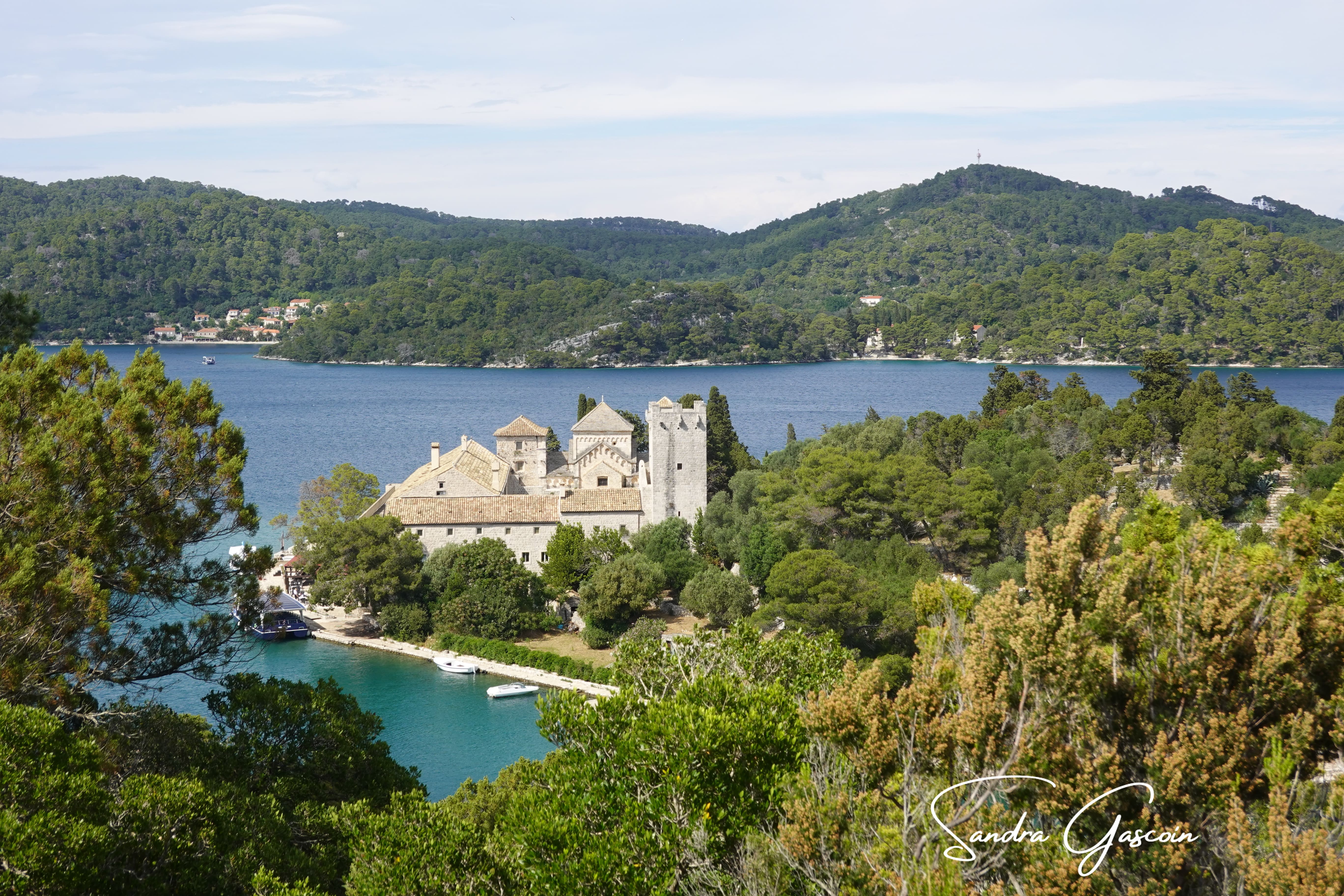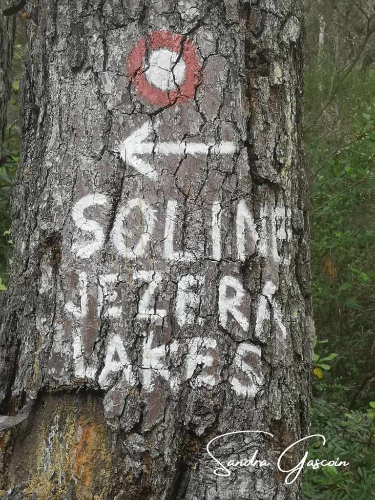 L’imposant panneau bleu du parc national de Mljet est la seule tache de couleur dans cette étendue verte que forme la forêt de pins. Désormais, l’accès est réglementé et soumis à un droit d’entrée. Les règles sont celles de tout espace protégé : interdiction de chasser, de laisser des déchets, de faire du bruit, de s’aventurer hors des sentiers balisés ou de bivouaquer. Je pénètre dans le parc par une piste forestière et, vers midi, j’atteins les hauteurs du hameau de Soline. Désireuse d’explorer la zone sans éveiller l’attention des gardiens, je dissimule mon sac volumineux dans un fourré derrière un tronc couché.
