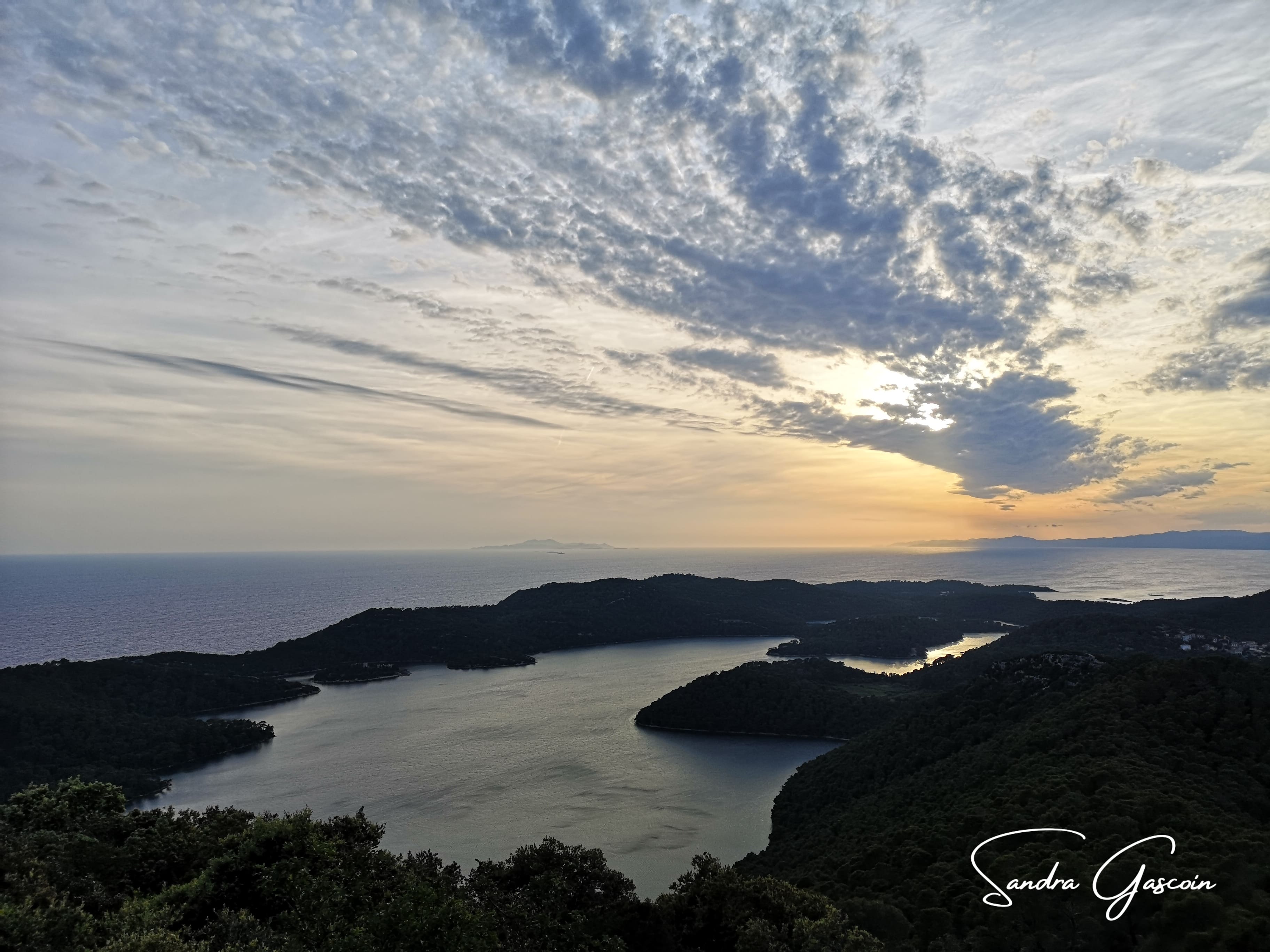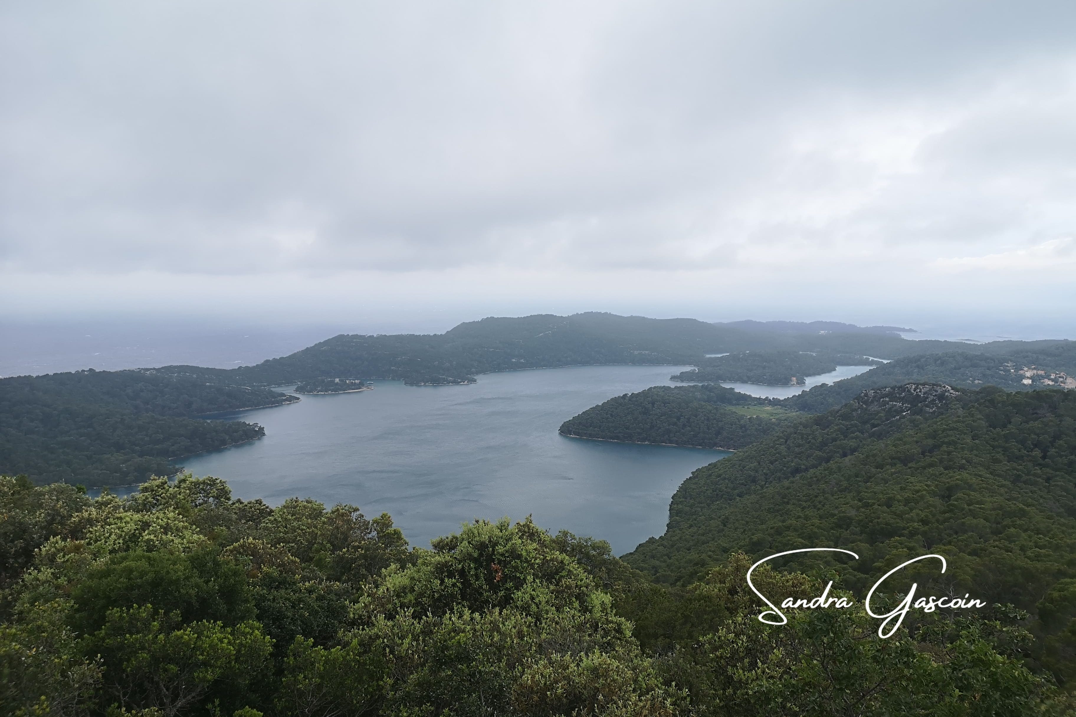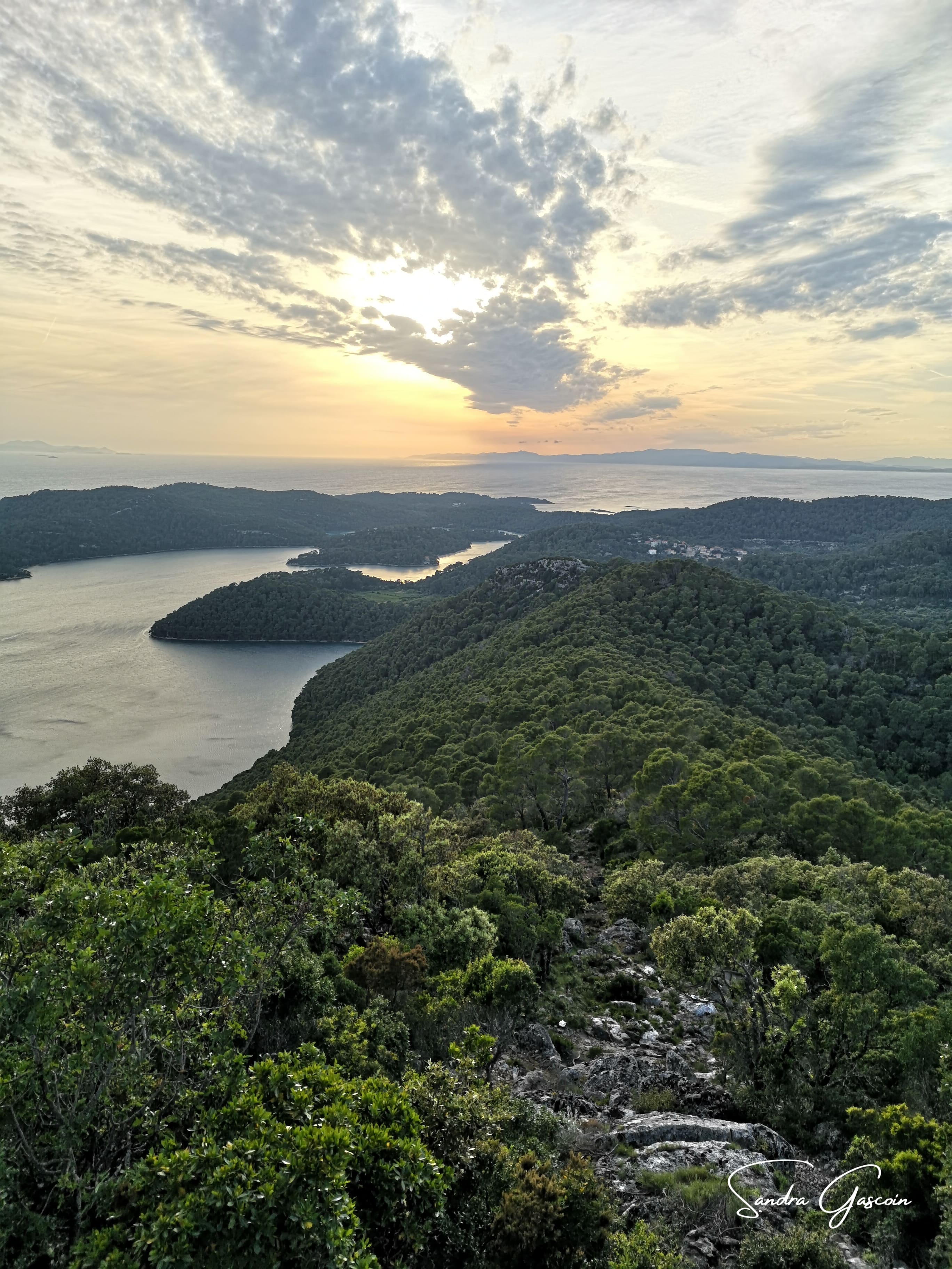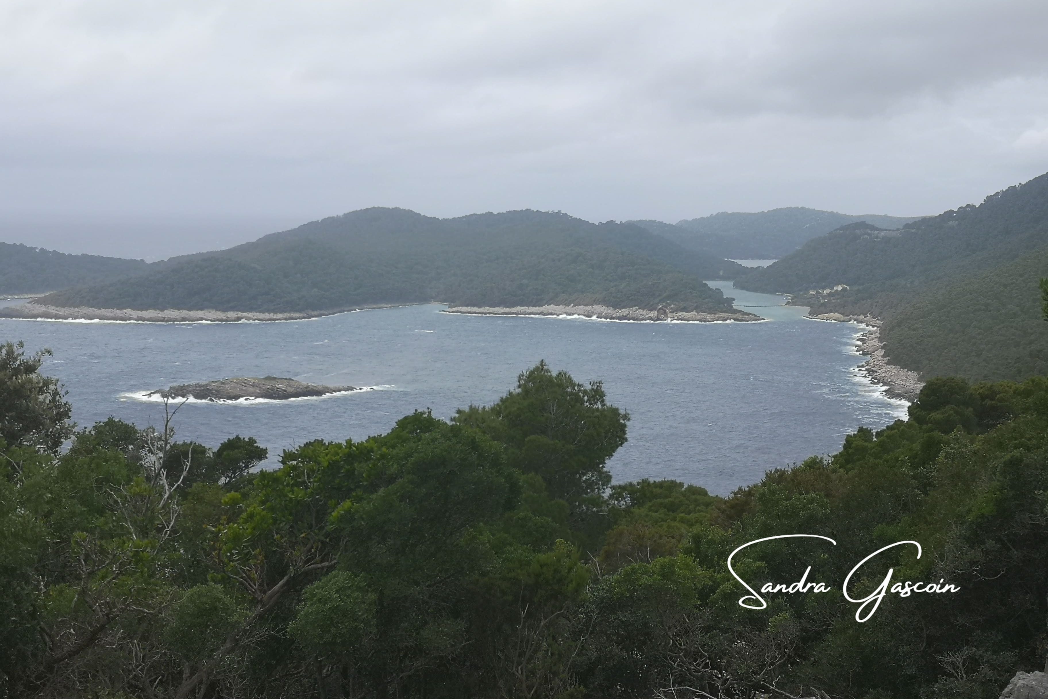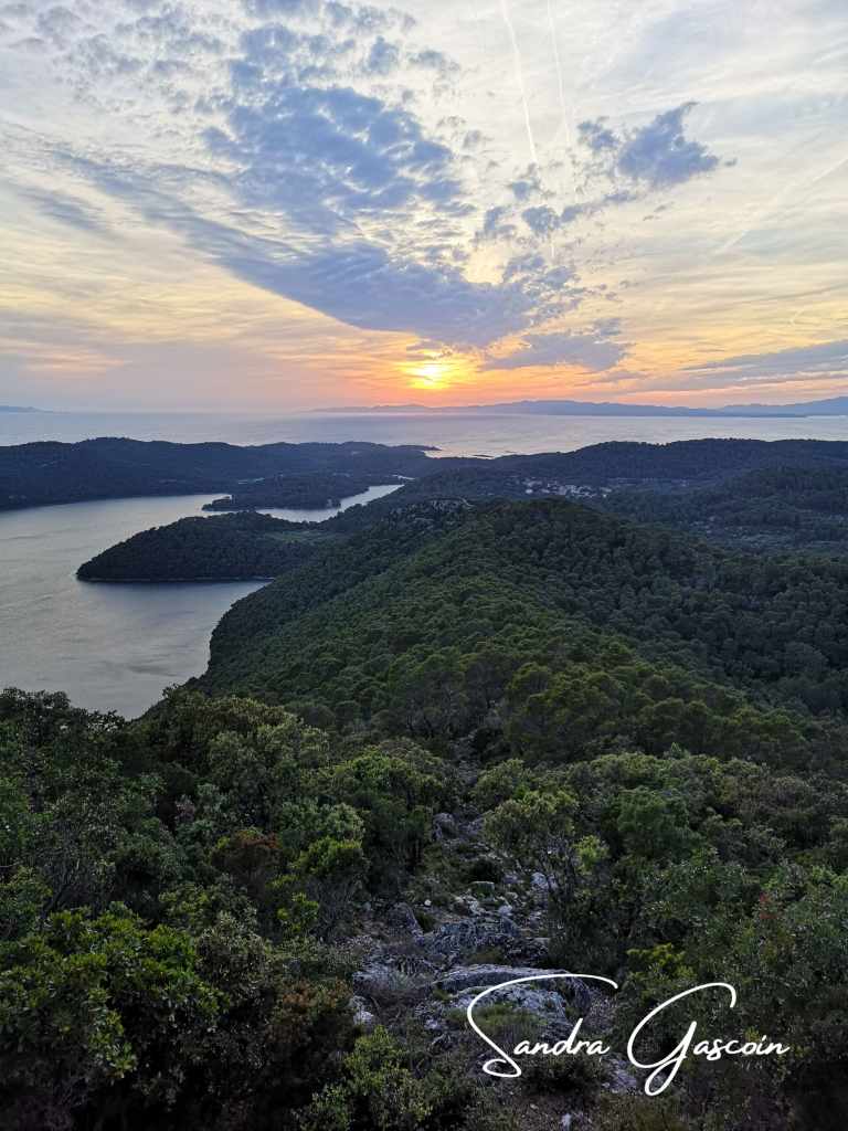 Je fais aussitôt un détour par le belvédère de Montokuc, curieuse de voir si l’endroit pourrait m’accueillir pour la nuit. Une pompière veille dans la tour d’observation. Le sommet, entièrement rocailleux, ne laisse aucune place pour un bivouac. Le vent souffle fort et le ciel, désormais voilé, annonce un changement de temps. L’endroit sera parfait pour admirer le coucher du soleil, mais il me faut trouver un autre emplacement pour ma tente. Je redescends vers les deux lacs, le grand Veliko Jezero ouvert sur la mer et Malo Jezero qui se jette dans le premier. Peu de visiteurs arpentent les lieux, rendant la promenade paisible. J’évolue discrètement à travers les hameaux et le centre d’accueil du parc, évitant soigneusement d’attirer l’attention. Mais ma prudence est mise à mal lorsque je décide de rejoindre le port de Pomena pour acheter de quoi manger. Je passe devant deux guichets du parc et feins une présence parfaitement légitime. À la supérette, j’attrape un paquet de chips et des tortillas juste avant la fermeture. Sur le chemin du retour, je garde mon air détendu, grignotant mes chips nonchalamment en passant devant un poste de contrôle et une voiture de gardiens du parc. Dès que possible, je bifurque sur un sentier et m’éloigne rapidement en direction du lac. Là, sur un banc, je termine mon en-cas tout en observant le soleil percer timidement la couverture nuageuse, annonçant un crépuscule prometteur. Après un crochet par un point de vue, je regagne Soline et poursuis ma quête d’un bivouac. Chaque endroit me semble exposé, peu discret. L’affaire s’annonce compliquée. J’ai bien trouvé quelques spots en bord de mer mais il me faudra traverser le hameau avec mon sac, je n’ai pas envie d’attirer les regards.