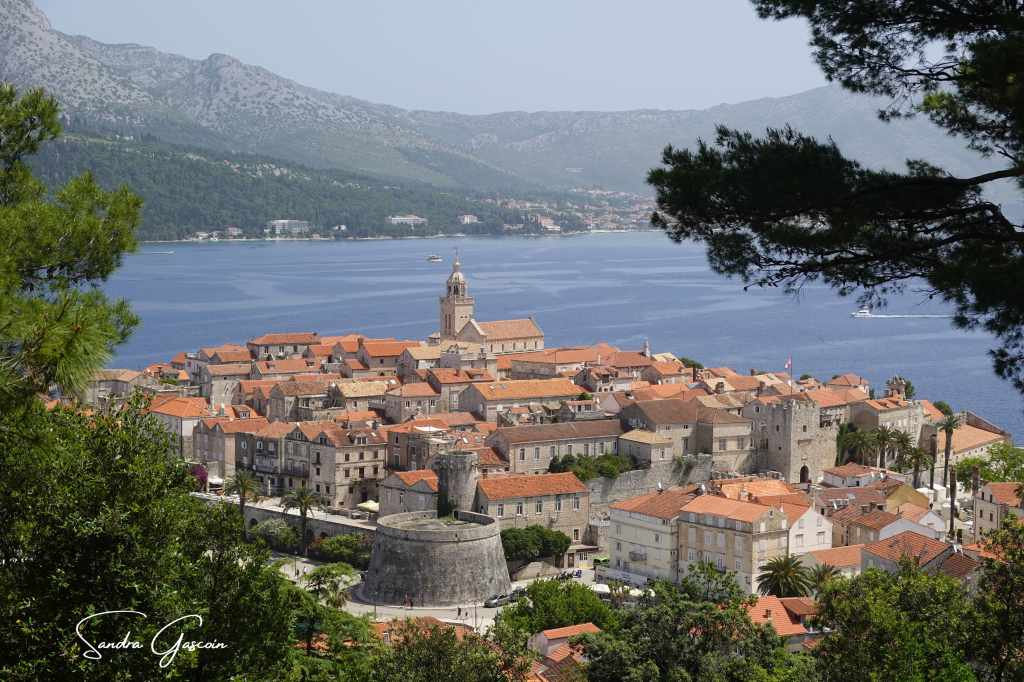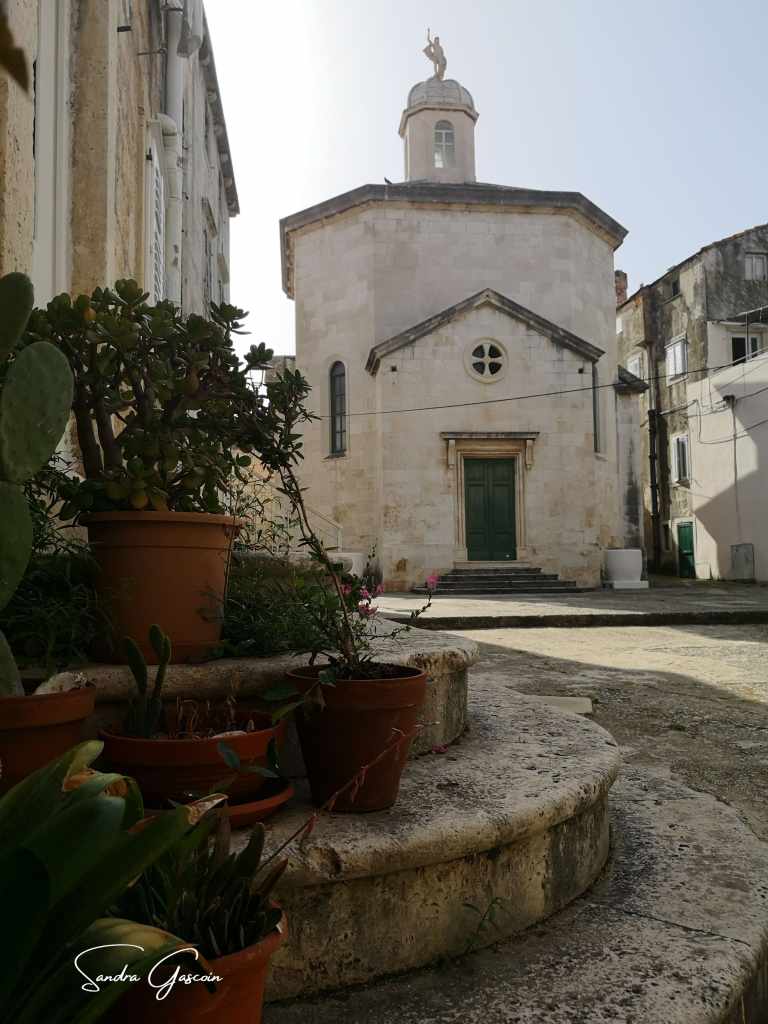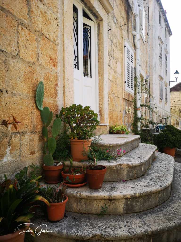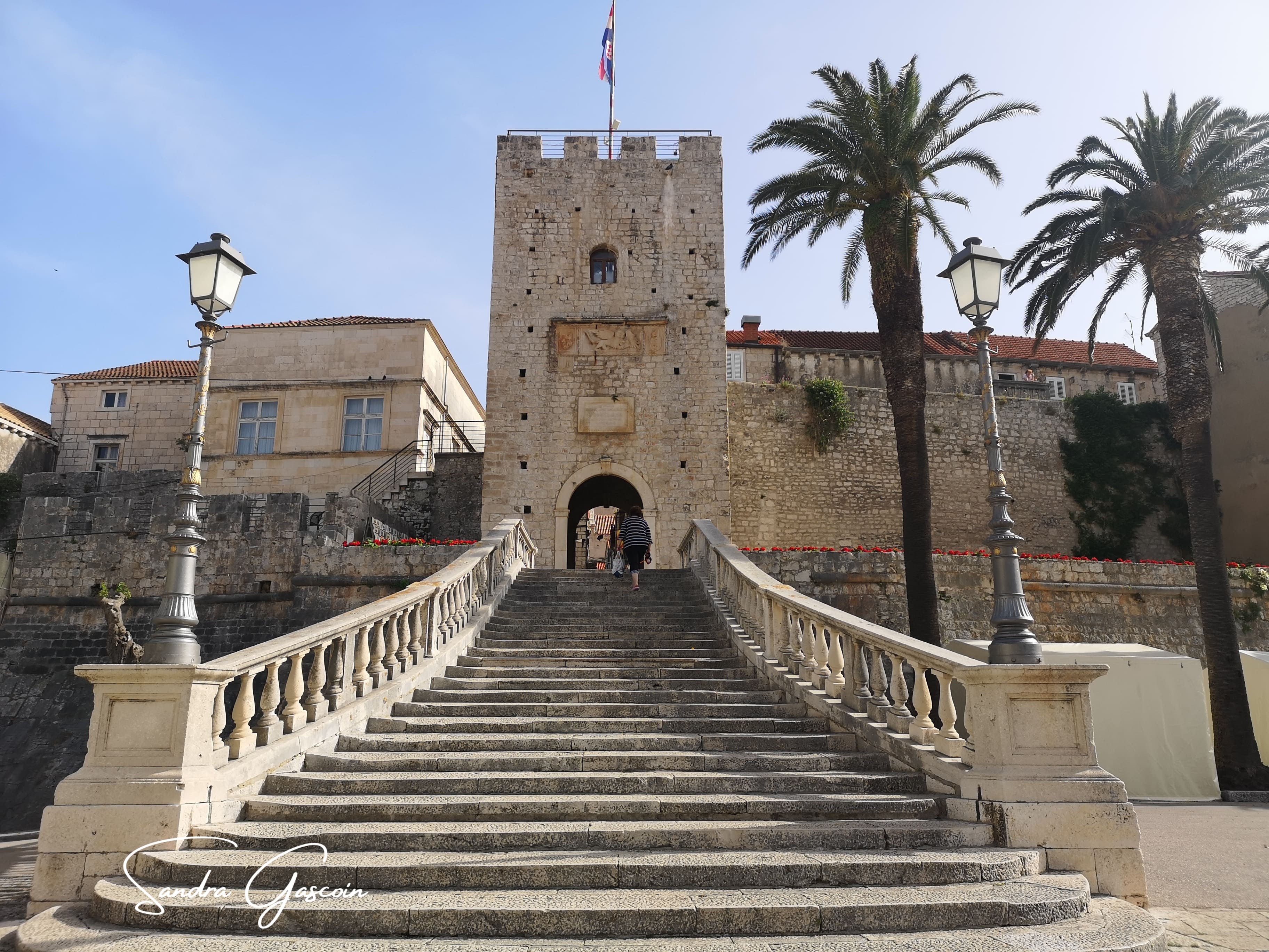 Levée de bon matin, je souhaite visiter Stari Grad avant le check-out à dix heures. Le lieu n’est pas grand, le plan urbain simple. Korčula est bâtie sur un éperon rocheux, bordée par une route côtière qui en fait le tour. Une artère principale la traverse du nord au sud, menant au cœur de la cité où trône la cathédrale. De part et d’autre, un enchevêtrement de ruelles se déploie en arête de poisson, offrant un agencement aussi pittoresque qu’ingénieux. On pénètre dans la vieille ville par la tour massive et carrée Veliki Revellin à laquelle on accède par un escalier monumental datant du XIXème siècle. Les fortifications datent du XIIIème siècle et ont subi des modifications au cours des siècles suivants ; des tours imposantes, encore visibles aujourd’hui, protégeaient le palais et le port au sud-ouest. L’histoire de Korčula, à l’image de celle des Balkans, est marquée par une succession d’occupations et de conflits, chaque période laissant son empreinte sur l’architecture et le patrimoine de la ville. Elle revendique fièrement être le berceau de Marco Polo, dont on peut visiter la maison natale.