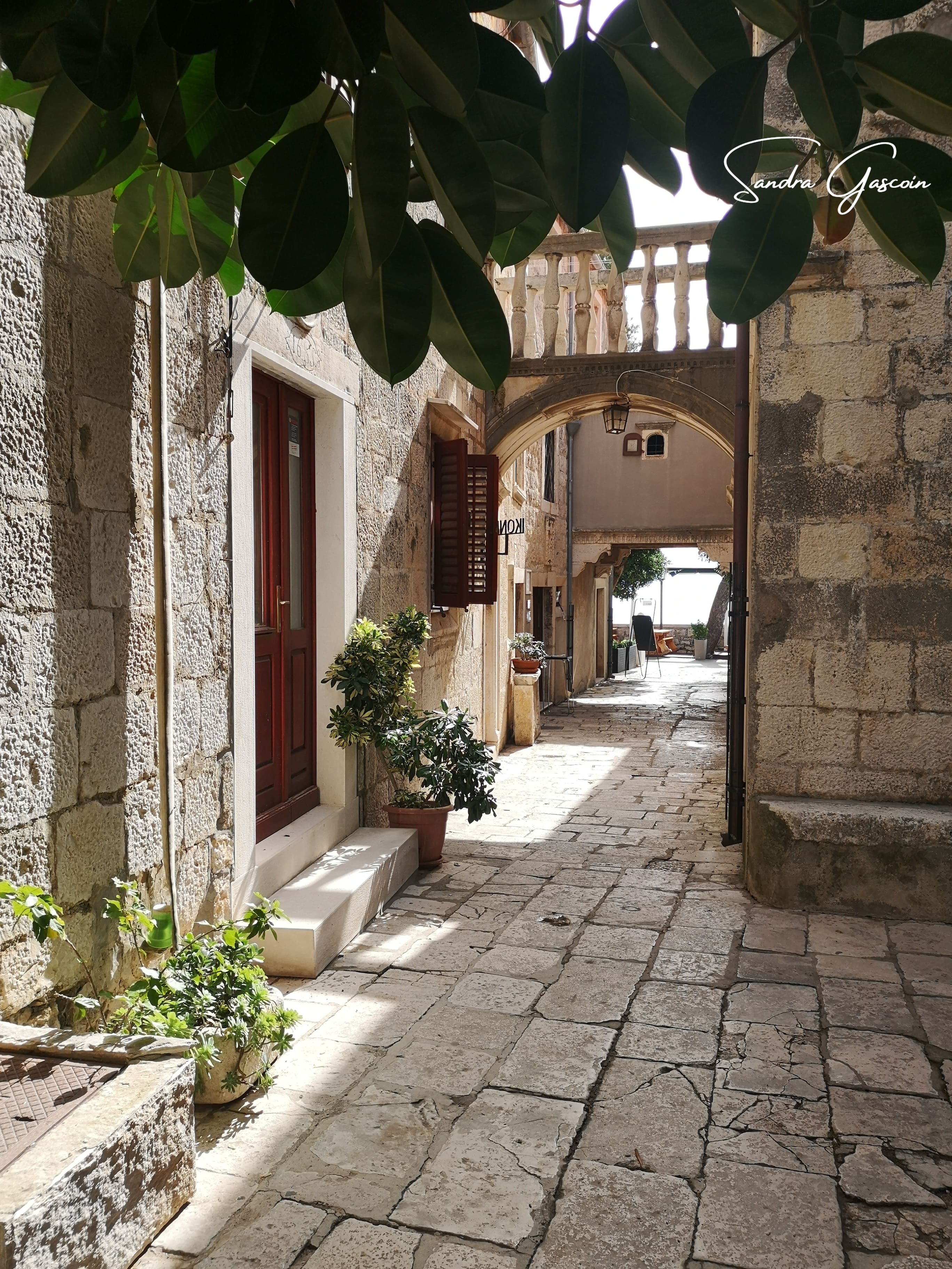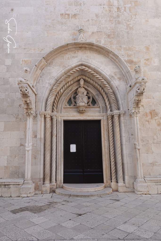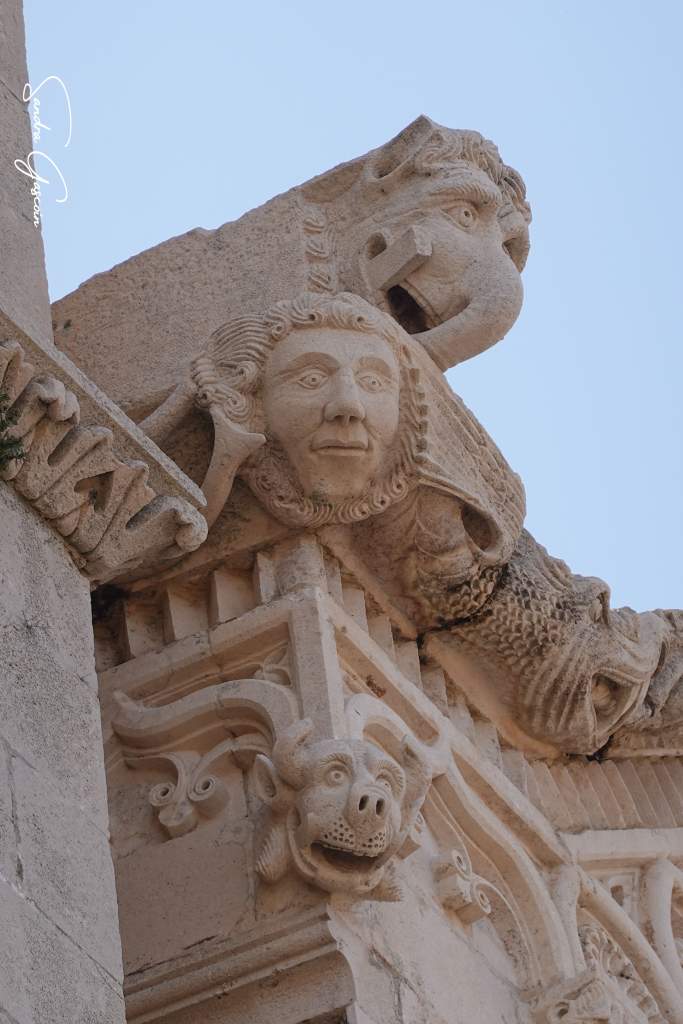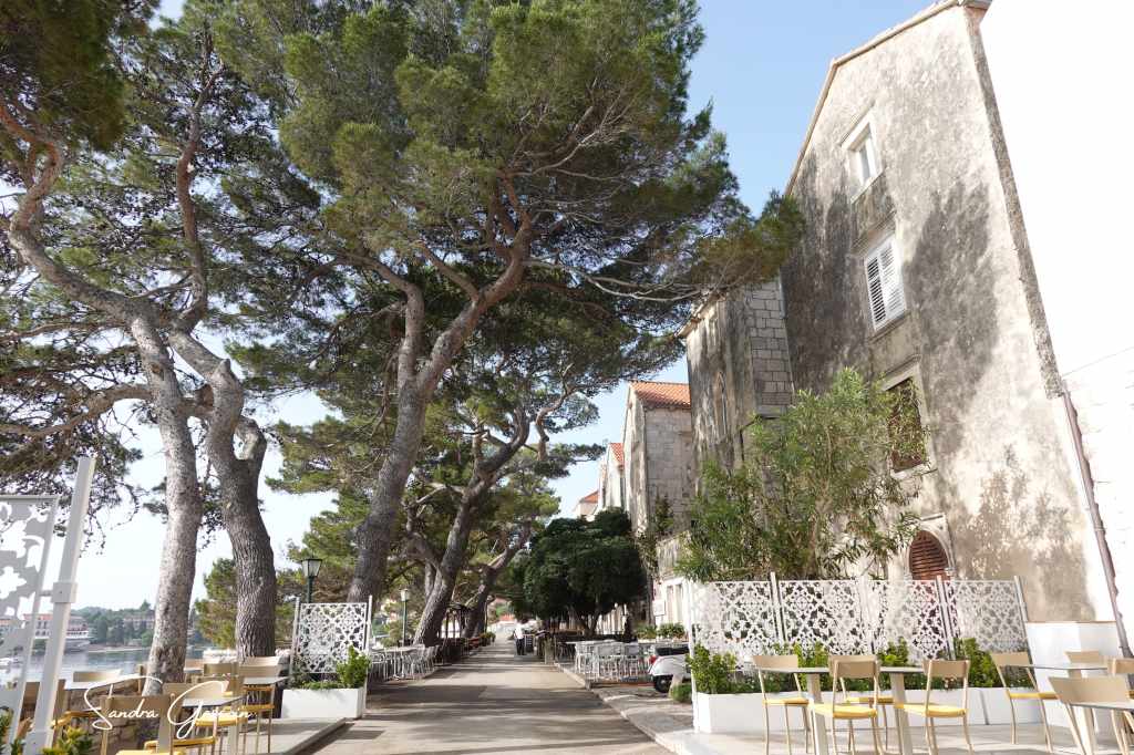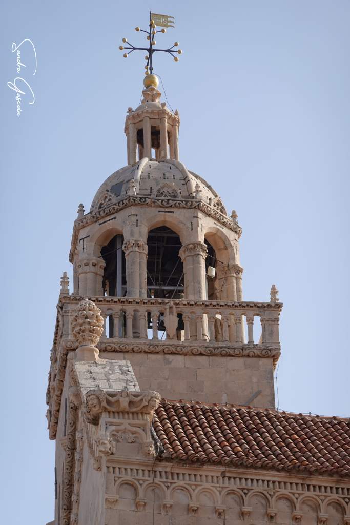 Levée de bon matin, je souhaite visiter Stari Grad avant le check-out à dix heures. Le lieu n’est pas grand, le plan urbain simple. Korčula est bâtie sur un éperon rocheux, bordée par une route côtière qui en fait le tour. Une artère principale la traverse du nord au sud, menant au cœur de la cité où trône la cathédrale. De part et d’autre, un enchevêtrement de ruelles se déploie en arête de poisson, offrant un agencement aussi pittoresque qu’ingénieux. On pénètre dans la vieille ville par la tour massive et carrée Veliki Revellin à laquelle on accède par un escalier monumental datant du XIXème siècle. Les fortifications datent du XIIIème siècle et ont subi des modifications au cours des siècles suivants ; des tours imposantes, encore visibles aujourd’hui, protégeaient le palais et le port au sud-ouest. L’histoire de Korčula, à l’image de celle des Balkans, est marquée par une succession d’occupations et de conflits, chaque période laissant son empreinte sur l’architecture et le patrimoine de la ville. Elle revendique fièrement être le berceau de Marco Polo, dont on peut visiter la maison natale.