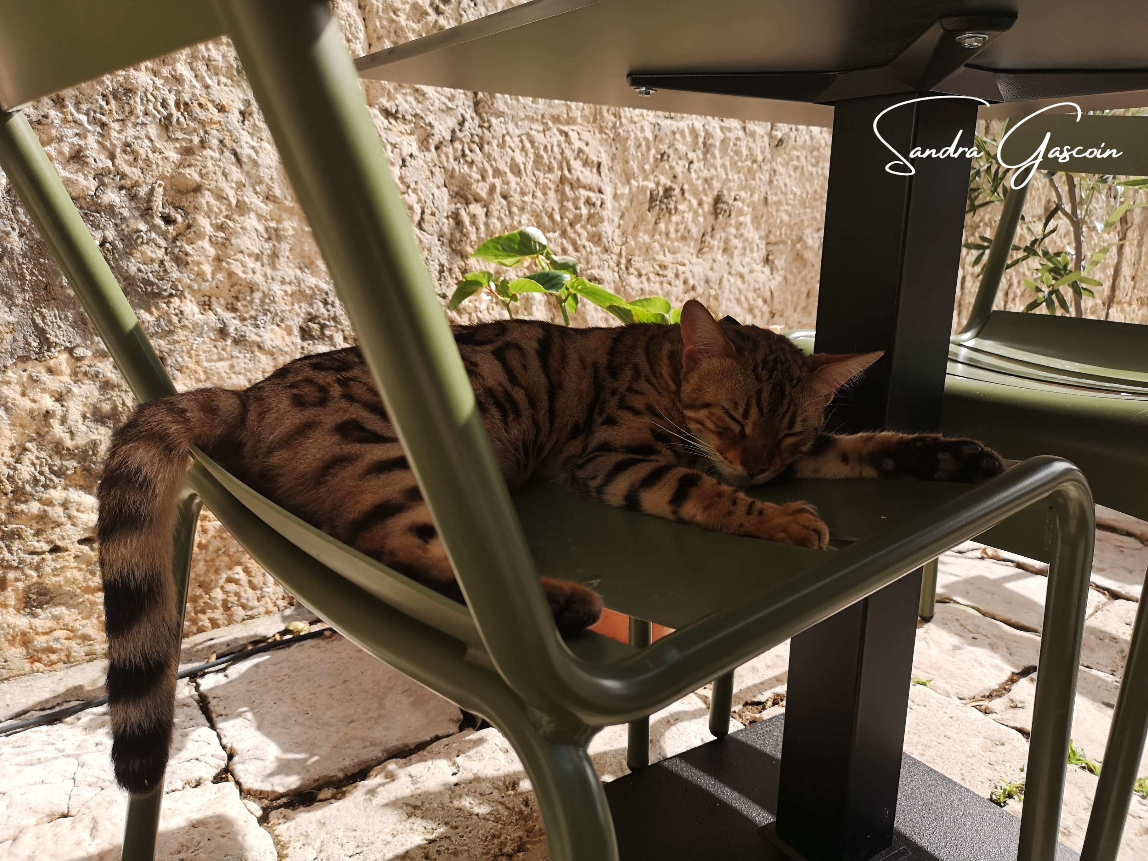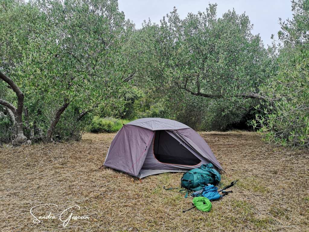 Le reste de la balade est sans difficulté. Je me ravitaille en eau dans le village de Pupnat, dans un café restaurant bien fréquenté en ce dimanche. Je peux maintenant chercher un coin isolé pour établir mon bivouac. Mon choix se porte sur une oliveraie au sud du village. J’emprunte un sentier parallèle à la piste cyclable. Je choisis un endroit sous les arbres, là où l’herbe fraîchement coupée forme un tapis moelleux et sec, parfait pour passer la nuit. Avec un peu de chance, les paysans respecteront la pause dominicale et ne viendront pas troubler ma solitude