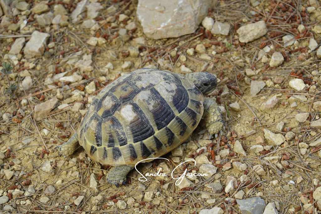 Il ne m’aurait pas fallu tarder plus longtemps. À peine me suis-je mise en route que je croise les premiers vététistes ! La piste descend continuellement. Rien de bien notable ne se produit, si ce n’est une rencontre inattendue : une tortue terrestre, malencontreusement exposée en plein milieu du chemin. Dans ce genre de situation, je bascule immédiatement en mode « stalker » : j’observe, j’analyse, je photographie sous toutes les coutures. La pauvre créature, dépassée par mon insistance, ne sait plus où fuir pour échapper à ce harcèlement involontaire.