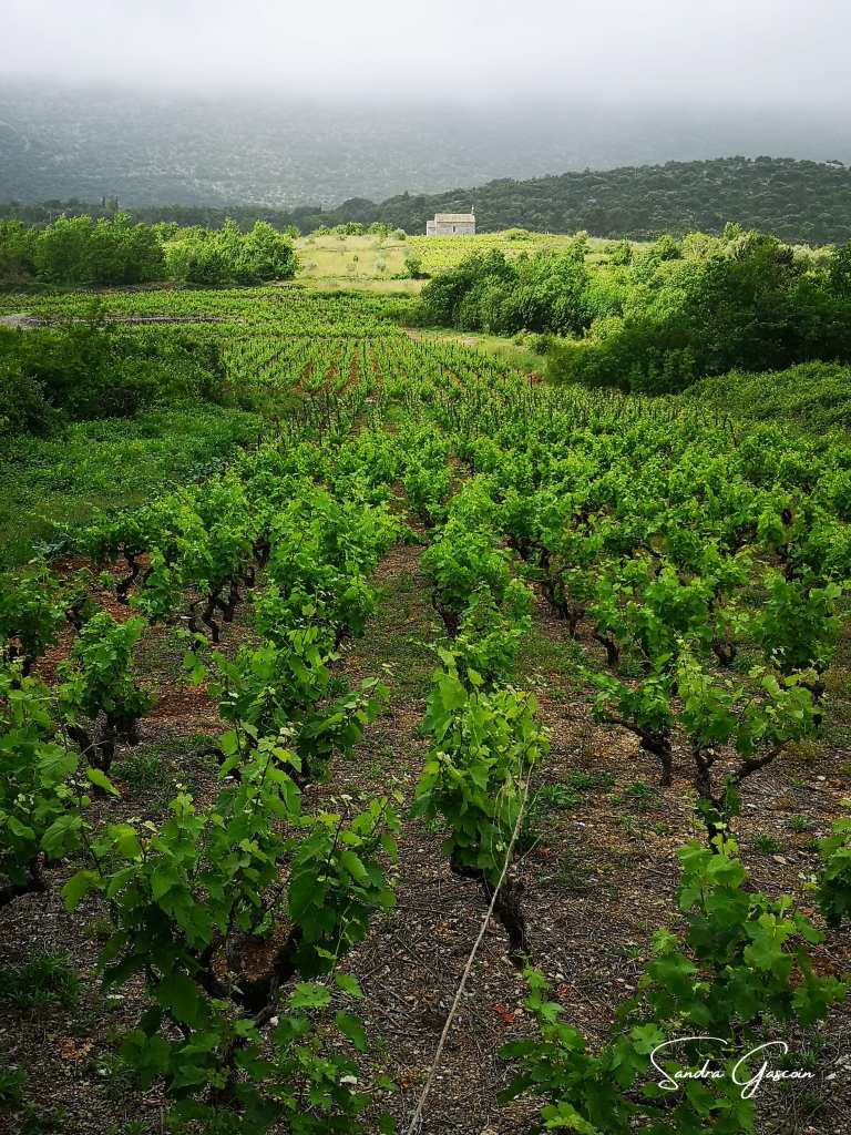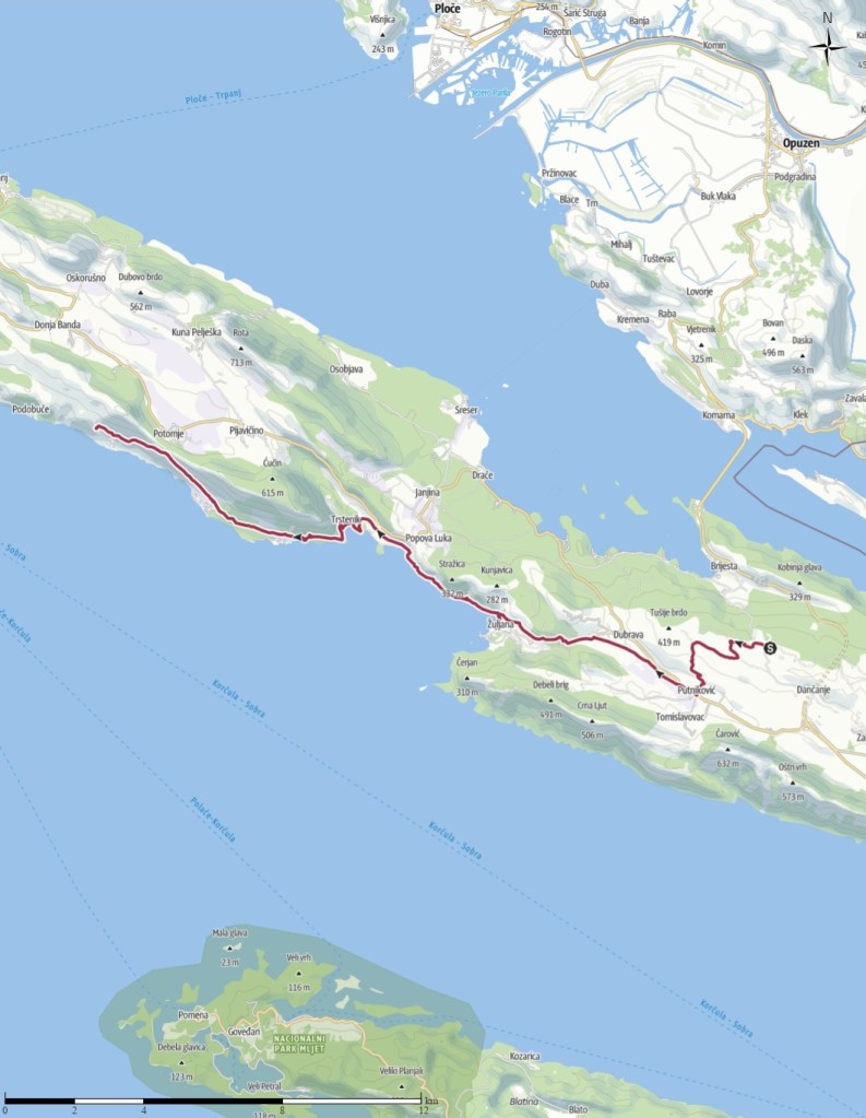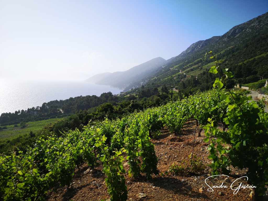 La Via Dinarica suit ici l’EuroVelo 8, qui longe la mer en s’éloignant de la route départementale. Le sentier est asphalté jusqu’à un tunnel ramenant vers la D414, mais la circulation est quasi inexistante, rendant la marche paisible. La route serpente au cœur des vignobles, et si le dénivelé reste faible jusqu’à Trstenik, l’absence totale d’ombre rend la chaleur écrasante. Je suis en nage. En arrivant à Trstenik, je découvre un hameau étonnamment animé. Assise sur un banc de la jetée pour faire sécher mon t-shirt, je m’adonne à la lecture, bercée par la musique qui me parvient en simultané de deux bars différents. Un effet sonore en dolby stéréo, version croate !