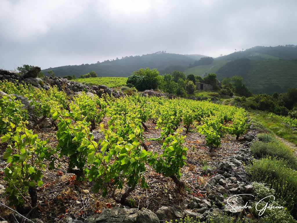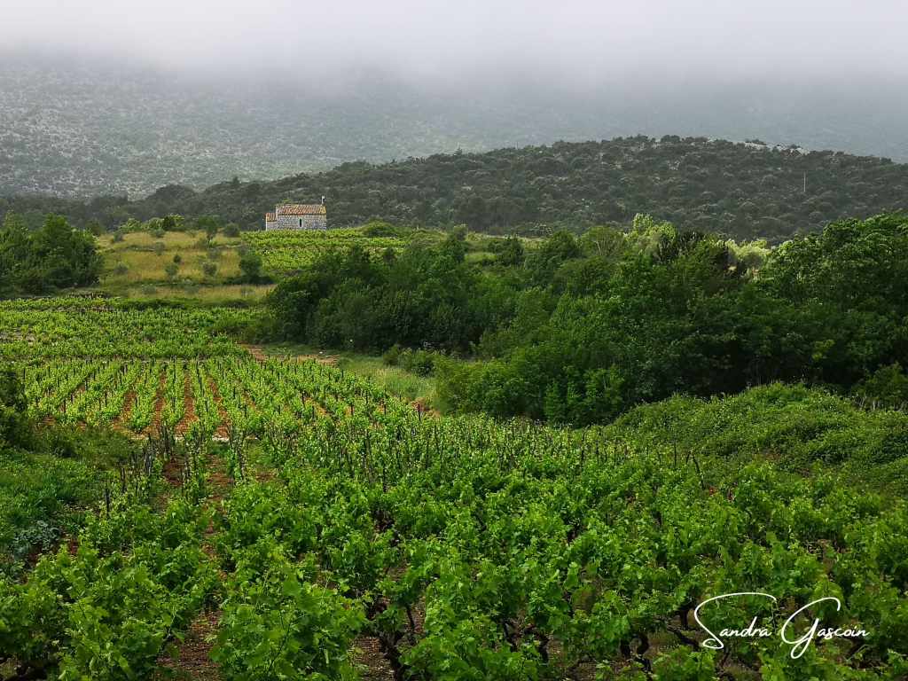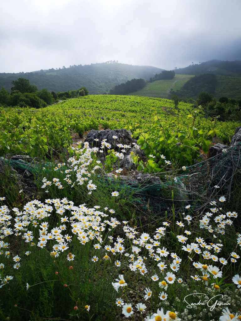 Le ciel s’obscurcit, alourdi par des nuages menaçants. J’avais pourtant cru que le vent les aurait chassés, mais il n’a fait que les remplacer par d’autres, plus sombres encore. Je progresse à travers des coteaux plantés de vignes, où çà et là, des touffes de marguerites blanches et jaunes ou d’éclatants coquelicots rouges éclatent parmi le vert uniforme du paysage.
