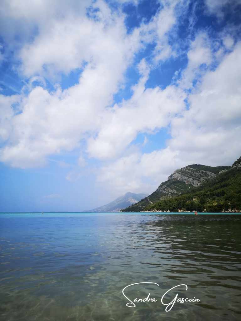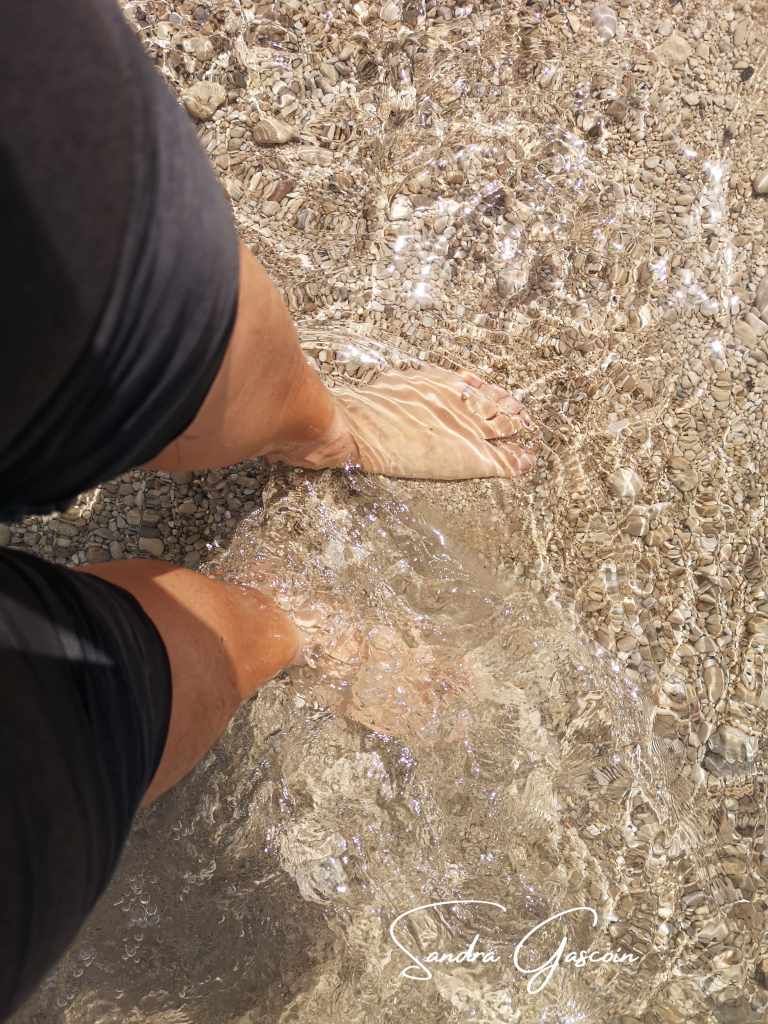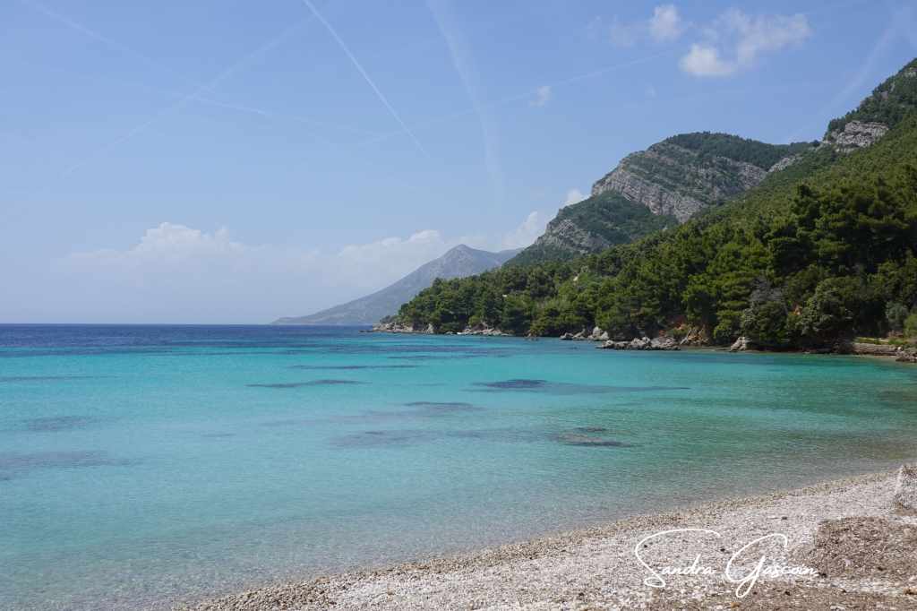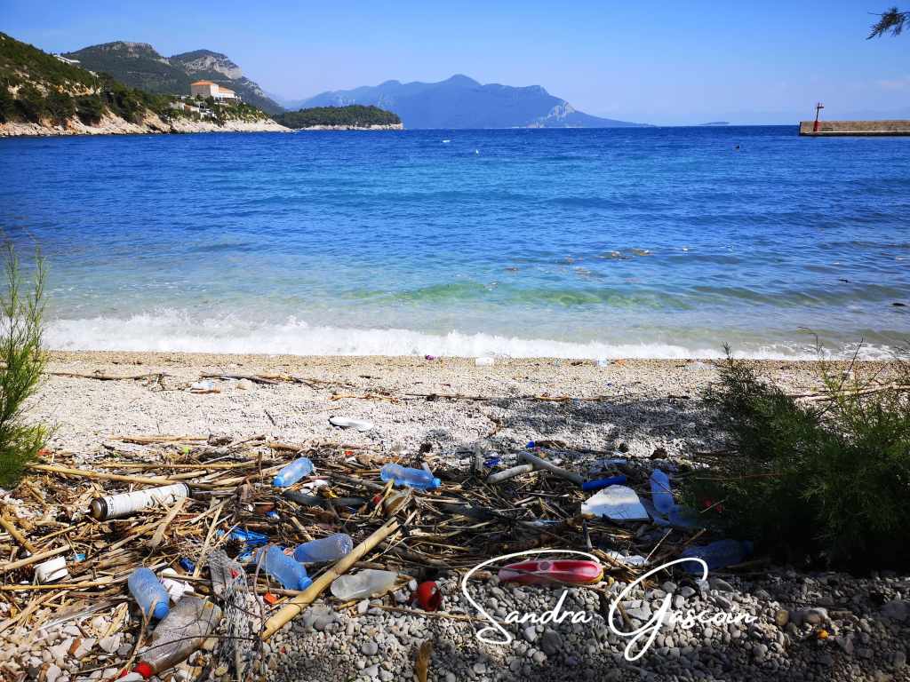 À midi, j’arrive dans la petite localité assoupie de Žuljana. Je m’achète deux tomates et une boisson fraîche à la superette Studenac, unique commerce ouvert et seul signe tangible de vie dans ce village endormi. L’étroite bande de sable et galets qui sert de plage est totalement exposée au soleil, en plus d’être envahie par les détritus déposés par la mer. Je déniche une terrasse en bois ombragée, où transats et meubles empilés attendent le début de la saison touristique. J’y suis à l’abri du soleil et confortablement installée (si ce ne sont les moustiques qui ont flairé l’occasion unique de s’enivrer). Je trempe mes pieds dans l’eau face à la côte que je vais suivre juste après la pause méridienne.