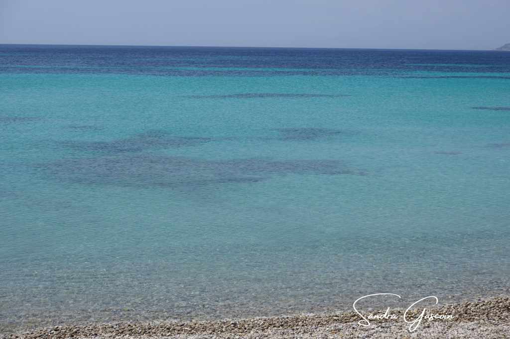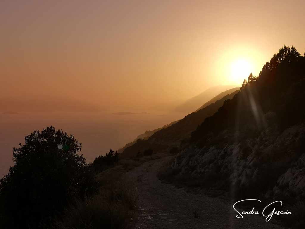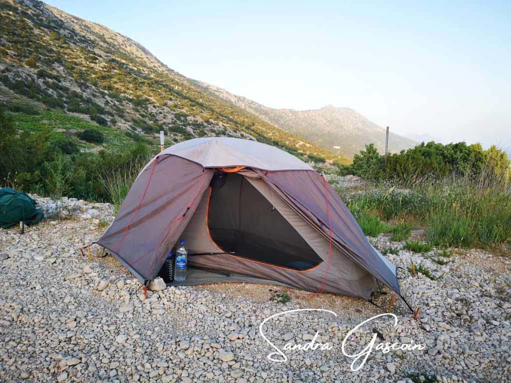 Avant de repartir, je prends soin de remplir mes bouteilles dans l’un des bars. Impossible de savoir où je vais passer la nuit, et mieux vaut ne pas manquer d’eau. La route s’élève à présent vers les hauteurs d’une barrière montagneuse. Les vignerons ont sculpté les coteaux en terrasses, soutenues par des murets de pierres. Soudain, un lièvre détale à quelques mètres devant moi, bondissant sur ses longues pattes nerveuses. J’aimerais avoir les mêmes ! Du fait des coteaux pentus recouverts de vignobles ou de rocailles, il n’y a pas vraiment d’endroit pour bivouaquer à l’abri des regards ce qui fait que je continue de marcher assez tard avant de trouver un petit bout terrain sur une piste caillouteuse et poussiéreuse. J’écarte du pied les gros cailloux afin de dégager un espace plus confortable pour m’y allonger. Le sol est dur comme du béton, une grosse pierre me sert de marteau pour enfoncer un peu mes sardines. Au moins, le vent est tombé. Le soleil couchant plonge la côte abrupte et les îles dans une lumière chaude et dorée.
