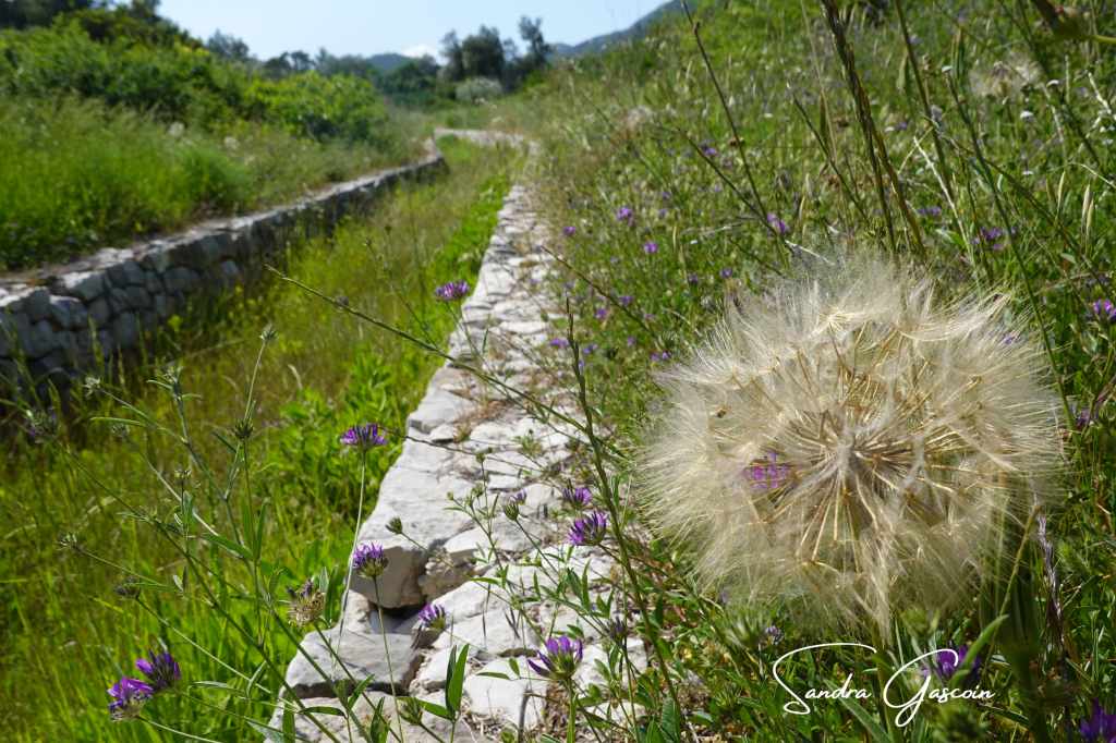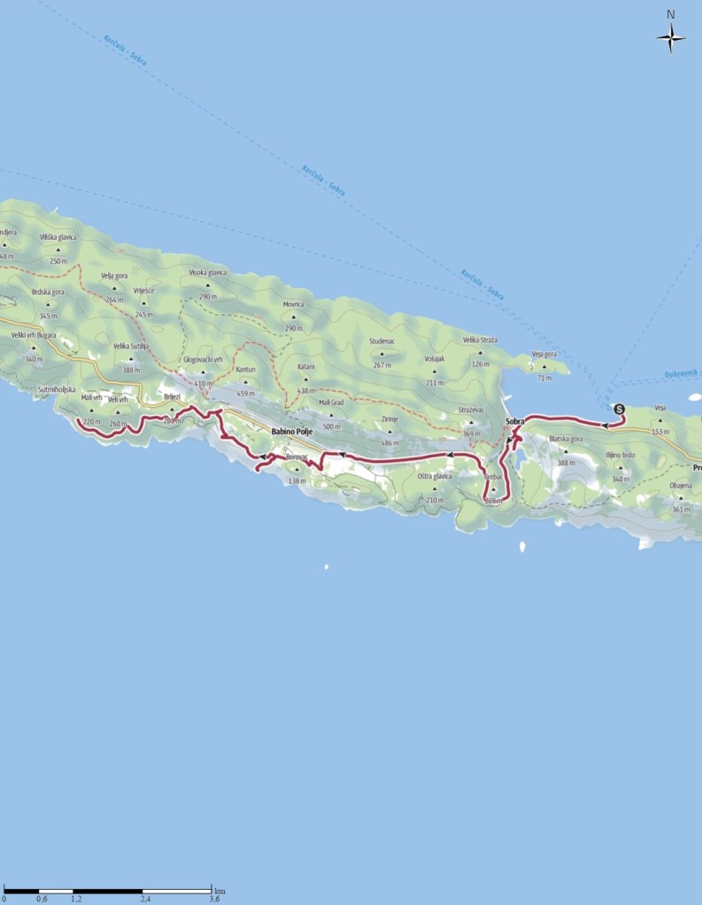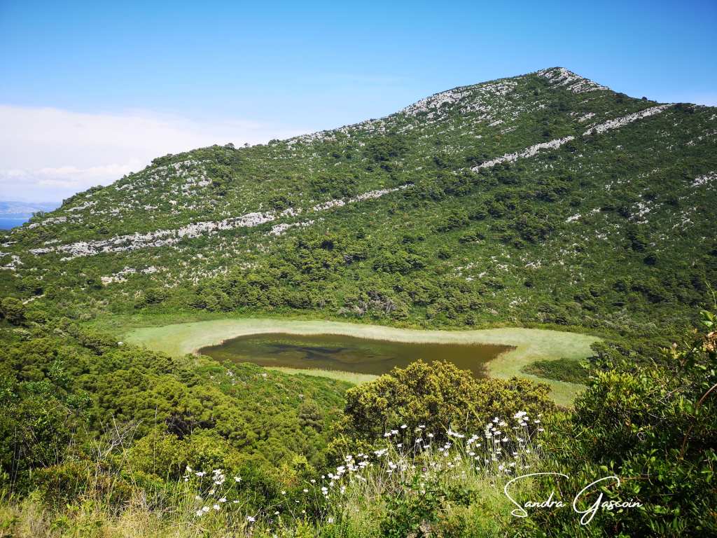 Du port remonte la route vers le village de Sobra. Je m’arrête aux panneaux informatifs qui m’apprennent que cette île fut autrefois infestée de serpents venimeux. C’est d’ailleurs une des raisons pour laquelle le gouvernement austro-hongrois voulait transférer les habitants. C’est alors que le Baron Schilling a introduit quatre couples de mangoustes pour décimer la population des reptiles. Elles ont fait un travail formidable, je n’en ai pas vu un seul. J’ai deux chemins à disposition : l’ancienne route de l’île utilisée à présent par les randonneurs. Je suis au bon endroit pourtant je n’arrive pas à le trouver. Je prends la deuxième option : passer le long d’un « blatina », un étang à l’eau saumâtre relié en son centre à la mer par deux grottes karstiques. Je descends le chemin et dépasse une cabane avec une pompe : c’est là qu’est extraite l’eau pour les quelques milliers habitants avant d’être rendue potable. Je m’aventure sous les arbres, me rapproche de la rive, je ne vois décidément pas de sentier. Est-ce ma mauvaise vue ou est-ce que le sentier n’est plus entretenu et a disparu au fil des années. J’ai encore fait chou blanc.