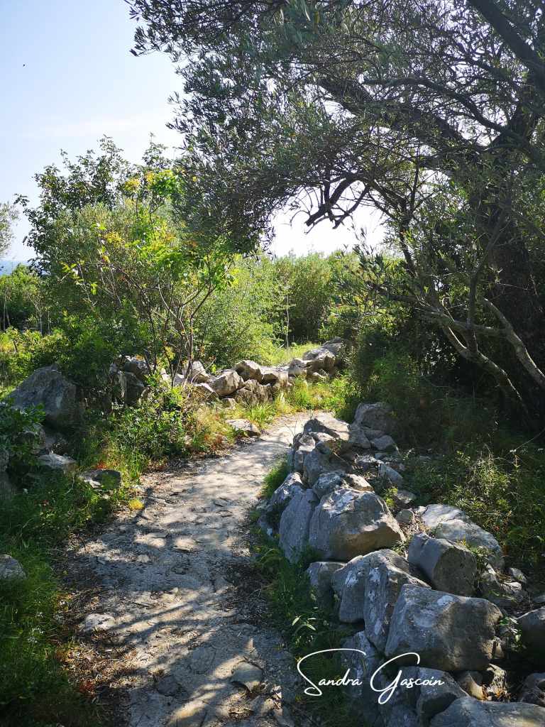 Je continue vers la grotte d’Ulysse. J’hésite à poser mon gros sac dans un coin, le sentier descend vers la mer. Tant pis, je me le traine. Arrivée sur place, la déception est grande : l’accès terrestre semble avoir disparu, la roche s’est effondrée., je ne peux pas reconnaitre de chemin. C’est un grand gouffre balayé par les flots furieux de l’Adriatique. Le vent s’est levé, le ciel s’assombrit. Le spectacle est saisissant, à la fois impressionnant et inquiétant. Quand je reviens sur mes pas, je me perds dans la multitude des sentiers créés par les touristes, je m’éloigne, je cherche, je passe à travers la végétation. Je remonte vers ma piste de tout à l’heure et traverse les vertes oliveraies.