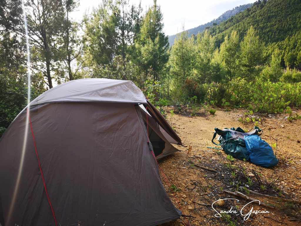 L’endroit serait parfait pour un bivouac ; j’y repère plusieurs recoins abrités. Mais je n’ai plus d’eau, il me faut rejoindre Babino Polje. Je mise sur le camping du village pour remplir mes bouteilles, mais il est fermé : la saison n’a pas encore commencé. Je poursuis alors jusqu’aux habitations et demande un peu d’eau à une femme qui jardine. Elle m’indique un robinet auquel je peux me servir. Soulagée, je peux désormais envisager ma halte pour la nuit. Retourner sur mes pas jusqu’aux oliveraies semble être la meilleure option, mais j’ai du mal à me résoudre à faire demi-tour. Je poursuis donc ma route en direction de Sutmiholjska, au bord de la mer. Au bout de presque trois kilomètres sur des flans escarpés, je bifurque sur un sentier en cul-de-sac que j’espère abandonné. Je dépasse une maison, je croise les doigts pour que ce soit la seule. La piste n’est plus empruntée depuis longtemps, les herbes hautes l’ont envahie. Je trouve enfin un espace plus dégagé, le soleil accélère sa descente vers l’horizon, je dois me dépêcher avant la nuit noire. Je plante mes sardines dans cette terre sèche et dure comme du béton. Je me sers d’une pierre comme d’un marteau pour frapper plus efficacement sur la sardine. Mon campement installé, je fais une rapide toilette de chat avant de profiter une dernière fois du panorama. À vingt heures, le soleil s’éteint dans un éclat doré. Il est temps de se reposer.