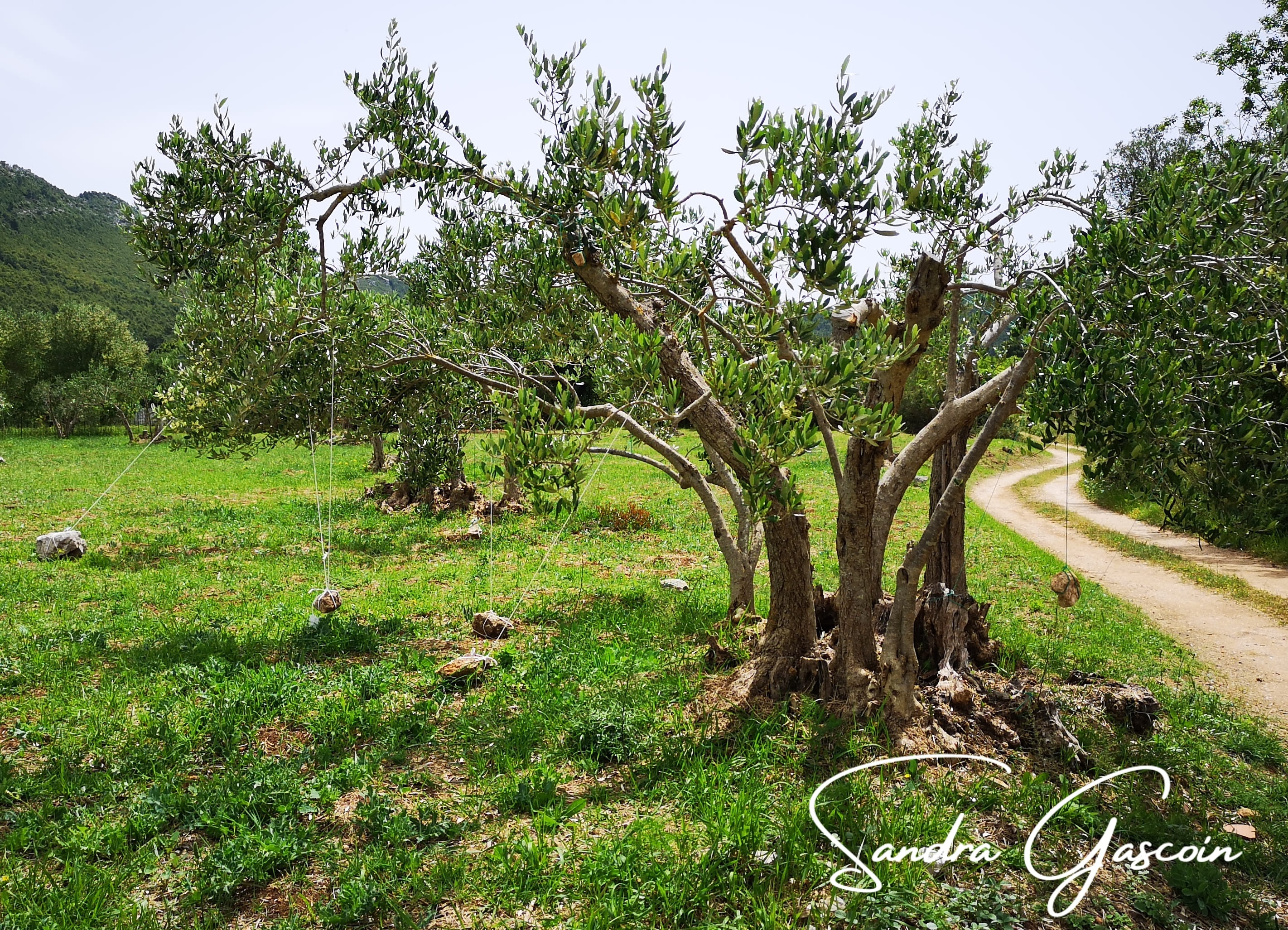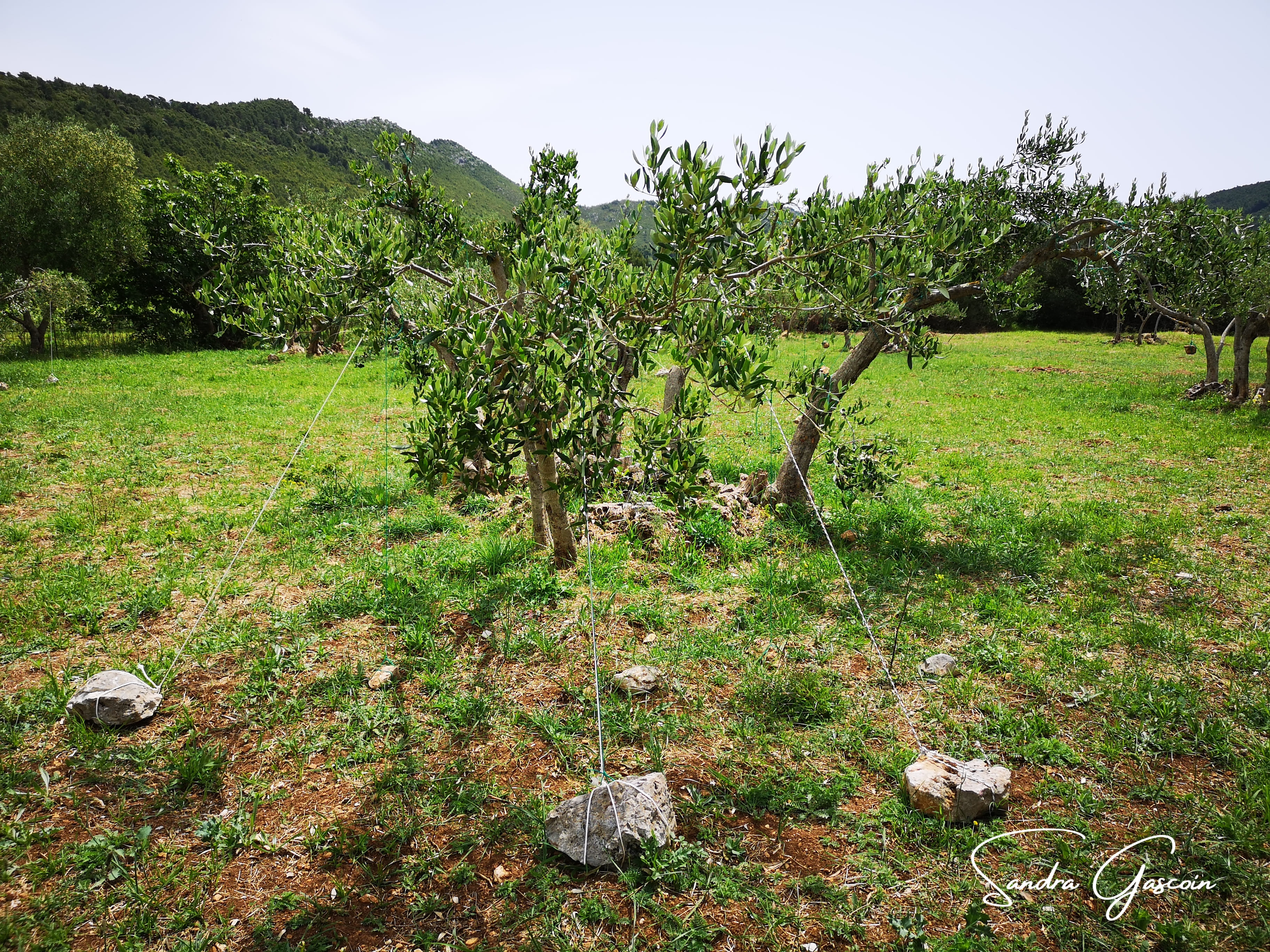 À Prapatno, je reprends la route empruntée à l’aller et retraverse les oliveraies. Un détail me frappe : quelque chose que je n’avais pas remarqué auparavant… ou peut-être avais-je suivi un autre chemin ? Dès mon arrivée en Croatie, j’avais observé que les oliviers arboraient une silhouette particulière, leurs branches tombant en se courbant à la manière des saules pleureurs. Je m’étais demandé ce qui pouvait en être la cause. Aujourd’hui, j’obtiens ma réponse : les paysans attachent l’extrémité des branches à de lourdes pierres au sol à l’aide de cordes, leur conférant ainsi cette forme si caractéristique.