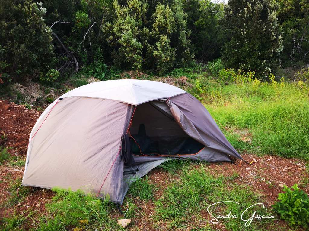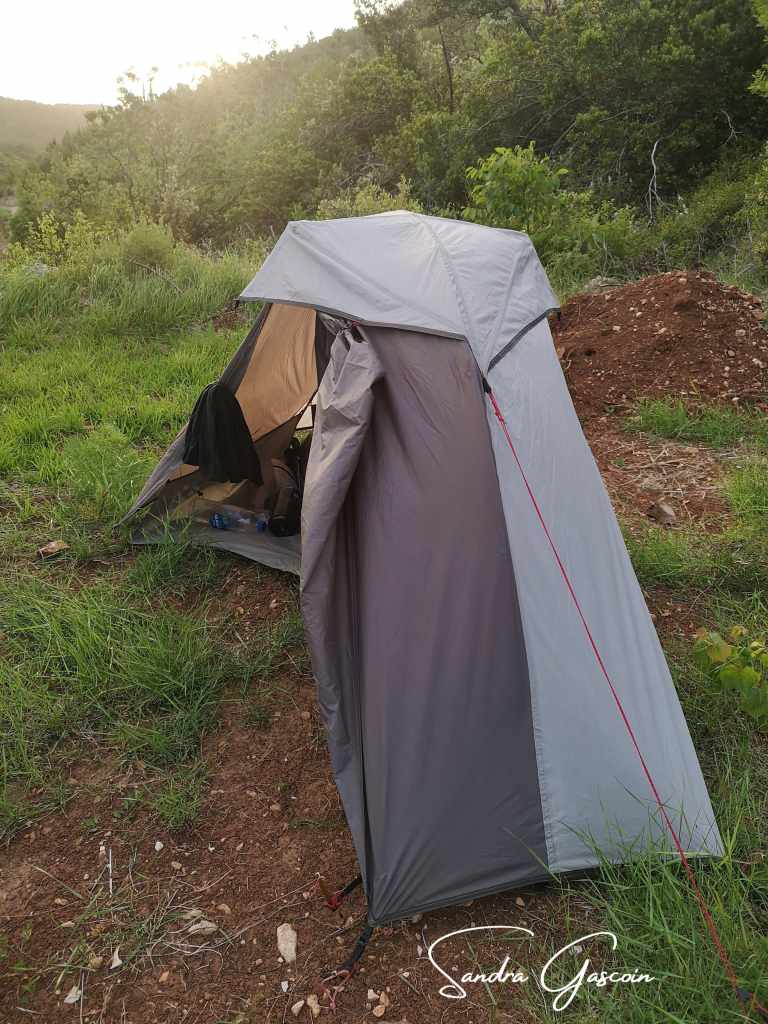 Finalement, le sentier débouche sur une large piste poussiéreuse qui serpente en direction du parc éolien. Les turbines, mues par un vent constant, dominent le paysage. Le jour décline, il est temps de trouver un petit coinoù passer la nuit. Mais le vent est décidément trop fort. Bien qu’au pied des éoliennes, le terrain soit plat et dégagé, je préfère redescendre et chercher un site plus abrité. J’aimerais aussi profiter du coucher de soleil. Ce soir, cependant, l’endroit idéal se refuse à moi. Je me résous à dormir dans le vent. Après quelques recherches, je trouve un terrain verdoyant, apparemment désert, offrant une cachette relative aux regards des rares passants empruntant la piste. Avant d’installer mon bivouac, je prends soin de m’assurer qu’aucun serpent ne rôde dans les parages. Puis je plante fermement mes sardines dans le sol, espérant qu’elles résisteront aux bourrasques nocturnes. Assise face au soleil couchant, je savoure mon repas du soir, bercée par le souffle du vent.