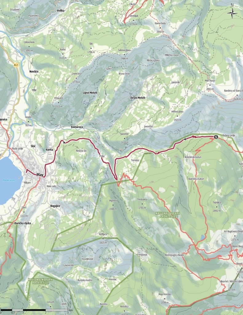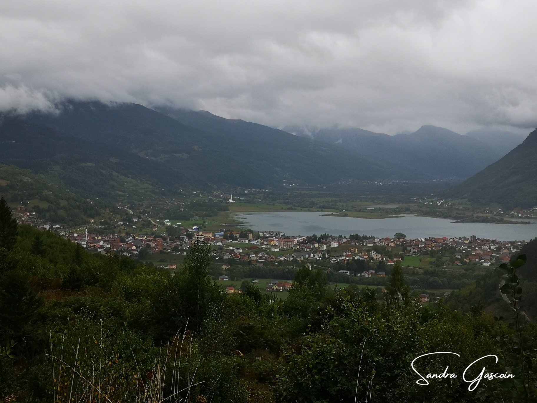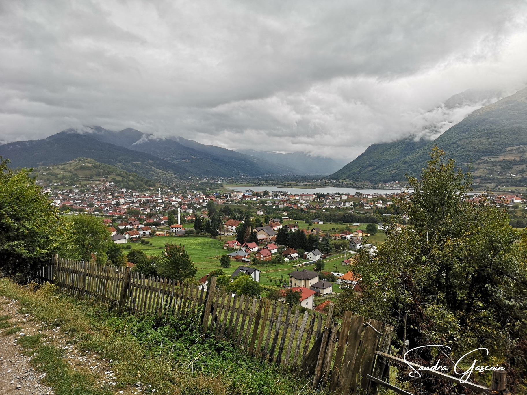 Marcher jusqu’à Plav se fait sans effort. Je passe des pâturages avec des cabanes en bois. J’atteins la localité à midi exactement. La rue principale est en travaux, cela me rappelle ma courte visite à Gusinje en juin, la ville voisine, elle-aussi dans le même étar. Je fais mon ravitaillement, je passe à la banque, je cherche un réseau gratuit sans succès. Je me décide à m’installer au chaud dans un café-restaurant avec internet. Je me commande un thé noir et une part de gâteau au chocolat. En voulant faire couler mon miel dans le thé, je réussis à tout renverser, c’est la catastrophe. Je sauve mon téléphone posé sur la table, j’essaie de retenir le liquide mais tout tombe par terre. Je hèle catastrophée le serveur qui vient à mon secours. Il remplace la boisson mais n’a plus de thé noir, il me propose thé au gingembre. Beurk !