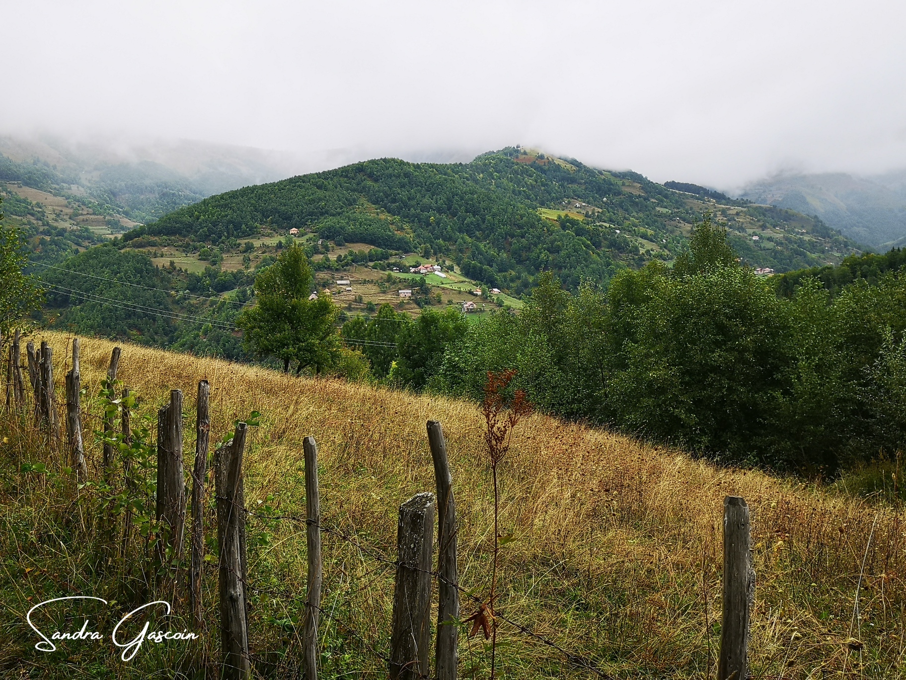 Je prends mon temps pour le petit-déjeuner, espérant que mes affaires sècheront avant mon départ. Mais le vent est absent, le soleil aussi, et, comble d’ironie, une pluie fine reprend. À 9h, je me remets en route. Face à un ciel menaçant et des nuages bas, je décide de modifier mon itinéraire et renonce à l’ascension vers le lac. Je n’ai aucune envie de patauger dans un sentier boueux et glissant pour un panorama noyé dans la brume. Je préfère emprunter une route qui s’apparente davantage à une piste. La pente est rude, mes adducteurs me le rappellent douloureusement – séquelle tenace de la première étape du Peaks of the Balkans. Après une demi-heure de marche, je tombe sur un abri touristique doté d’une fontaine. J’aurais été bien plus au sec ici qu’à l’auberge de Hako. Je devrais apprendre à mieux écouter mon instinct, hier déjà j’avais envie de poursuivre ma route…