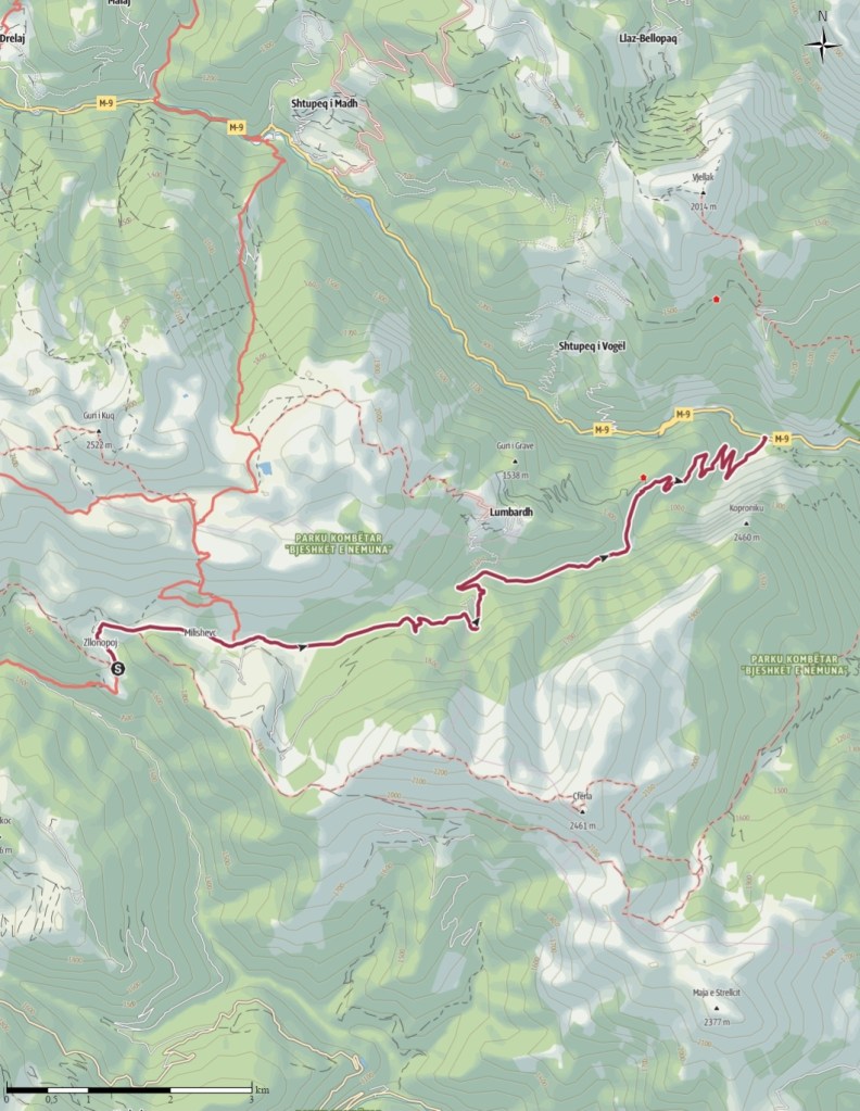 Après le hameau Rekë et Allagës, c’est sur un sentier peu balisé que je continue entre forêt et prairie. J’arrive en fin d’après-midi à l’endroit où j’ai rejoint six jours plus tôt le parcours Peaks of the Balkans. Un rayon de soleil transperce la couverture nuageuse pour me féliciter.