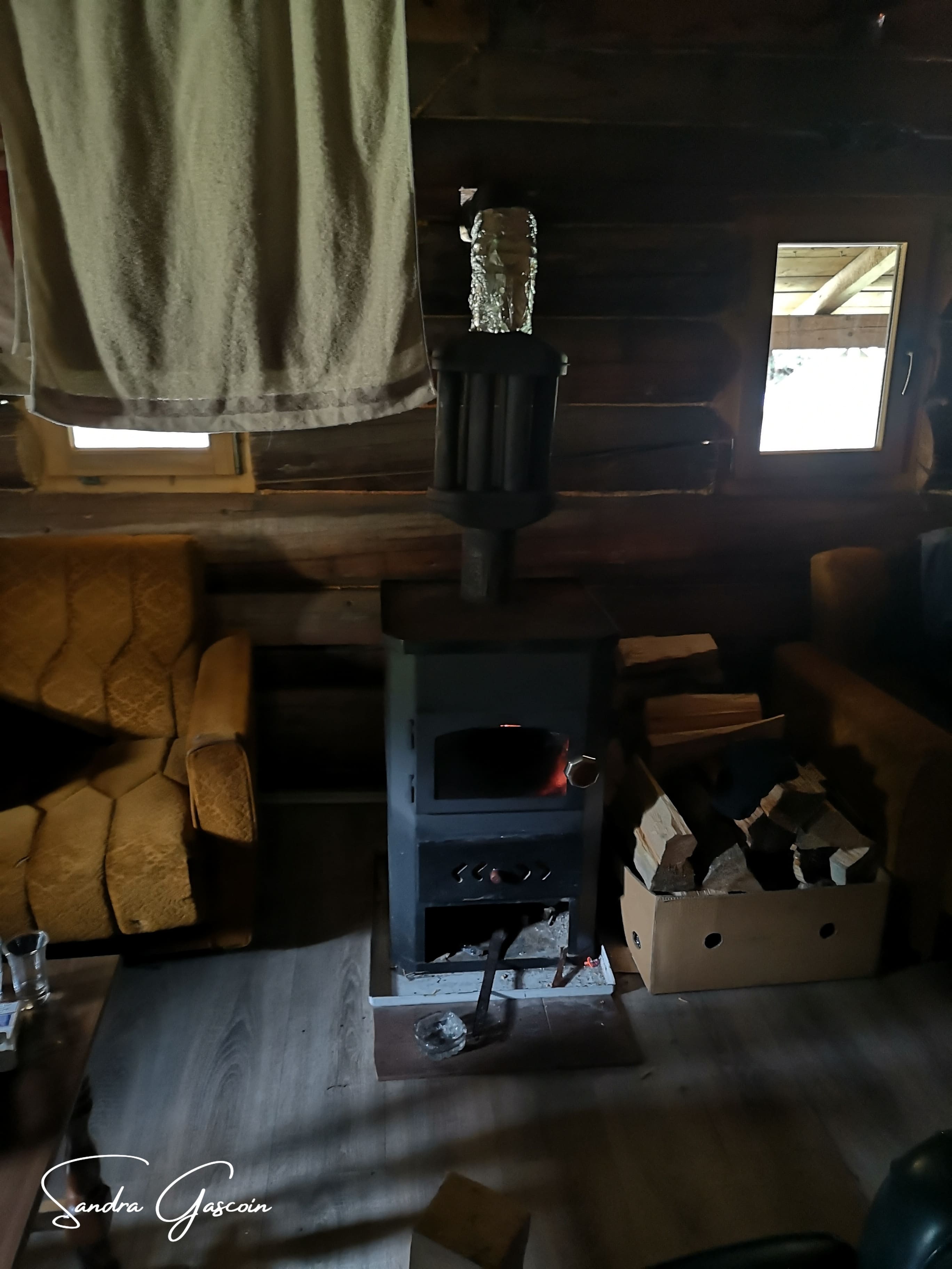 Le bruit de la hache coupant les bûches me tire de mes rêves, le propriétaire s’active au niveau du tas de bois et rapporte quelques morceaux pour alimenter le feu dans le salon.