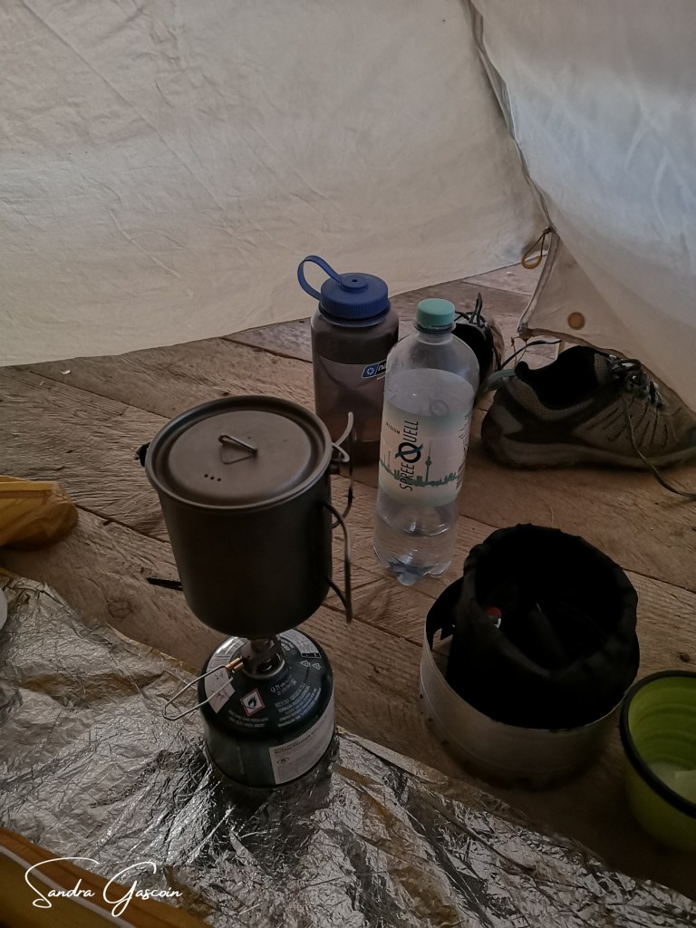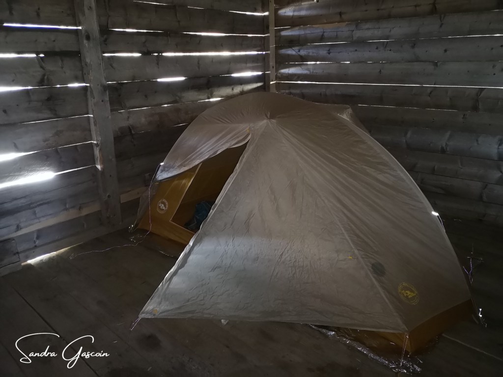 J’y monte ma tente à l’intérieur car le vent s’engouffre par les interstices entre les planches. Ma couverture de survie placée sous la tente devrait me procurer une isolation supplémentaire. Je cuisine à l’abri de mon abside, ce qui permet de chauffer un peu l’intérieur de ma tente. La nuit s’annonce paisible malgré les rafales de vent et le frottement des branchages contre la toiture.
