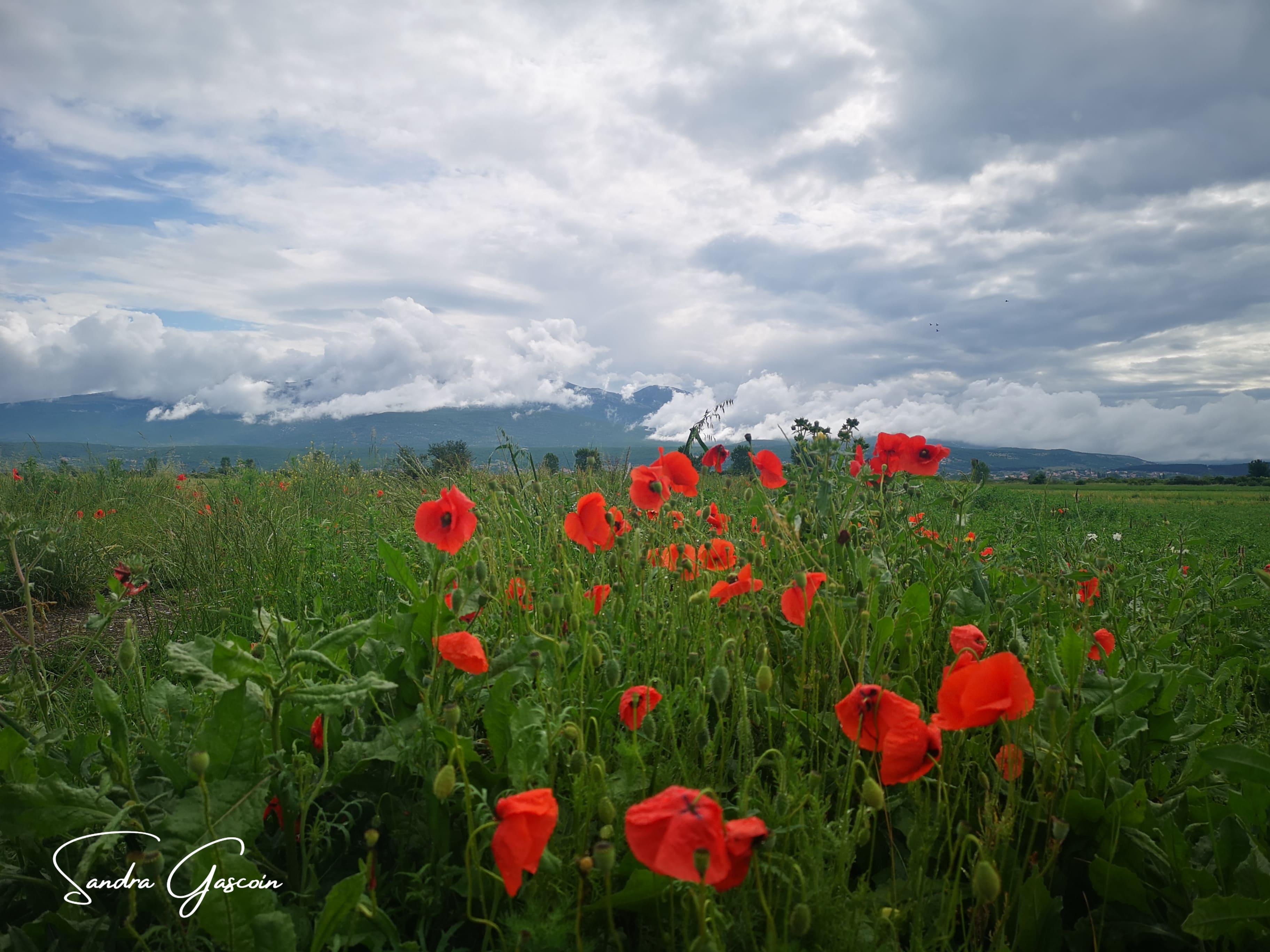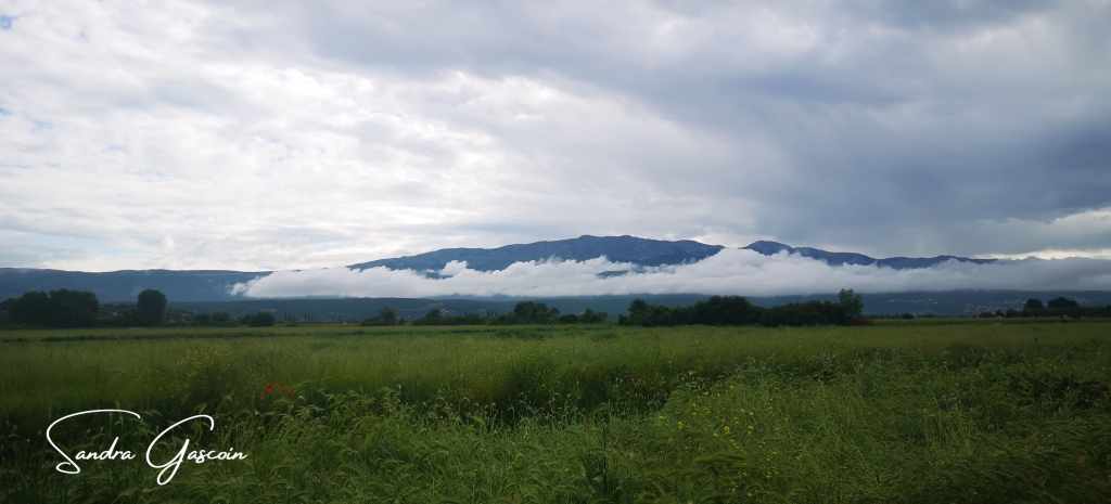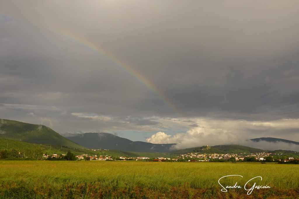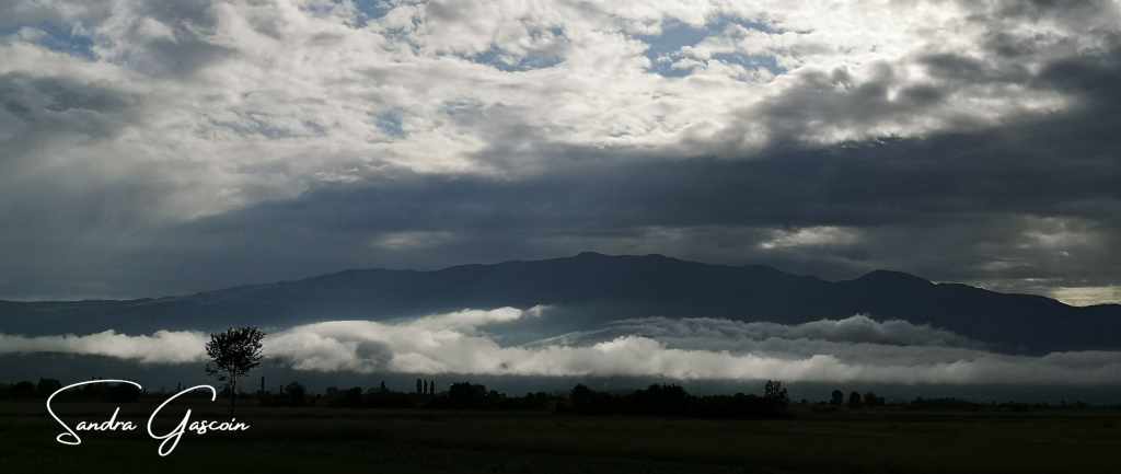 Lorsque je jette un coup d’œil en dehors de mon habitacle, le ciel chargé n’est pas engageant : le soleil perce par intermittence entre l’épaisse masse nuageuse, un arc-en-ciel se dessine timidement, des lambeaux de brumes s’accrochent aux collines, le brouillard brille sous les grosses nuées sombres, quelques éclats de bleu percent çà et là la morosité céleste, faible lueur d’espoir en une journée clémente.