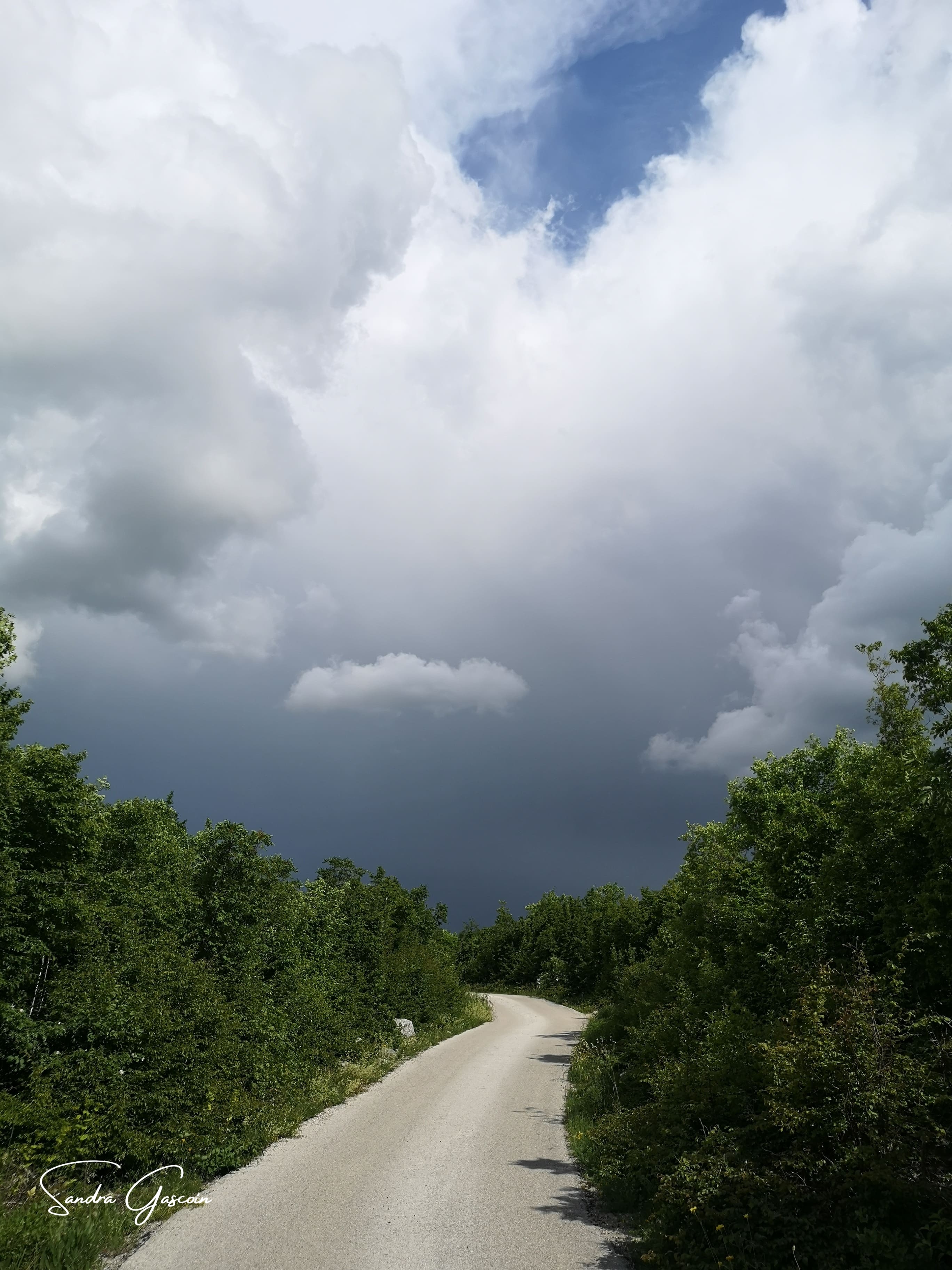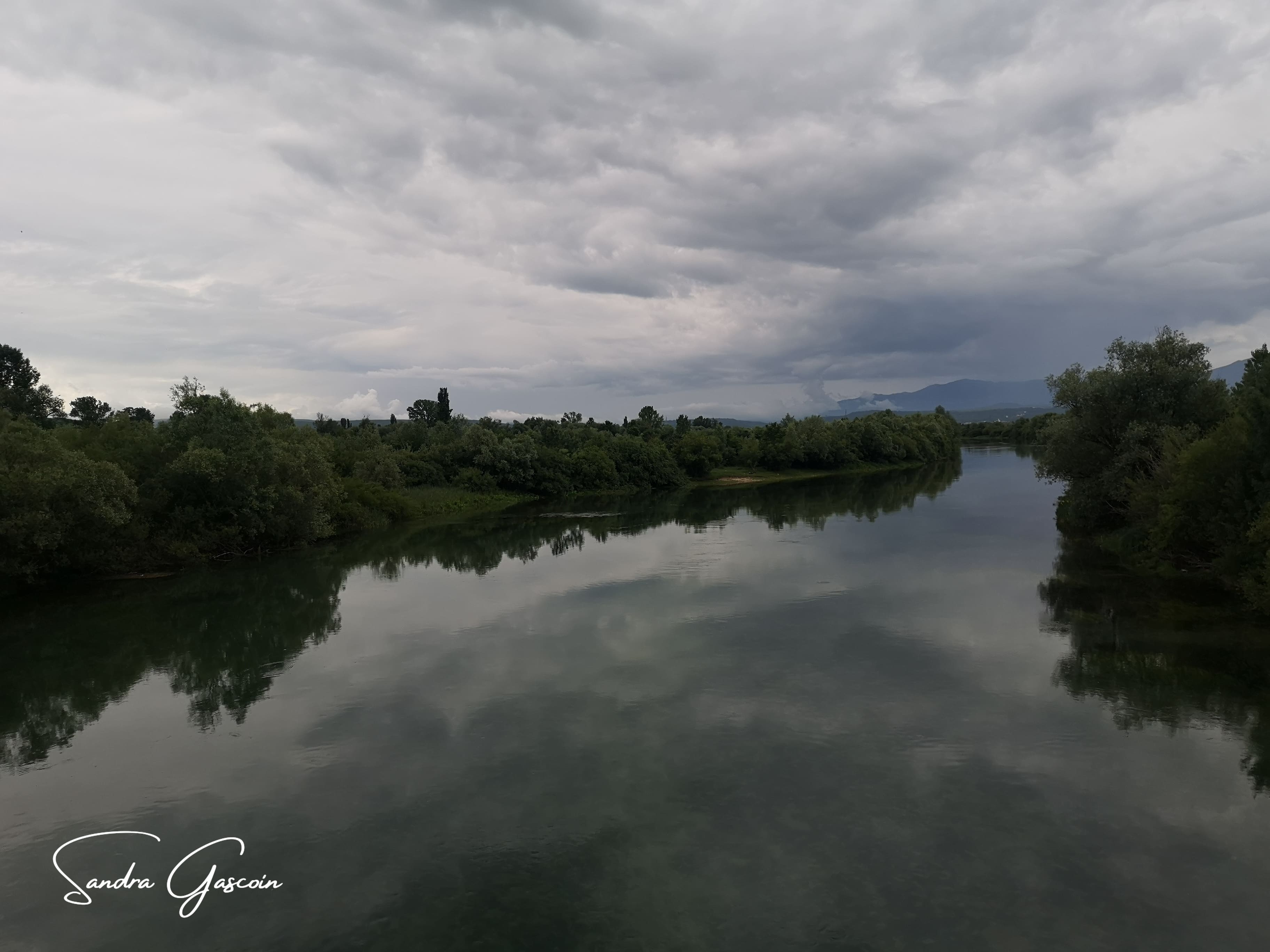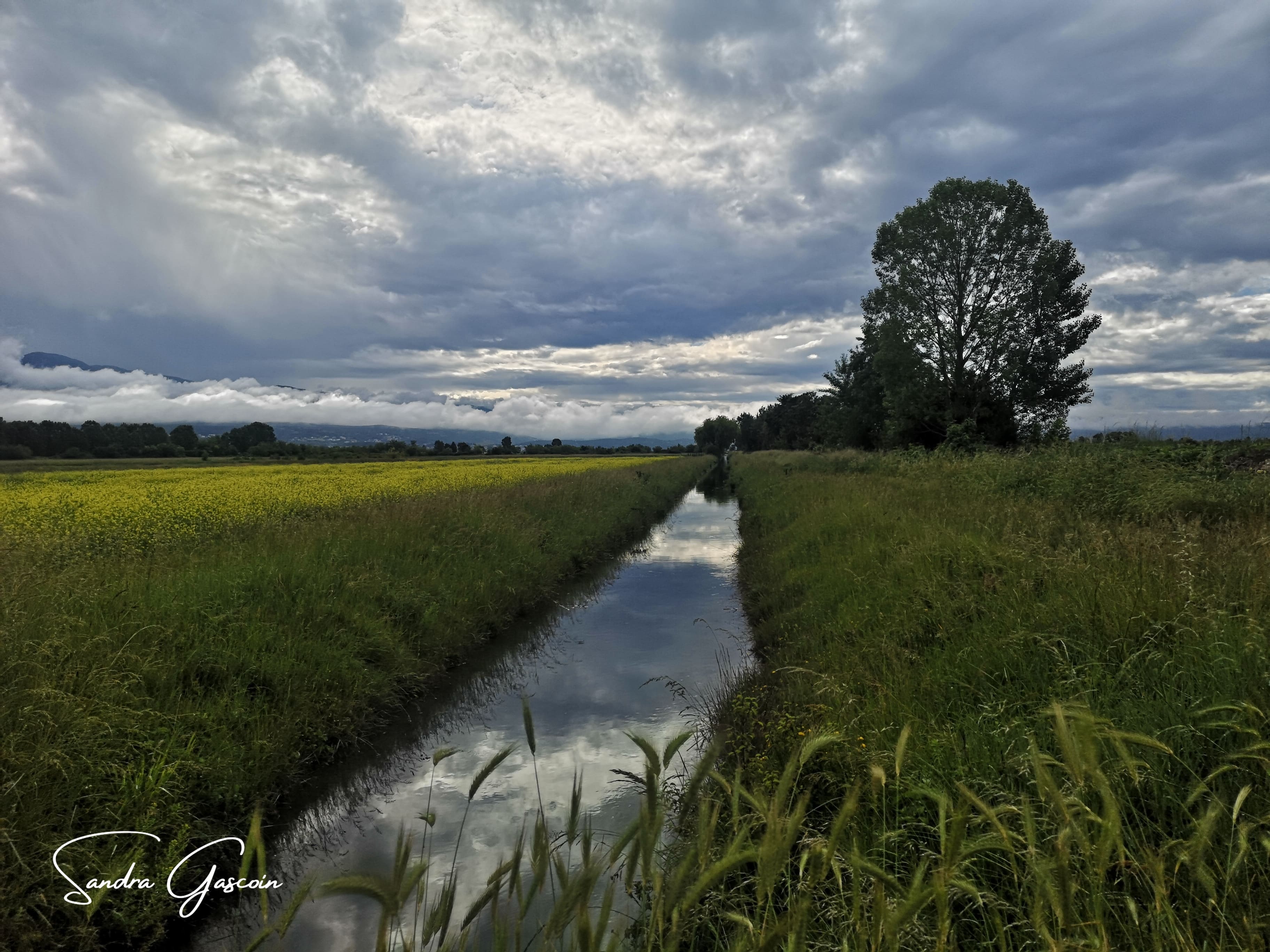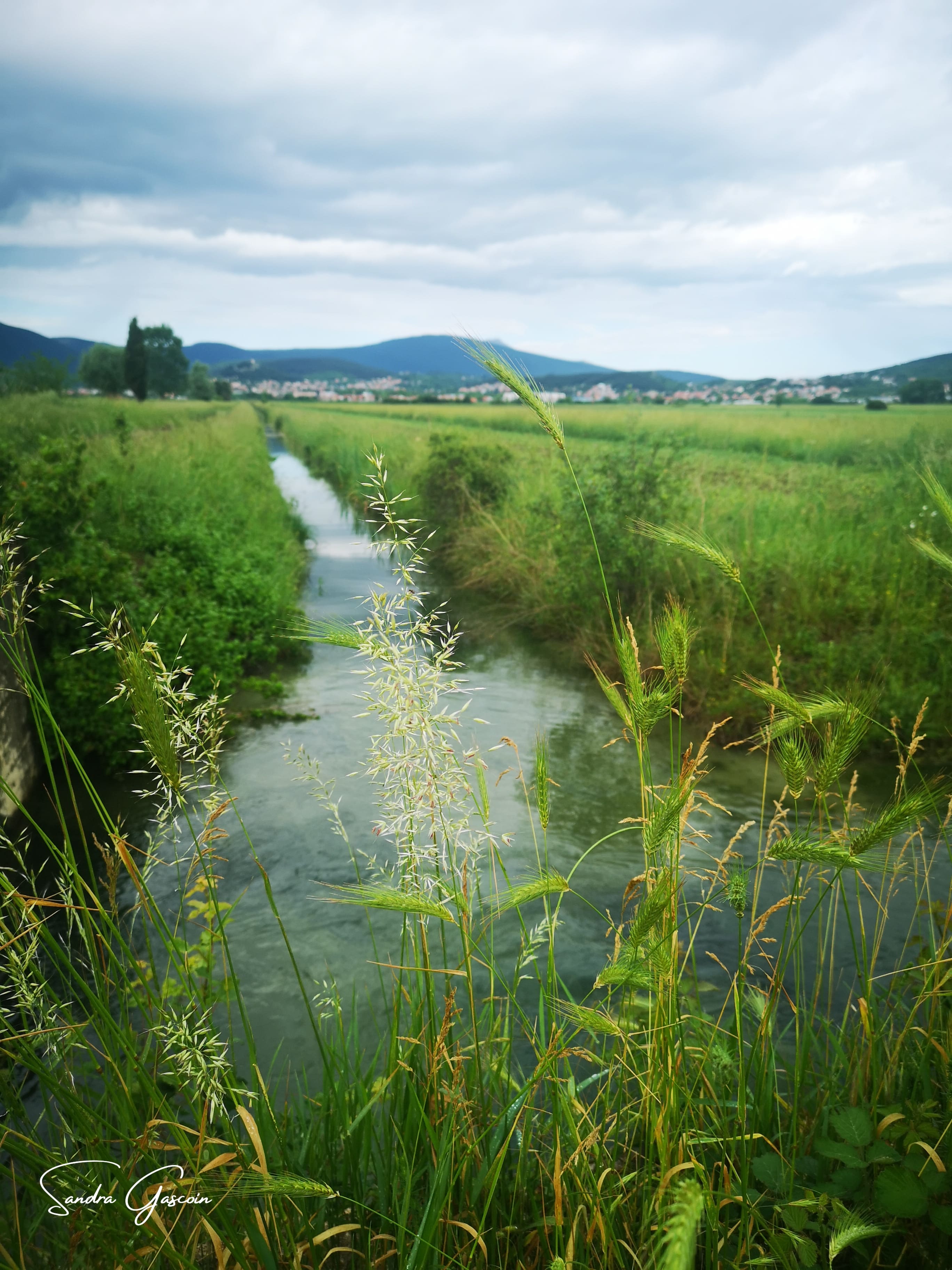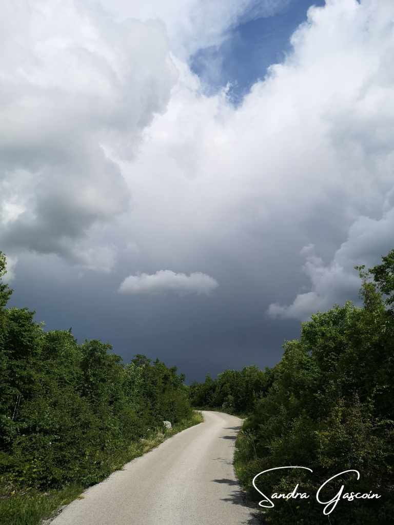 N’étant pas directement sur le White Trail, je dois le rejoindre pour passer la frontière bosniaque. J’emprunte un chemin boueux le long d’un fossé, le genre de petit canal qui parcoure la vallée de la Cetina pour alimenter les champs. Après quelques pas, la boue collée à mes semelles m’élève de quelques centimètres, alourdissant mes pas ! Ça colle, ça glisse, je tente de me délester dès que je trouve une touffe d’herbe. Malgré ces désagréments, la randonnée est plaisante et loin de la circulation. Le paysage croulant sous les nuages anthracite exhale une beauté dramatique que je tente de capturer à travers mon objectif.