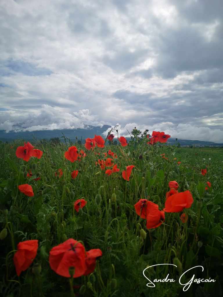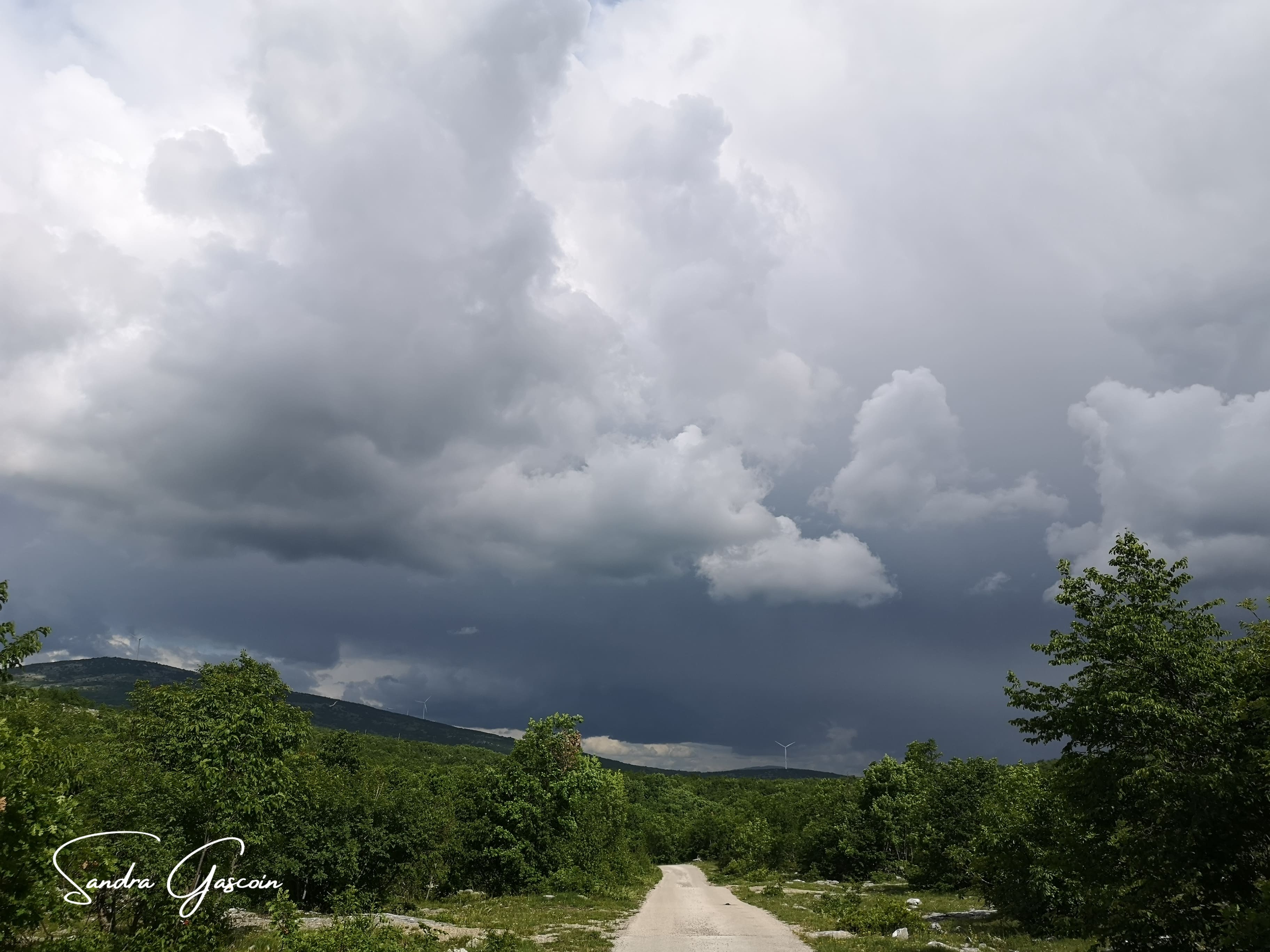 Je continue mon ascension sur cette route blanche et déserte. De part et d’autre je ne vois qu’un mur de verdure, au loin des éoliennes dressées comme des sentinelles. Le soleil cogne entre les gros nuages. Je m’arrête à un banc sur le bas-côté. J’étale ma toile de tente humide sur un espace herbeux. Le soleil et le vent vont la faire sécher rapidement. Mon pique-nique est rudimentaire : tortillas avec fromage et jambon. C’est vite préparé et ça remplit le ventre. Mes réserves d’eau s’amenuisent inexorablement, il va falloir que je demande dans un hameau dès que possible. Justement, quelques maisons apparaissent au détour du chemin. L’une d’elles semble habitée, une voiture stationnée devant. Je pose mon sac sur un muret, en extrais deux bouteilles vides et me dirige vers l’entrée. Je suis accueillie silencieusement par trois gros chiens. L’un d’eux se met alors à m’aboyer dessus, les autres s’accordent, Une décharge d’adrénaline fuse dans tout mon corps. Sans mes bâtons laissés avec mon sac à dos. Heureusement, les propriétaires alertés sortent de leur maison. Je demande de l’eau en montrant mes bouteilles. Un des deux gars chasse à coups de bâton le chien à l’origine des aboiements en disant « he’s crazy ». J’imagine que les coups de bâtons n’arrangent pas le comportement de ce chien qui, même si j’en ai la frousse, me fait vraiment et surtout de la peine. Je récupère mes deux bouteilles, remercie, retourne à mon sac, accompagnée par le gars au bâton. Le chien « fou » ayant fait le tour de la maison et m’observant à distance respectable. Ne demandant pas mon reste, je prends mes jambes à mon coup, autant que cela est possible quand on est bien chargé.