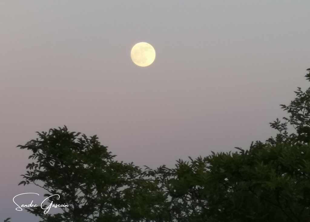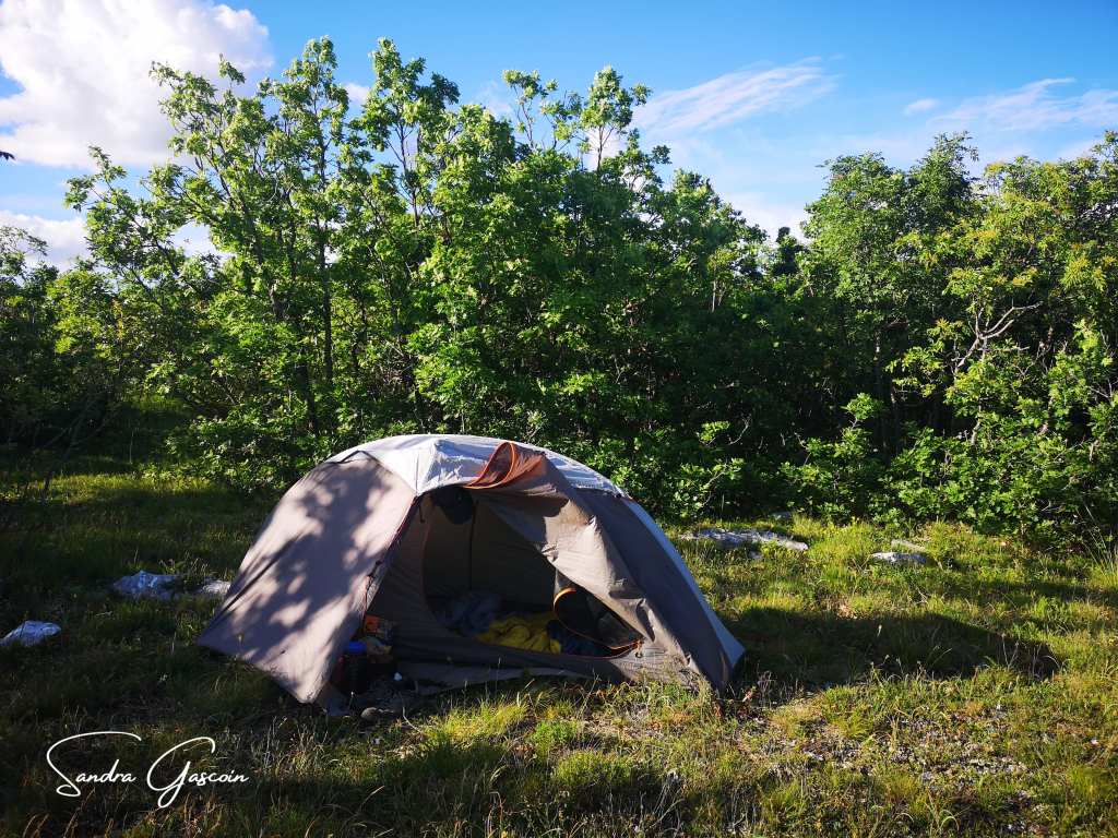 De nouveau seule sur la route, j’avance droit vers l’orage qui gronde dans un ciel d’encre. Je l’entends gronder dans le ciel noir, je ne sais pas s’il s’abattra sur moi ou s’il s’éloignera de moi. Pour l’instant, nul endroit propice pour planter la tente. Vers dix-sept heures enfin, les arbres qui auparavant formaient un mur infranchissable de chaque côté du chemin s’espacent et libèrent des parties herbeuses. Il ne me reste plus qu’à dénicher un recoin discret, à l’abri des regards. Juste avant le parc à éoliennes, je trouve l’endroit idéal. Ma tente est montée en un clin d’œil, je profite encore du soleil les doigts de pieds en éventail et savoure un bon thé chaud. Il semble que j’ai de la chance avec la météo. L’orage, finalement, m’épargnera. La pleine lune éclatante viendra d’ailleurs m’honorer de sa présence. Une nuit tranquille en perspective !