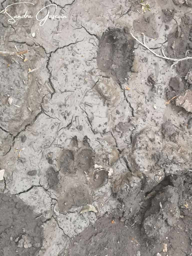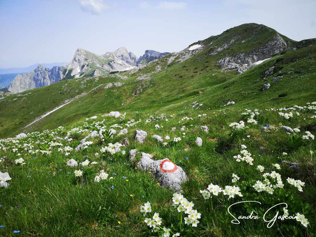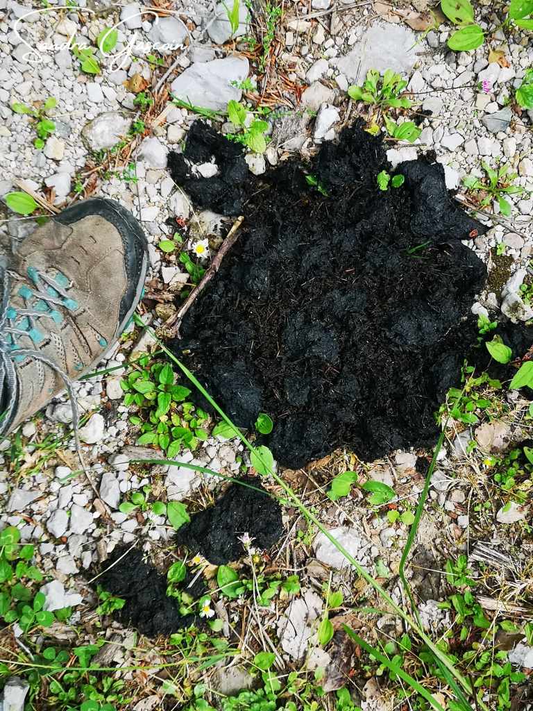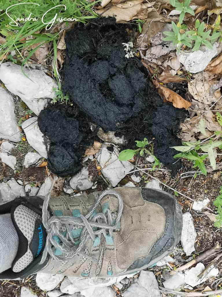 Je profite un peu de la sérénité du col. Des milliers de bouquets de pulsatilles blanches tapissent les prairies moussues. Des sommets rocheux déchirent ce joli vert printanier, se dressant de manière anarchique dans toutes les directions. Un certain contentement m’envahit doucement. J’en oublierais presque la course du soleil qui se poursuit inexorablement vers l’horizon. Je dois me remettre en route si je ne veux pas être en difficulté dans la nuit. La descente qui m’attend ne va pas être sans difficulté. Les flancs rocailleux du massif ralentissent la progression. J’ai effectivement l’impression de faire du surplace. Alors que je pense avancer d’un bon pas, mon application m’indique le contraire. Les centaines de mètres jusqu’à un embranchement crucial s’égrènent lentement. Je désespère d’y arriver. La descente dans les pierres requiert ma plus grande concentration. Le nez plongé vers le sol, je ne peux pas louper à nouveau un tas d’excréments noirs assez frais. La taille est impressionnante, je documente par une photo souvenir.