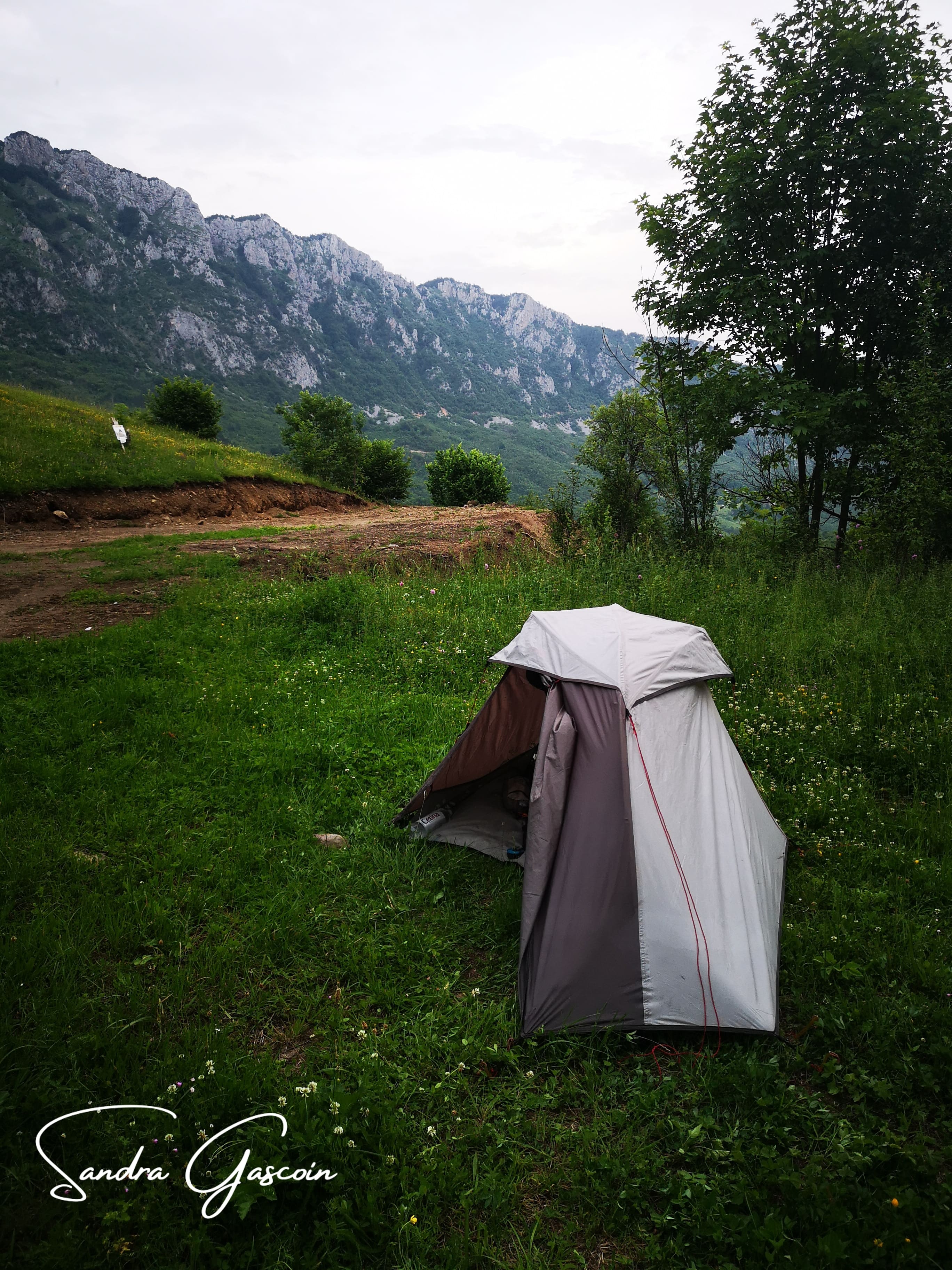 Vers 18h15 j’arrive enfin à un hameau. Je me pose à l’abri touristique. Il est équipé d’ustensiles pour se faire un café ou un thé. Je trouve donc un réchaud à gaz, un briquet, des sachets de thé ou une boite de café, ainsi que la vaisselle nécessaire (verres, tasses, assiettes, et la « džezva », la fameuse cafetière au long manche en acier inoxydable ou en cuivre pour le café bosniaque). L’abri est construit au-dessus d’un ruisseau. Les habitants y ont installé un bac creusé dans un tronc d’arbre, celui-ci est alimenté en eau fraiche. J’y trouve des boissons fraiches. C’est ce que j’appelle de la « Trail magic », même si ce n’est pas gratuit ici. Ça fait du bien !! Je glisse une pièce dans la caisse. Cet échange est basé sur la confiance puisque l’argent traine depuis un moment dans la caisse ouverte. Je profite du ruisseau pour y plonger mes pieds jusqu’aux genoux. Ça vivifie ! Je décide de planter ma tente dans le coin. Je peux donc déjà me faire à manger, profiter du toit et de l’assise. Quelques habitants passent en voiture, nous nous saluons de la main. Ils ne sont pas plus curieux que ça, aucun ne s’arrête. Cela veut dire que personne ne s’inquiète de voir une randonneuse à une heure si tardive dans le coin et de savoir où elle va dormir. Cela m’arrange car je plante la tente sur une sorte de terrasse juste au-dessus de l’abri. Je n’aime en règle générale pas dormir si près des habitations. La journée touche à sa fin. Le mieux est de rester sur place et de profiter de l’hospitalité des gens.