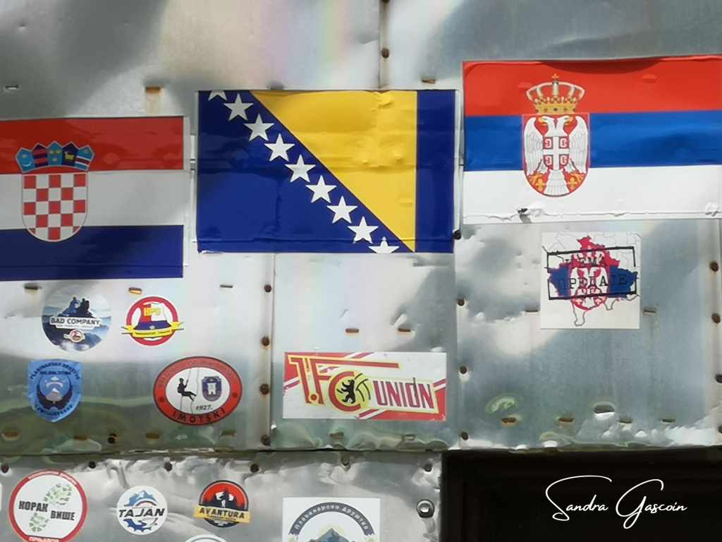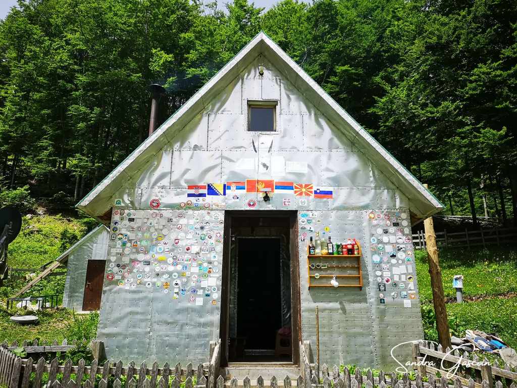 Il est installé sur la terrasse sous un parasol. Je paie mon dû et lui tends mon passeport : il inscrit les informations sur un cahier. Peut-être exerce-t-il également la fonction de douanier ? Je ne le saurai pas, il ne parle pas anglais. Il désigne mon gros sac et le soupèse, je lui explique que je marche sur la Via Dinarica, il a l’air impressionné et tâte mes biceps. Jusqu’à preuve du contraire, je marche sur mes deux jambes, ce sont les mollets qui sont durs, mais je suis pour l’instant encore un peu fatiguée de la dernière montée que je me laisse faire. Mieux vaut qu’il tâte les biceps qu’autre chose. Pendant qu’il consigne mes données personnelles, j’observe la cabane. La façade recouverte de plaques métalliques est affublée d’une multitude d’autocollants, je reconnais celui du club de football Union de Berlin. Je les chasse depuis le début de mon séjour dans les Balkans. Ces fans d’Union sont vraiment passés partout !