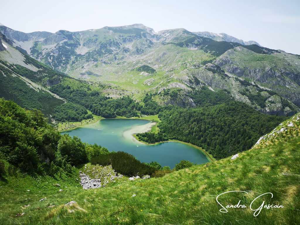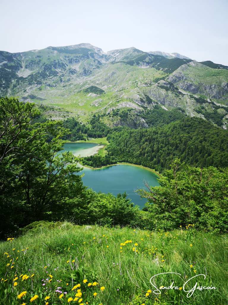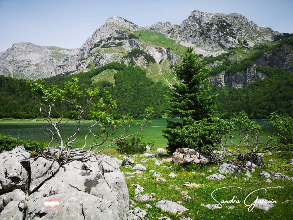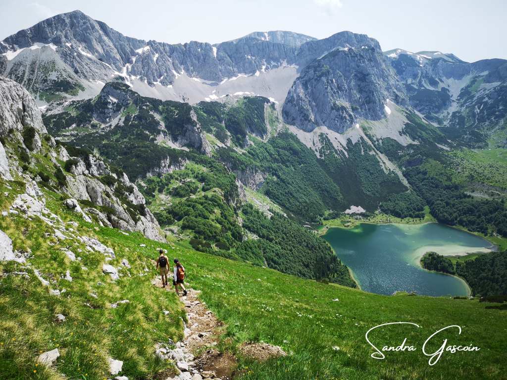 La randonnée est vraiment agréable, je suis toute seule encore une fois, profitant de cette idylle dans les sous-bois, le chant de l’eau se mêlant aux gazouillis des oiseaux. À la sortie de la forêt, je me trouve dans une sorte de cuvette dégagée, l’étang a disparu, la frontière séparant la Bosnie-Herzégovine et le Monténégro est invisible, je la passe sans me poser de question. Juste avant d’atteindre le lac Trnovaċko Jezero, je croise la Via Dinarica et les premiers randonneurs. Ils s’interpellent à distance. Ma tranquillité s’arrête où commence la liberté des autres apparemment. J’en croise d’autres aussi chargés que moi, plongés dans leur conversation, je n’ai pas le culot de les apostropher, je pense qu’ils ne sont finalement pas en train de traverser les Balkans à pied. Ils auraient engagé la conversation comme l’ont fait les autres avec qui j’avais parlé. Ils sont plutôt en vadrouille pour le week-end. Un peu plus loin, je rencontre le couple d’Allemands qui voyagent à bord de leur mastodonte. Ils ont déjà escaladé tous les sommets et retournent à leur véhicule. Je suis persuadée qu’ils ont garé leur engin au bout de la route qui remonte vers le refuge du Prijevor. Ils n’ont pas pu monter depuis la vallée comme moi. On échange quelques mots avant de nous séparer définitivement.