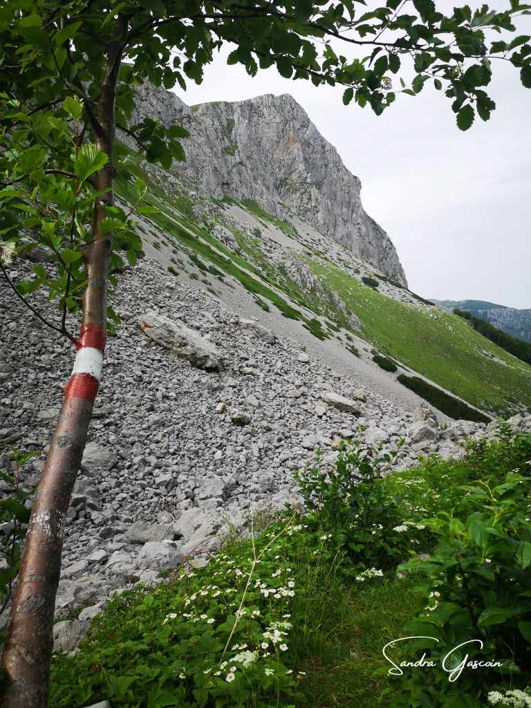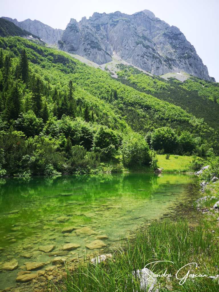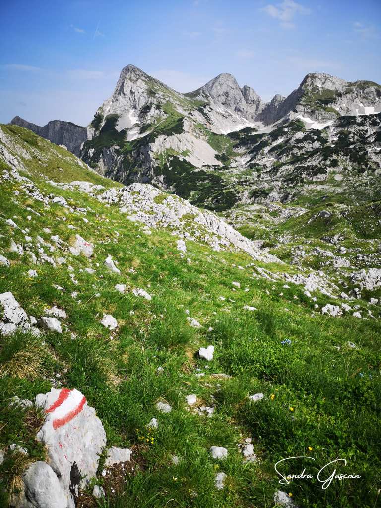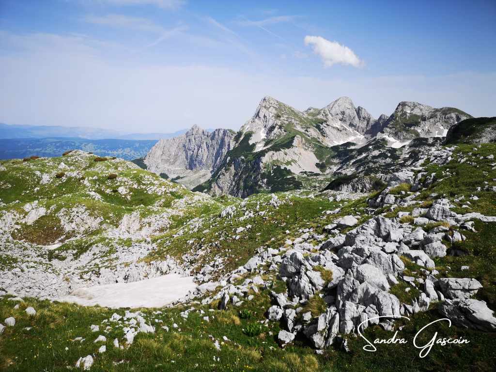 La randonnée est vraiment agréable, je suis toute seule encore une fois, profitant de cette idylle dans les sous-bois, le chant de l’eau se mêlant aux gazouillis des oiseaux. À la sortie de la forêt, je me trouve dans une sorte de cuvette dégagée, l’étang a disparu, la frontière séparant la Bosnie-Herzégovine et le Monténégro est invisible, je la passe sans me poser de question. Juste avant d’atteindre le lac Trnovaċko Jezero, je croise la Via Dinarica et les premiers randonneurs. Ils s’interpellent à distance. Ma tranquillité s’arrête où commence la liberté des autres apparemment. J’en croise d’autres aussi chargés que moi, plongés dans leur conversation, je n’ai pas le culot de les apostropher, je pense qu’ils ne sont finalement pas en train de traverser les Balkans à pied. Ils auraient engagé la conversation comme l’ont fait les autres avec qui j’avais parlé. Ils sont plutôt en vadrouille pour le week-end. Un peu plus loin, je rencontre le couple d’Allemands qui voyagent à bord de leur mastodonte. Ils ont déjà escaladé tous les sommets et retournent à leur véhicule. Je suis persuadée qu’ils ont garé leur engin au bout de la route qui remonte vers le refuge du Prijevor. Ils n’ont pas pu monter depuis la vallée comme moi. On échange quelques mots avant de nous séparer définitivement.
