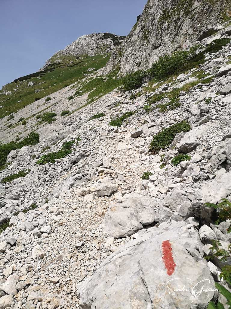 Le gardien veut savoir si je dors ici, je n’avais pas envisagé cette possibilité. Je n’avais pas imaginé non plus voir autant de randonneurs, je suis prise de cours. Je lui dis non. Par contre je vais m’installer un peu plus loin pour pique-niquer à une table en bois. La pause me fait du bien. Je savoure la quiétude des lieux jusqu’à ce que des éclats de voix me ramènent à la réalité : une altercation entre un Espagnol et un autre éclate. Une femme essaie de jouer les médiatrices. Je me détourne de cette scène, je n’ai pas envie de suivre la dispute. Il est temps de repartir. Je dois remonter vers le col Carev Do situé à quatre kilomètres. Un panneau m’annonce deux heures. L’ascension ne sera pas facile : plus de six cents mètres de dénivelé positif sous un soleil de plomb. Je recharge mes bouteilles à la fontaine du gardien. Je longe d’abord le lac dont l’eau verte se marie parfaitement avec le vert des sapins ou celui des espaces herbeux sur les pentes de Carev Do. Sur les rives se dressent çà et là des tentes, je fais bien de ne pas dormir là, je n’aurais pas été seule. La montée s’effectuesur un chemin empierré. Au bout d’un kilomètre et demi, les choses sérieuses commencent.