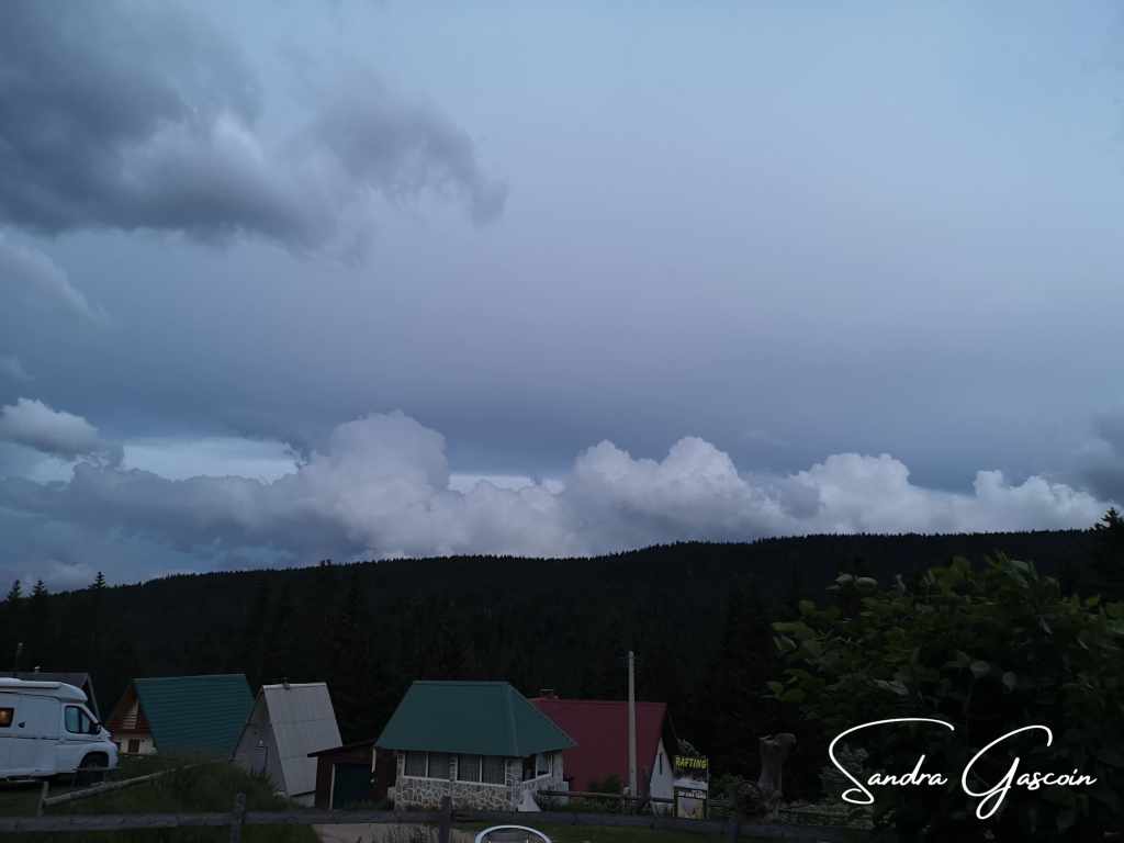 Le soir tombe sous une voûte grise, opaque, impénétrable. Plusieurs strates de nuages s’accumulent, présageant un orage ou une averse imminente. Vais-je trouver le repos sous ce ciel chargé d’incertitudes ?