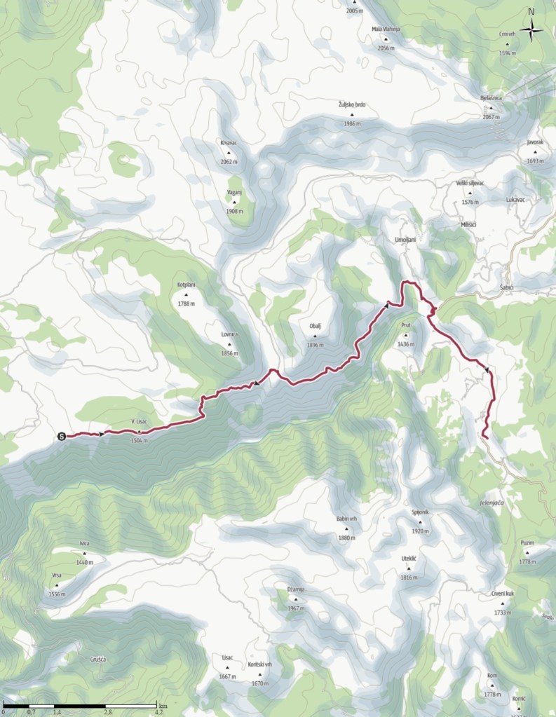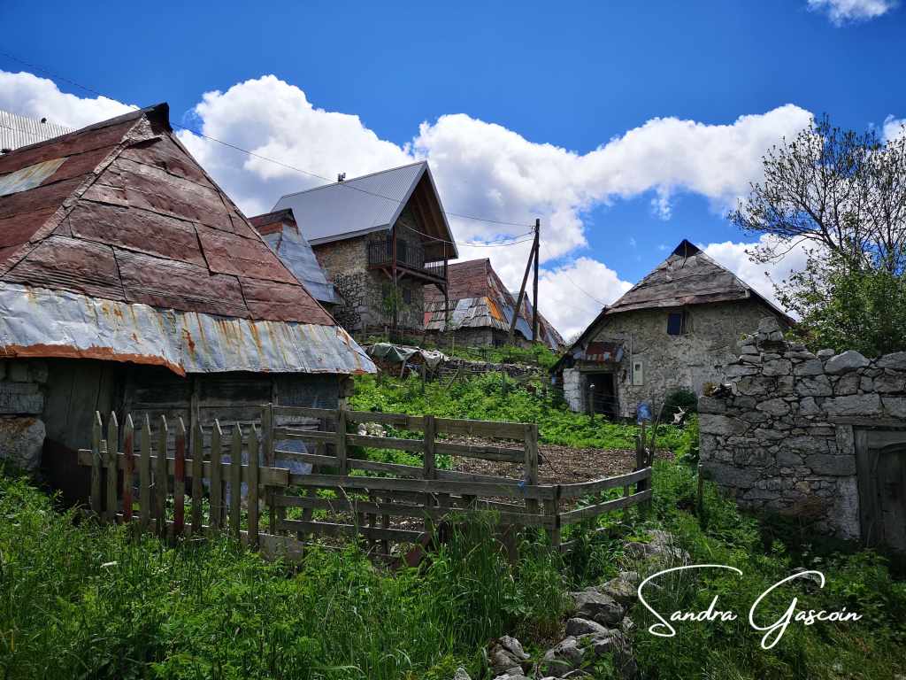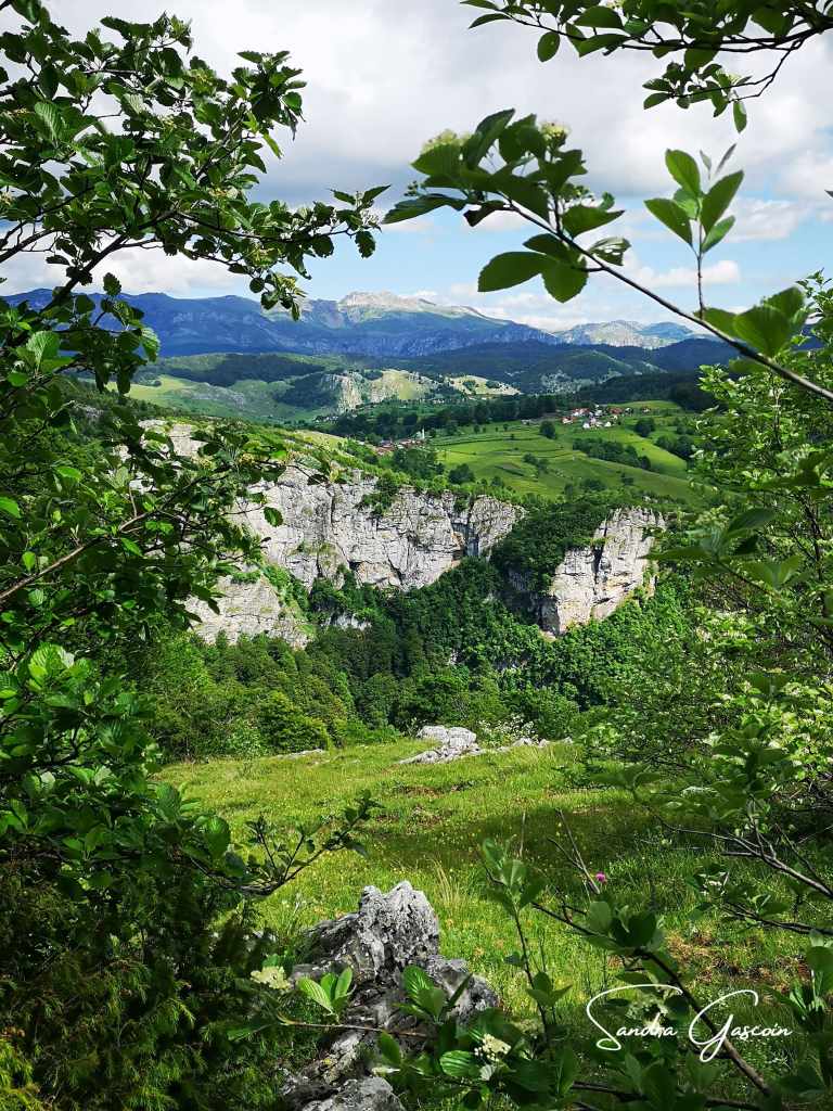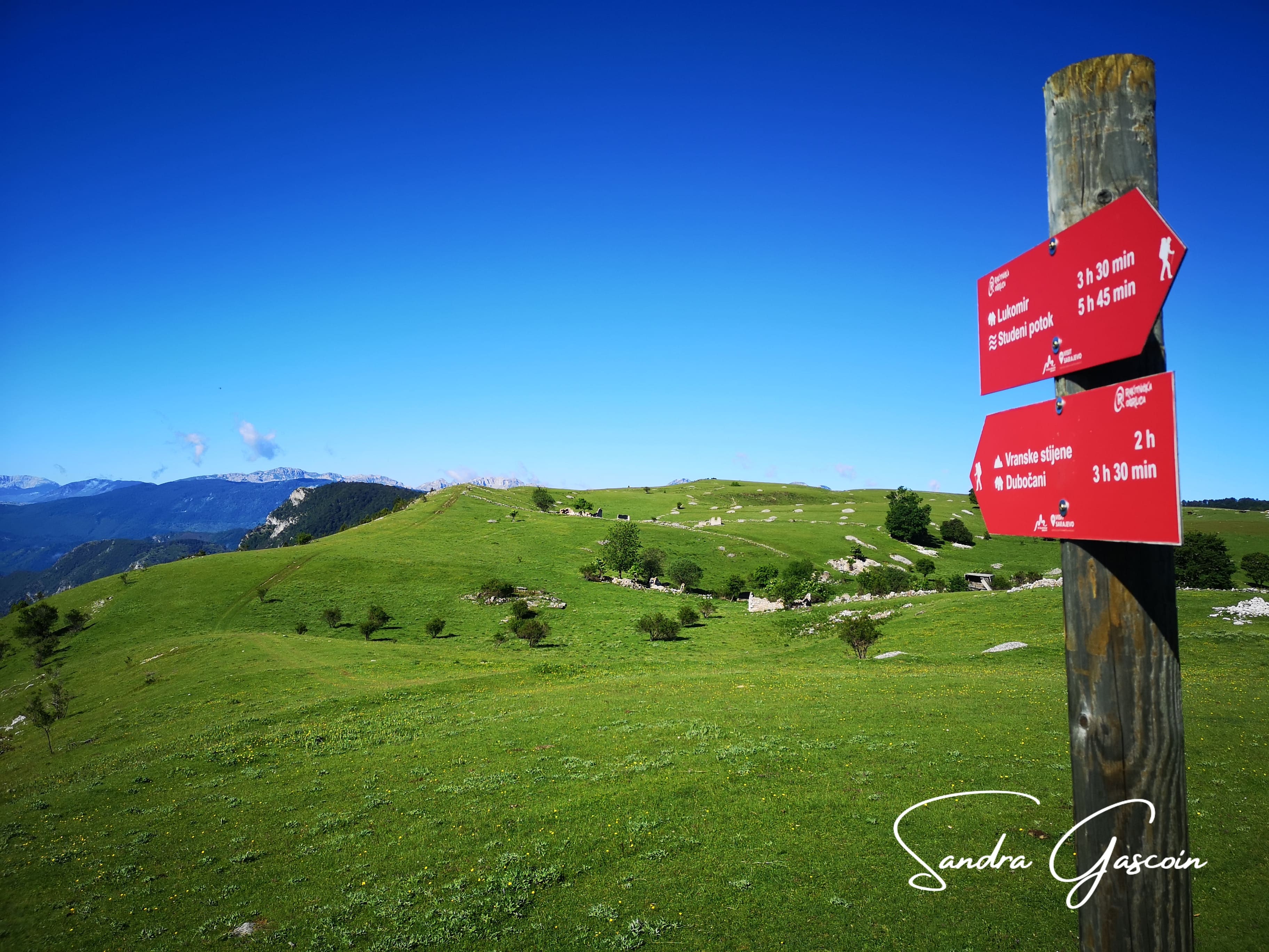 Bientôt, de petits drapeaux rouges ponctuent le sentier. C’est sûrement ceux du trail indiqué plus loin. Il s’agit d’une course de 105 kilomètres, le Vučko Trail. Pour ceux que ce défi tente, le paysage est magnifique par beau temps ! Les quarante minutes indiquées pour Lukomir se transforment en soixante par magie. Et depuis hier, aucune des indications de temps ne semble correspondre à ma réalité.