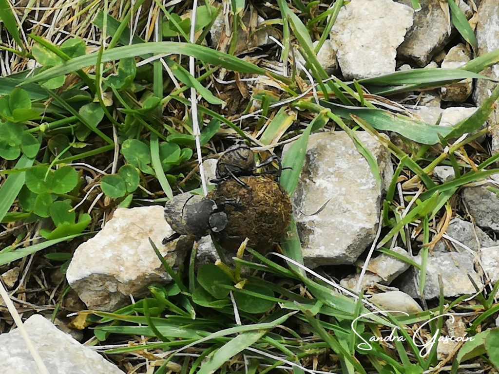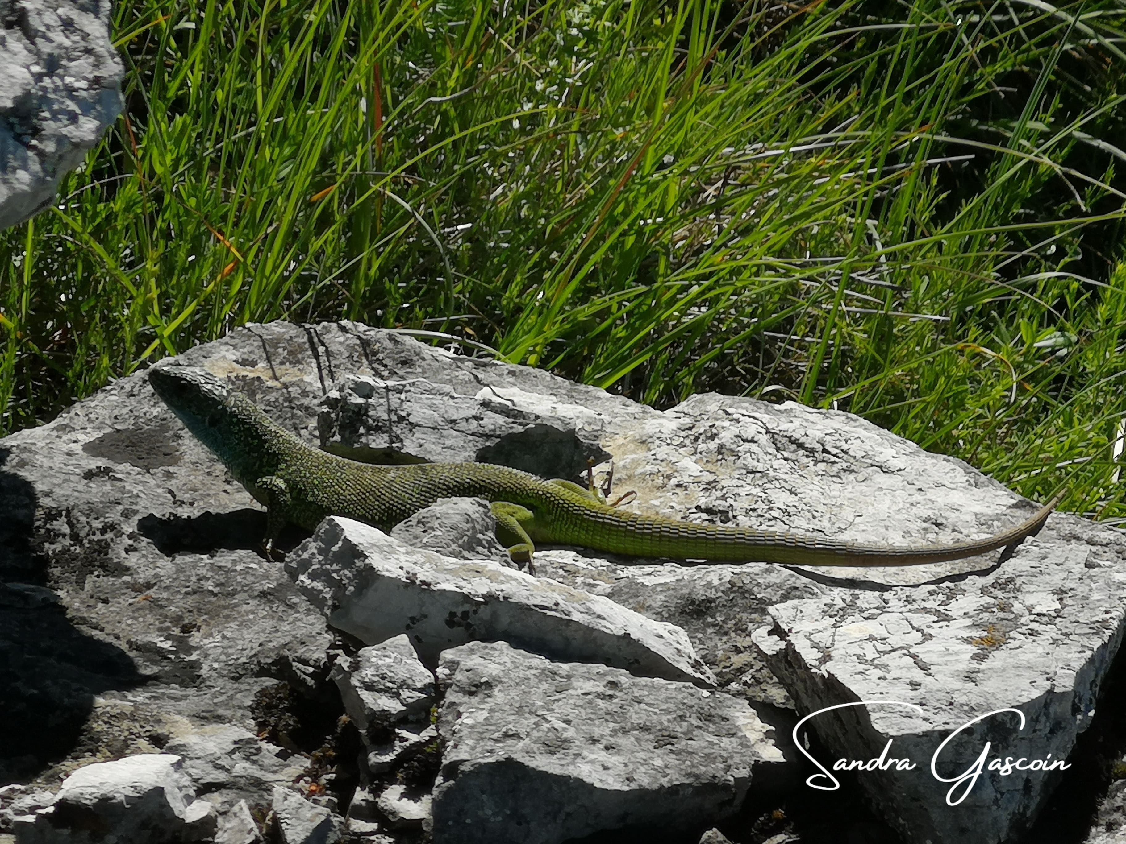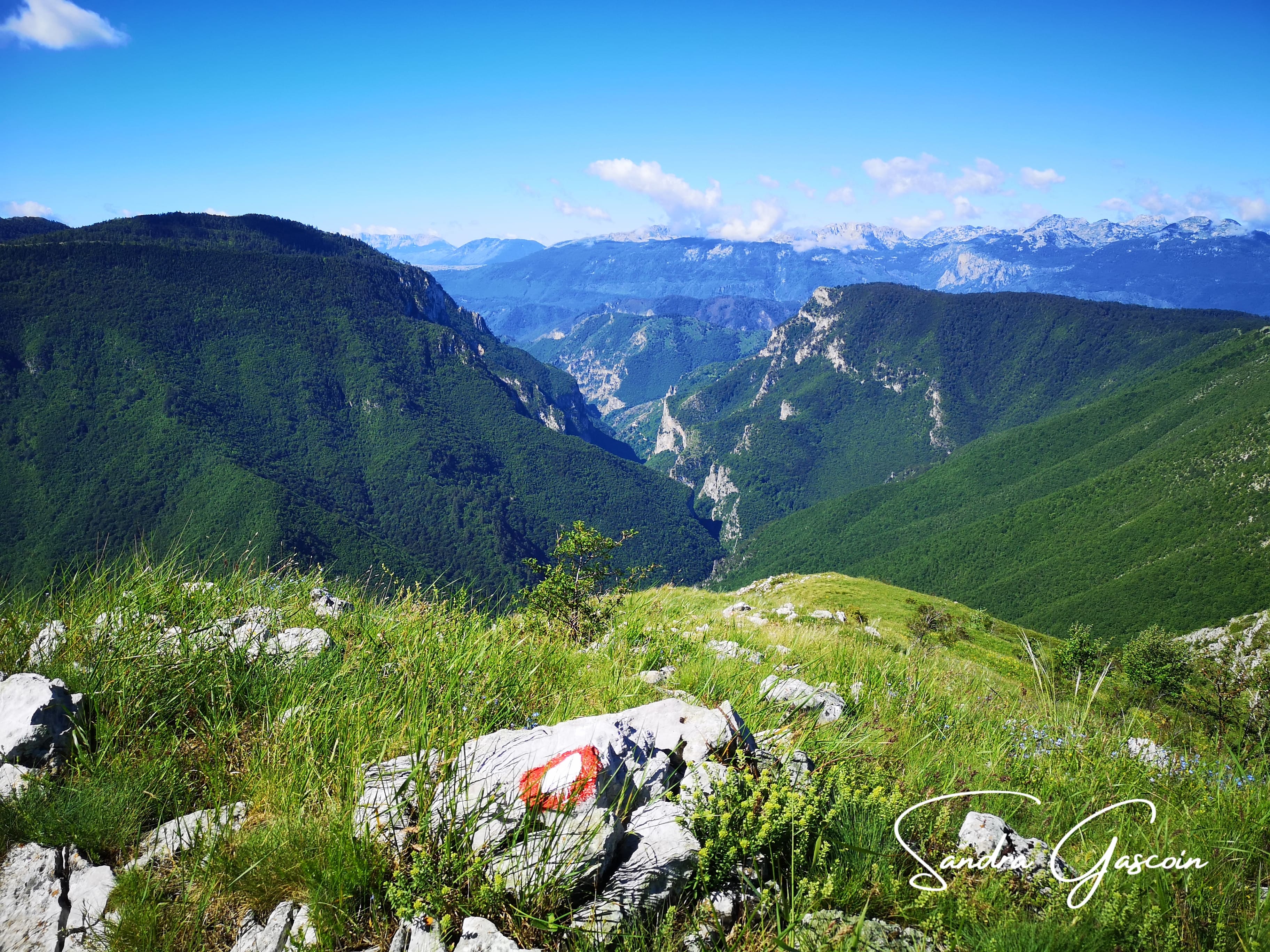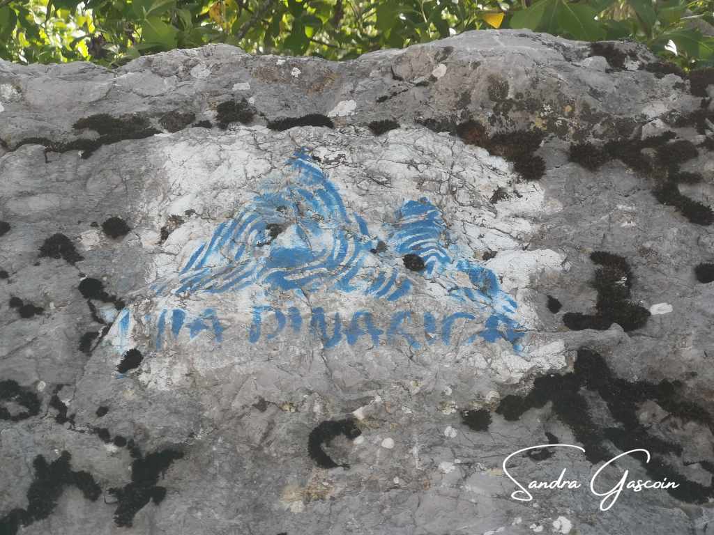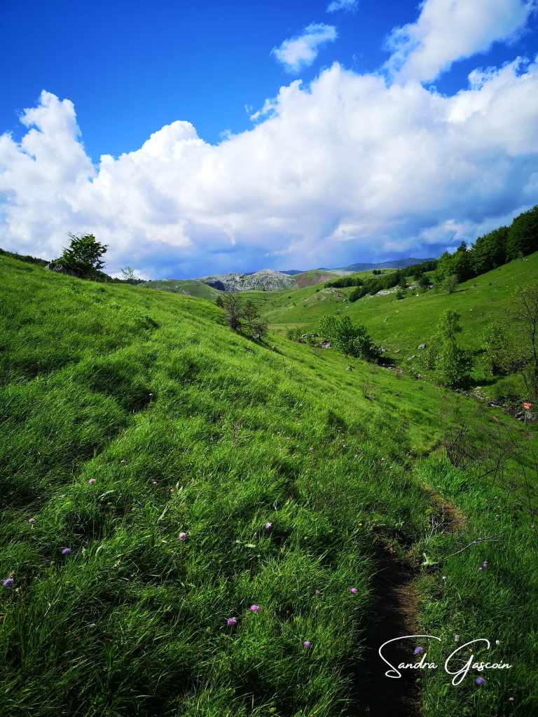 Je suis la Via Dinarica le long du ravin grâce au marquage. Au bout d’un moment, ce dernier disparaît de mon champ de vision, je navigue au pifomètre. Lorsque l’avancée devient plus ardue et plus risquée, le doute m’assaille, je consulte mon application. C’est encore raté ! Enfin pas tout à fait, j’arrive à capturer un joli lézard vert qui se dore au soleil puisque j’ai le téléphone déjà dans la main. Il ne prend la fuite que lorsque je continue ma route.