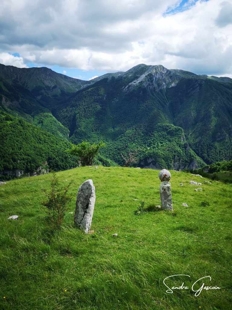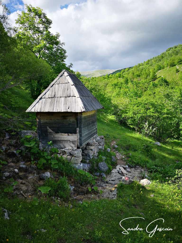 Je parviens finalement à la route. Mon application indique deux nécropoles sur mon itinéraire, et c’est devant la deuxième que j’entends des voix. Ai-je des hallucinations auditives ? Deux silhouettes bien chargées émergent du site : ce sont deux randonneurs polonais, eux aussi sur la Via Dinarica. En deux jours, je n’aurais cessé de croiser du monde ! Ils me conseillent un refuge sur le Mont Vito ; à en juger par les photos, il semble superbe. Malheureusement, au niveau du timing, je ne pourrais pas y dormir à moins de faire une petite journée de marche. Au niveau du ravitaillement, cela risque d’être trop juste. Je le garde en tête. On s’échange notre Instagram, je pourrais y voir leurs photos. Et chez moi, ils ne verront rien puisque je n’ai encore rien posté, faute d’internet régulier et de motivation. Je retire un renseignement essentiel de cette brève conversation : je vais trouver des fontaines et des sources assez facilement en Bosnie sur le reste de mon chemin. C’est une excellente nouvelle ! Effectivement quelques kilomètres plus loin, je découvre une belle fontaine avec un bac de collecte en pierres, un banc en bois. Deux lézards se chamaillent sur le muret au-dessus du robinet, l’un d’eux tombe et me fait sursauter alors que j’étais en train de remplir mes bouteilles.