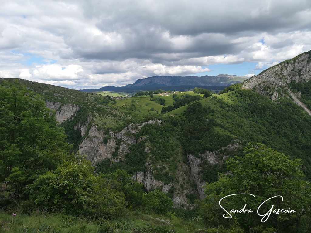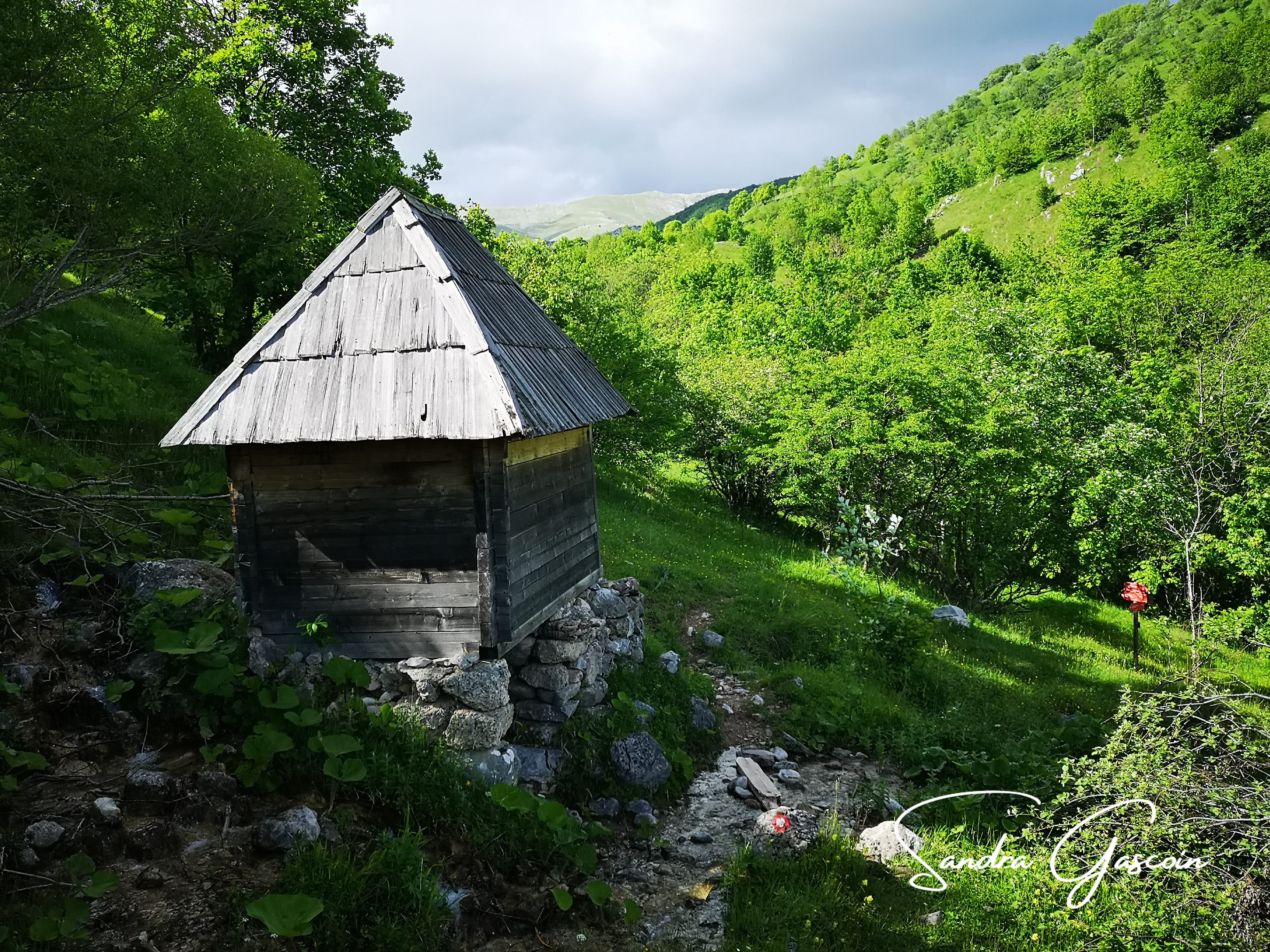 Je passe l’échoppe des vêtements (probablement bien chauds, je suis tentée) produits avec la laine des moutons locaux, le cimetière musulman et me voici lancée sur un sentier en pente. La vue sur la falaise opposée est fascinante, mais déjà, les nuages s’amoncellent méchamment au-dessus de cette idylle. Quelques randonneurs me précèdent, ils ont l’air sportifs, ils sont remontés du ravin. Le sentier se transforme sur un versant couvert par la forêt en patinoire de boue. L’équilibre est de mise, je suis ralentie et je perds de vue les randonneurs. J’arrive bientôt à la route asphaltée. Il me faut descendre le long d’un ru au-dessus duquel sont construites des cabanes en bois sur pilotis. Il me semble que ce sont des refuges pour les randonneurs. Deux sont ouverts, les autres cadenassés. Il est encore trop tôt pour terminer ma journée de marche. Je continue en m’égarant joyeusement dans les hautes herbes.