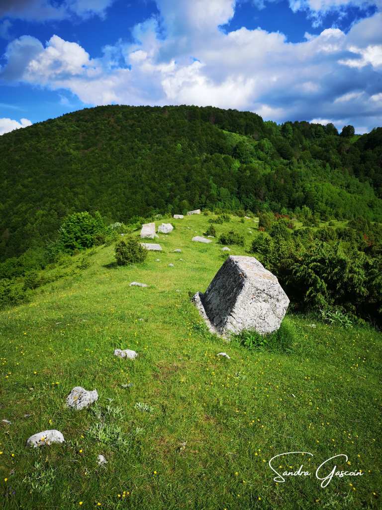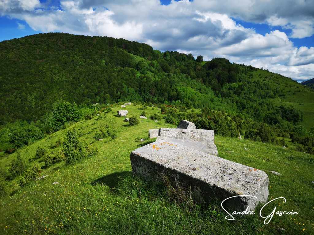 Le site archéologique de la nécropole d’Umoljani se compose de 47 stécci, des tombes médiévales monumentales en pierre, gravées de motifs divers. Les stécci se rencontrent en Bosnie-Herzégovine, en Serbie, en Croatie et au Monténégro, parfois dans des endroits inaccessibles. Il y en aurait 60 000 rien qu’en Bosnie-Herzégovine. Wikipedia en sait plus que moi et explique que ces tombes sont apparues au XIIème siècle, pour disparaitre sous l’occupation ottomane, après une apogée entre le XIVème et XVème siècle. Vingt-huit nécropoles sont inscrites depuis 2016 au patrimoine mondial de l’Unesco, vingt-deux se trouvent dans le pays. Quelques jours plus tard, je rencontre un couple canado-bosniaque en vadrouille à travers le pays natal de Dan pour randonner et explorer ces nécropoles médiévales.