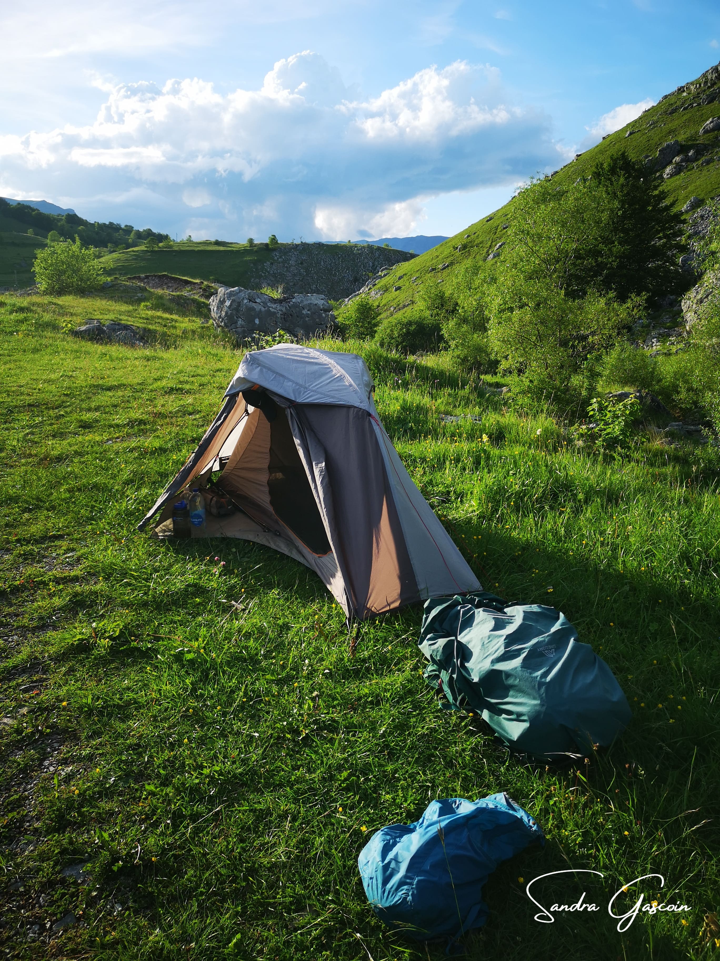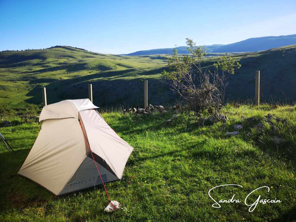 Il est temps de faire une pause à l’auberge du village. La terrasse est prisée : des motards, des randonneurs ou des voyageurs en camping-car, majoritairement germanophones. Je m’installe au soleil, arrache mes chaussettes mouillées et les étends sur le dossier de ma banquette, les chaussures subissent le même sort : séchage au soleil. Je me commande d’abord un soda puis une assiette de quelque chose avec du fromage. Le restaurateur m’apporte une assiette composée de différentes sortes de fromages et de charcuteries avec du pain. Je me force à manger la charcuterie que je n’avais pas commandée, cela apportera toujours quelque chose dans mon alimentation habituellement assez pauvre. Les produits sont locaux, en provenance de Lukomir, un village perdu au cœur de la nature. À la fin du repas, je profite des toilettes pour me laver le visage et les dents, ça ne peut pas faire de mal. Lorsque je règle l’addition, le restaurateur, curieux, me demande d’où je viens. Il est heureux que je sois Française et me parle français. Il déplore de n’avoir que des touristes germanophones ou anglophones, et aimerait tant pouvoir converser en français. Il me propose de passer la nuit ici. Je décline poliment, préférant la tranquillité de ma tente. Avec tous les autres quand je peux être peinarde sous ma tente toute seule ? Non merci. Je paie et le remercie. Il me lance encore un « Tu es bien jolie », ce qui me pousse encore davantage à fuir cet endroit. Qui sait quelles idées pourraient lui passer par la tête en fin de soirée ?