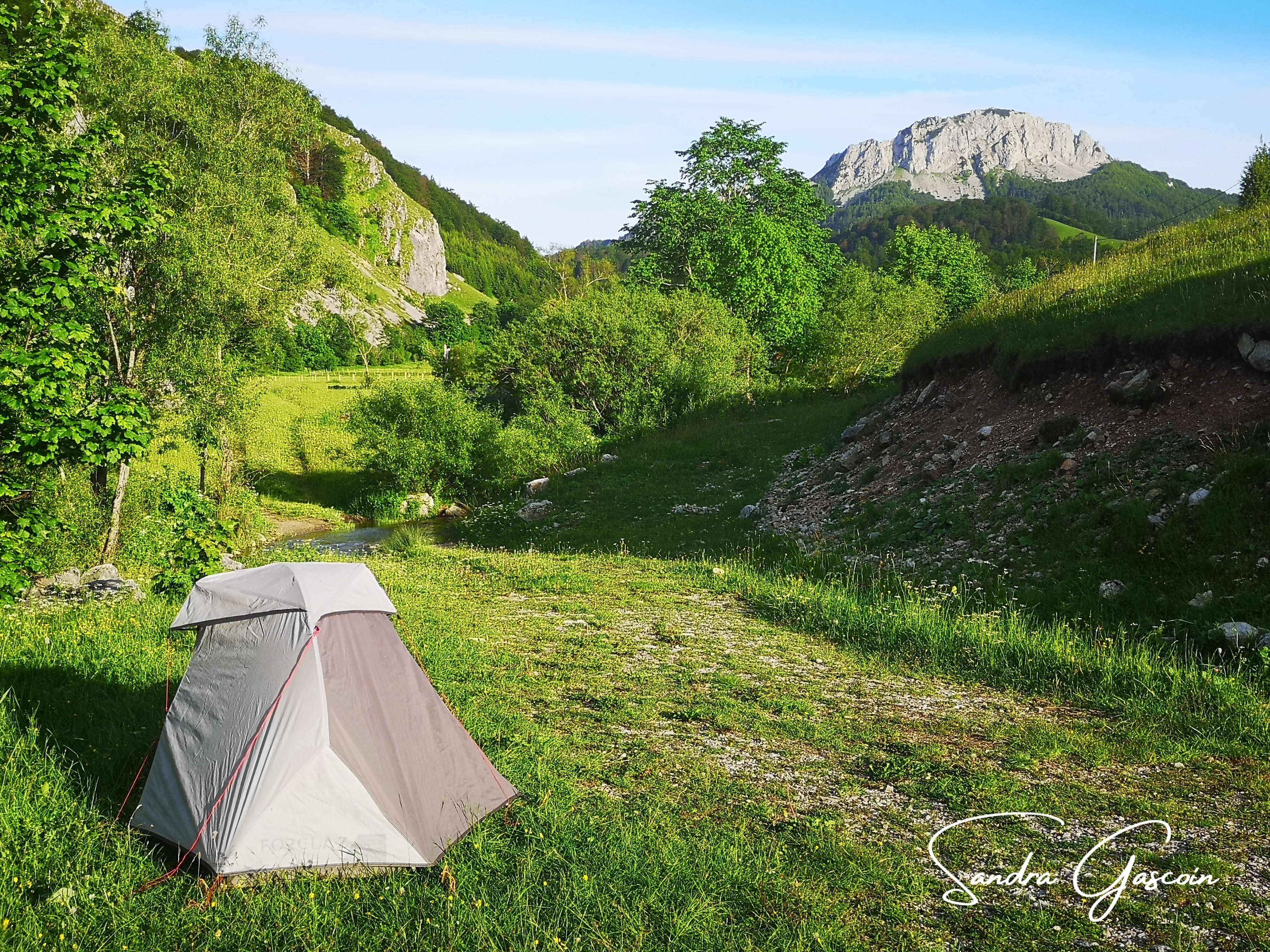 Je marche encore une heure et demie sur la route déserte. Il y a un refuge pour randonneurs, je ne sais pas s’il est ouvert. Peut-être que je peux y planter ma tente. Un gros chien occupe la cour, je n’ose pas rentrer. En fait, il reste impassible à mon passage. Je continue juste derrière, il y a un chemin qui mène vers la rivière. Je peux même profiter de l’eau glacée pour me laver un peu. Je lave une culotte et ma popote avant de préparer mon repas. Dans la nuit, j’entends des animaux à proximité, sûrement des chiens de la ferme voisine. Tant qu’ils ne s’approchent pas et ne m’importunent pas, ils peuvent venir renifler, je dors du sommeil du juste.